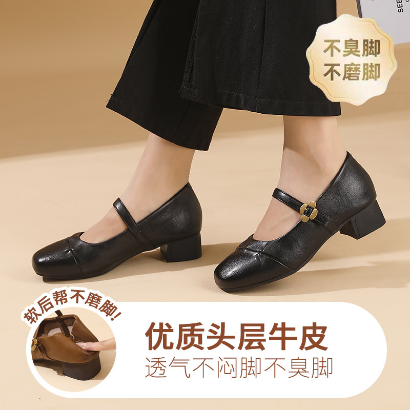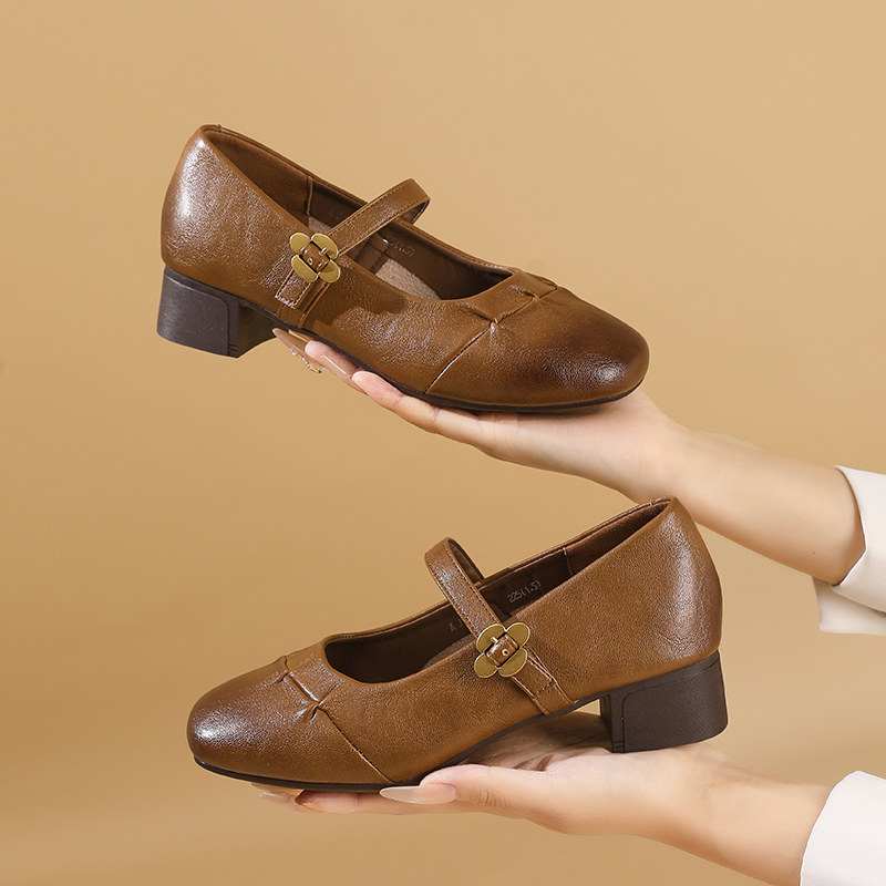 粗跟软底真皮妈妈鞋单鞋女舒适不累脚中年轻便百搭女鞋皮鞋春夏款