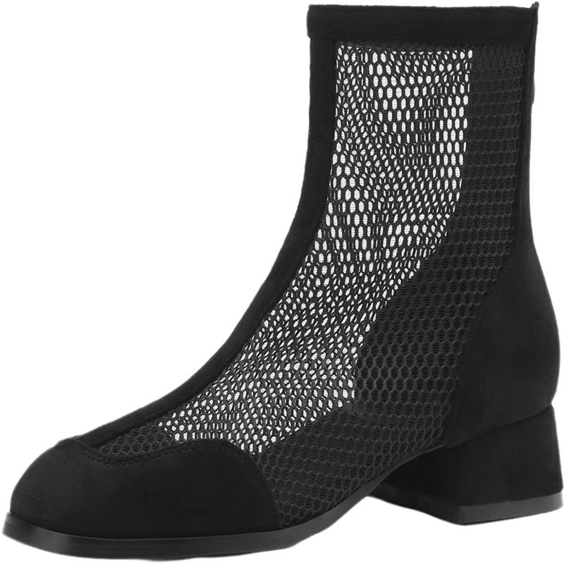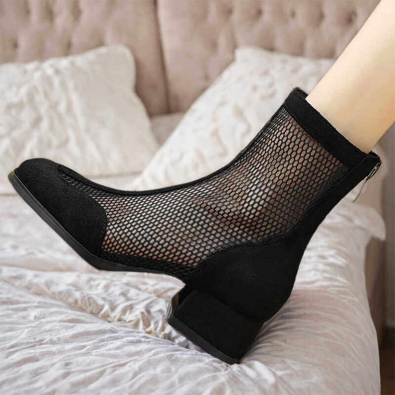 夏季网靴女鞋夏天透气短靴2024新款磨砂绒面网纱凉靴黑色镂空方头
