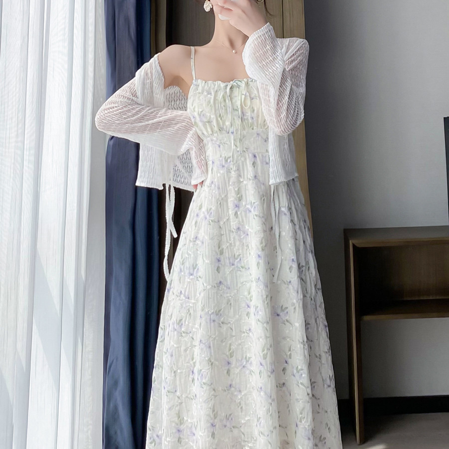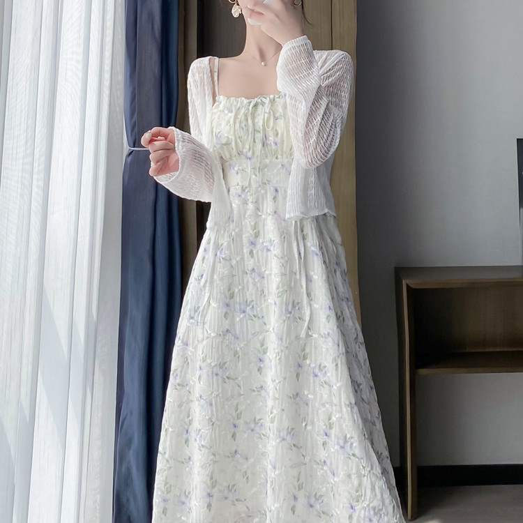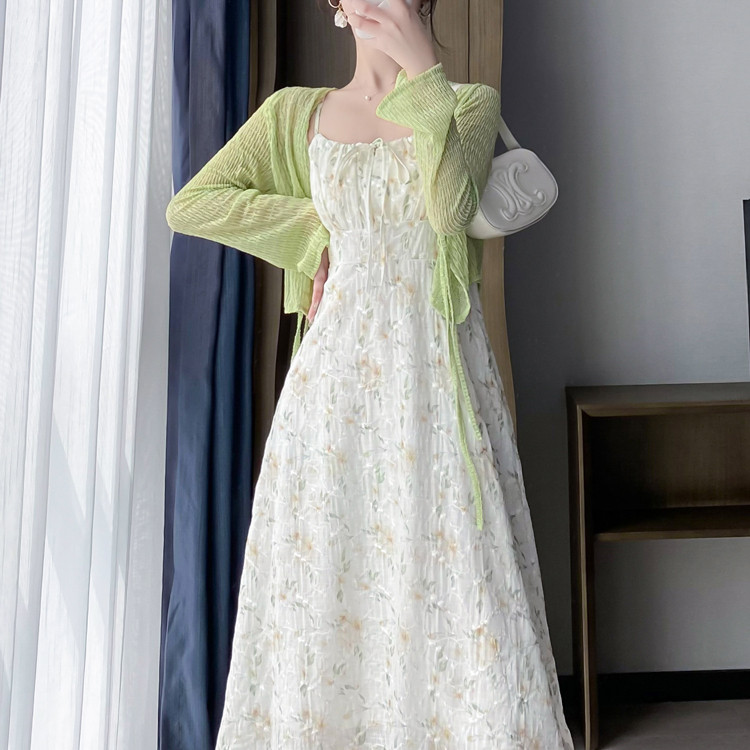碎花吊带连衣裙女夏季法式小个子长裙海边度假裙子开衫两件套装裙