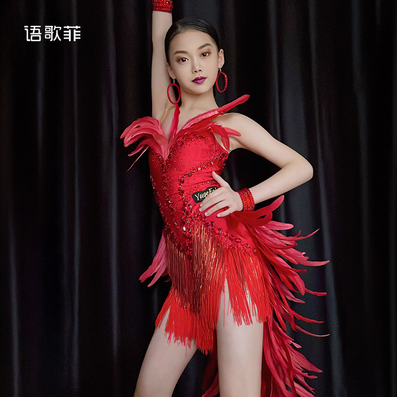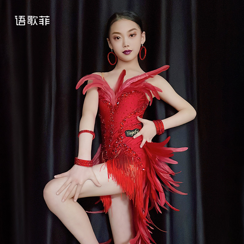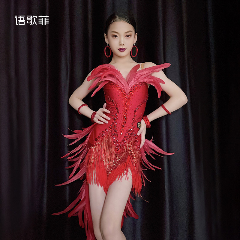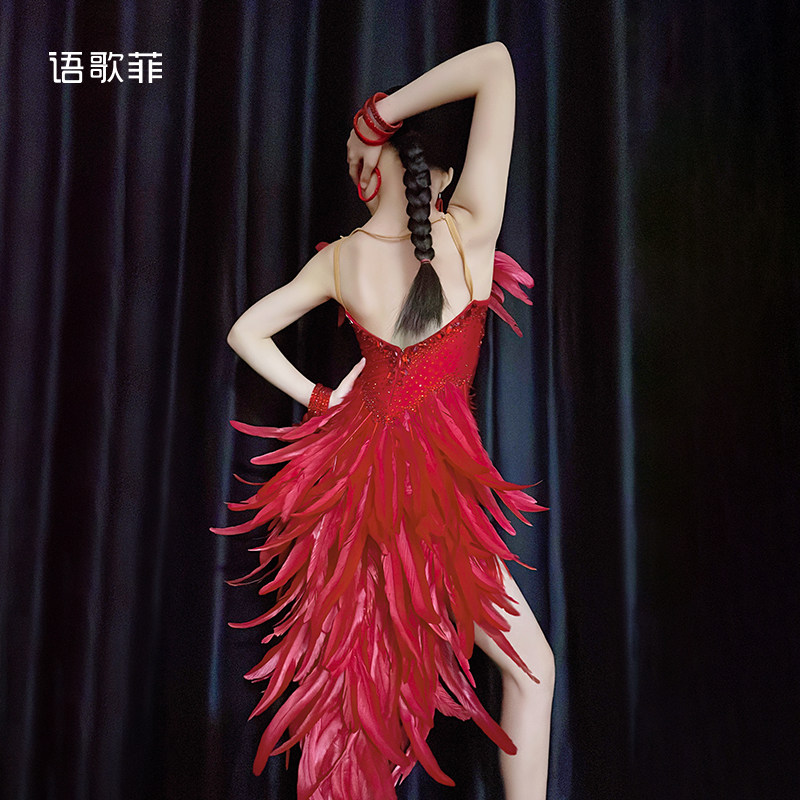 语歌菲拉丁舞花服带钻火红羽毛比赛专用艺考新款个人solo演出服女