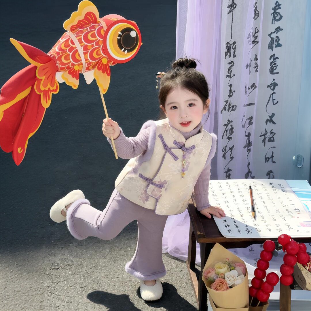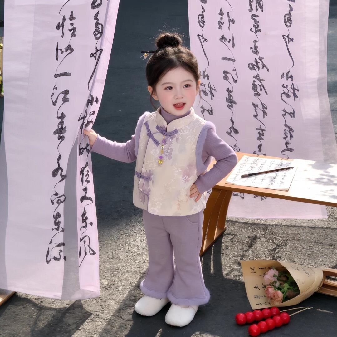 女童冬装拜年服套装2026新款宝宝紫色国风夹棉毛边马甲加绒喇叭裤