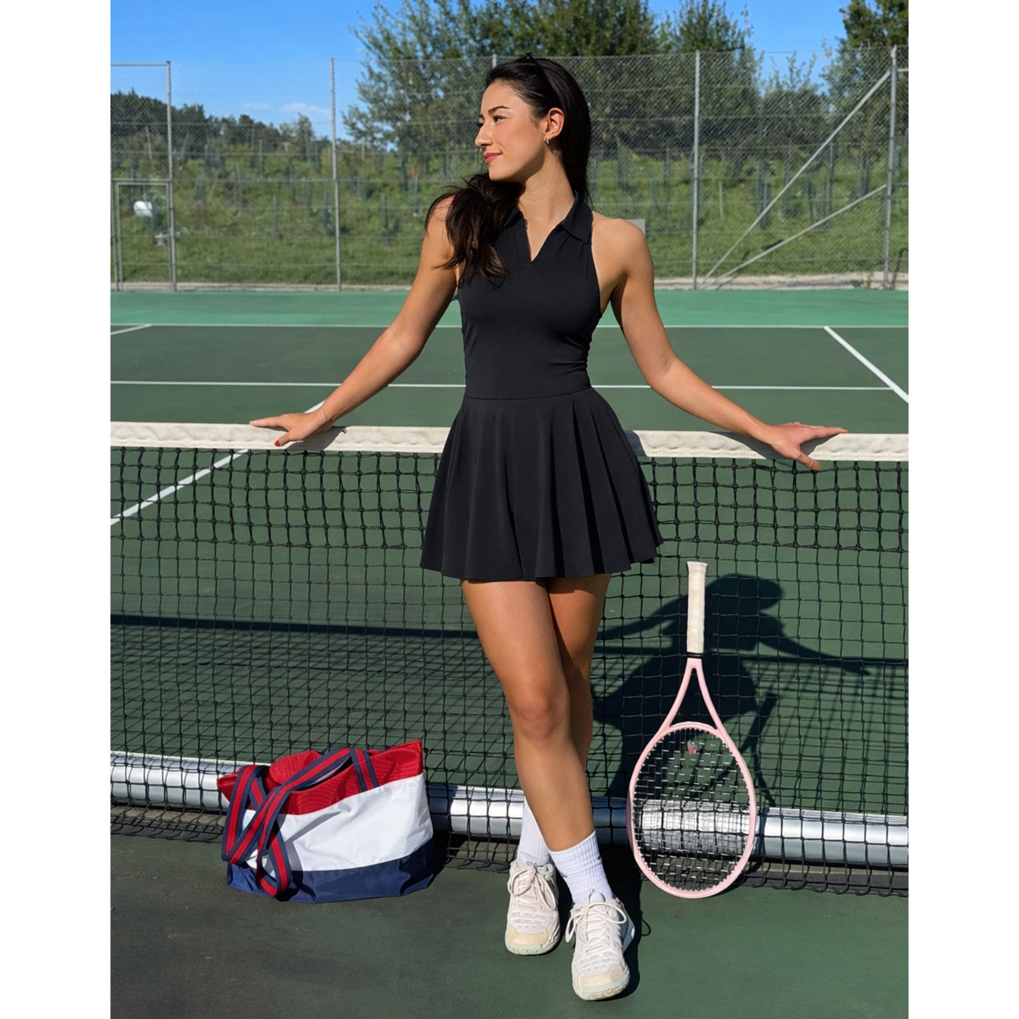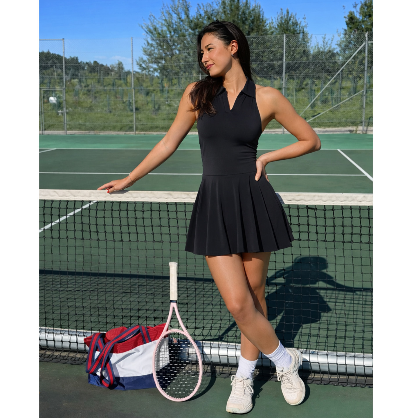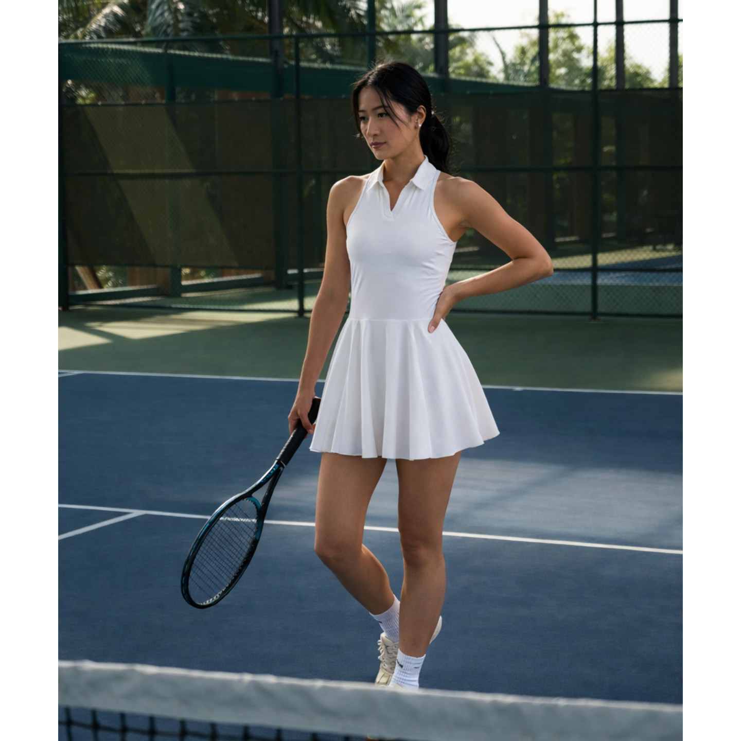 AceBase新款绝美白色速干百褶网球裙运动v领连衣裙a字收腰带胸垫