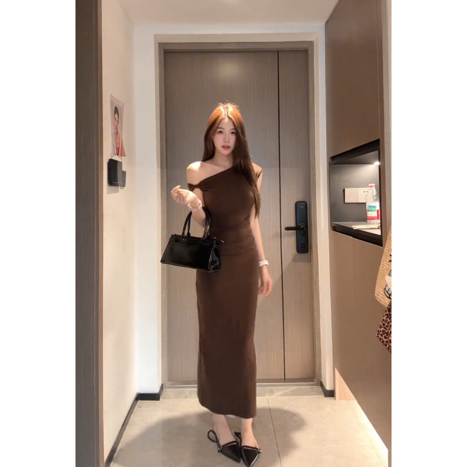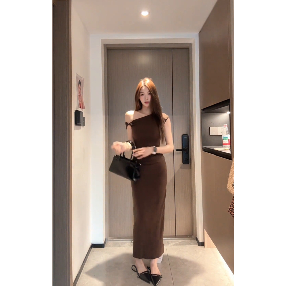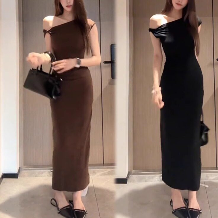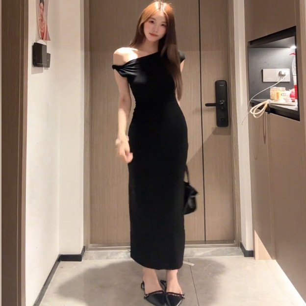 【棉高品质】一字肩设计黑色斜肩连衣裙女夏露锁骨紧身包臀长裙