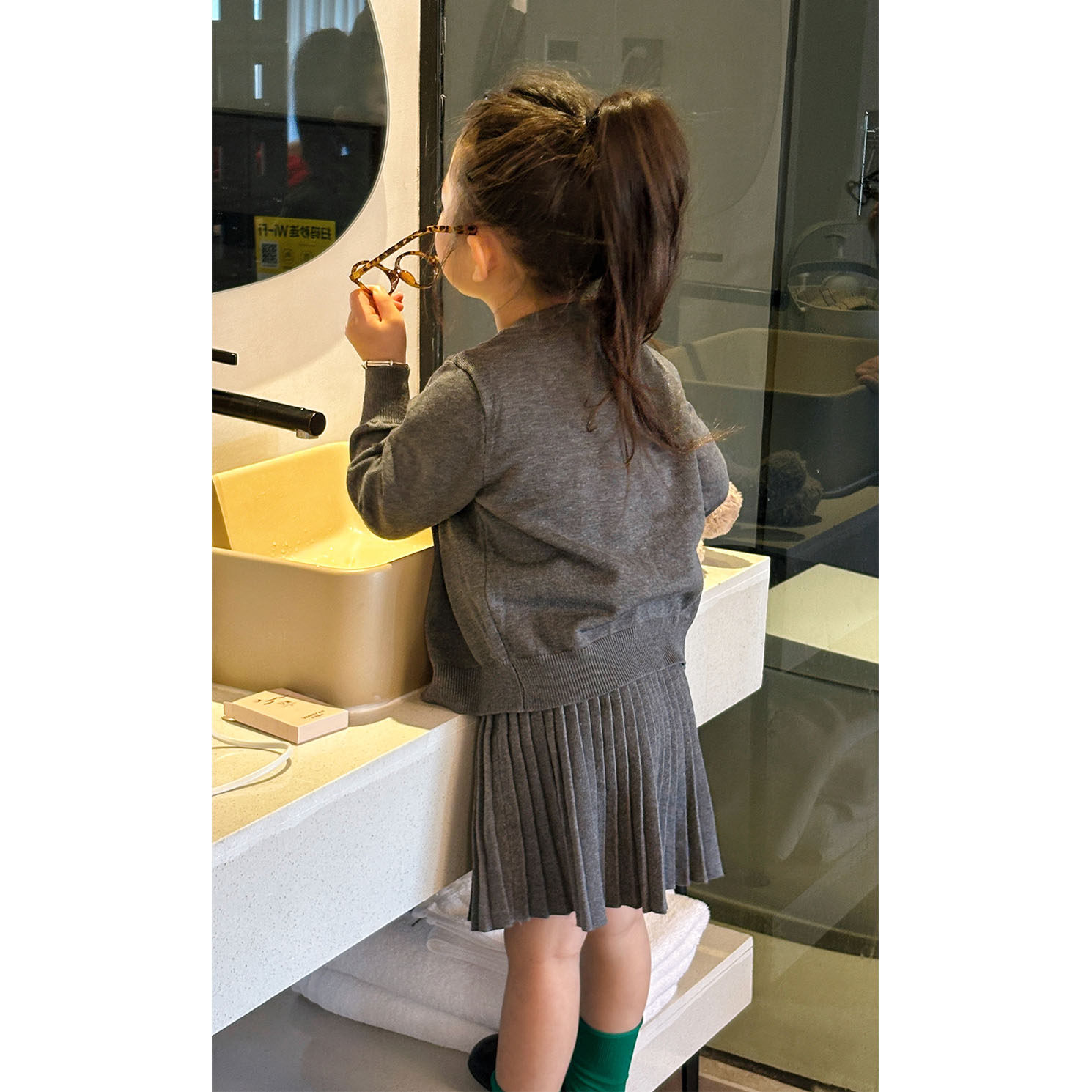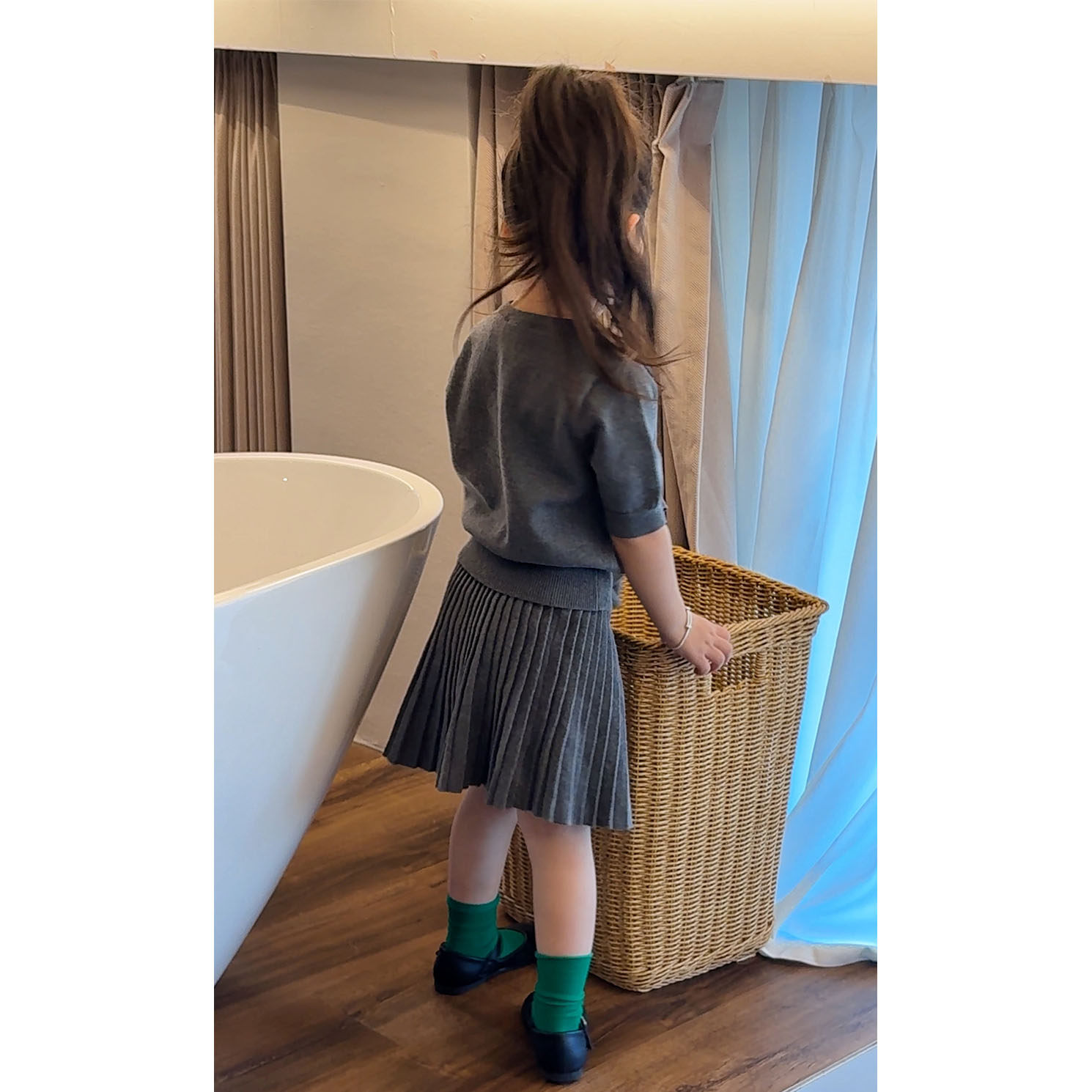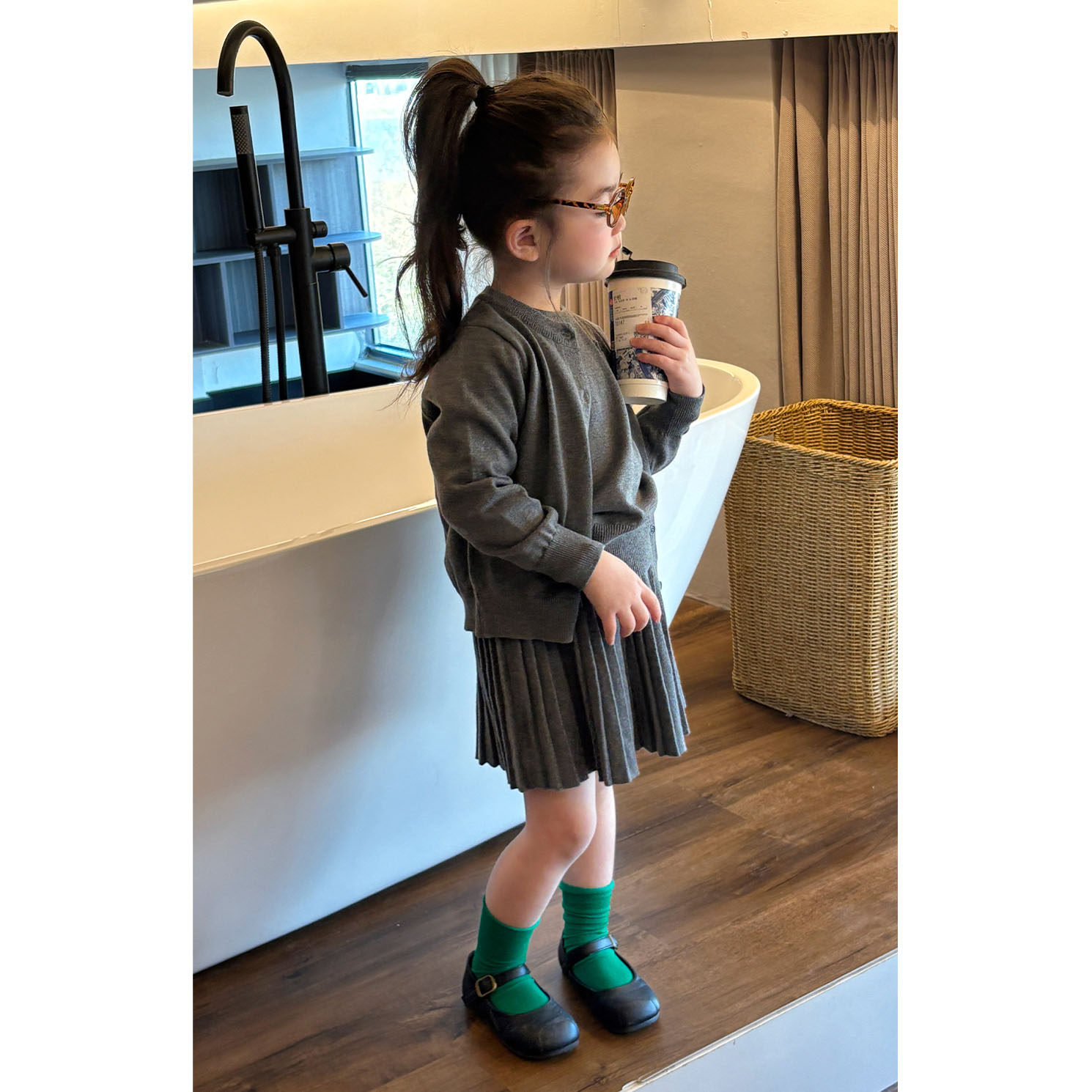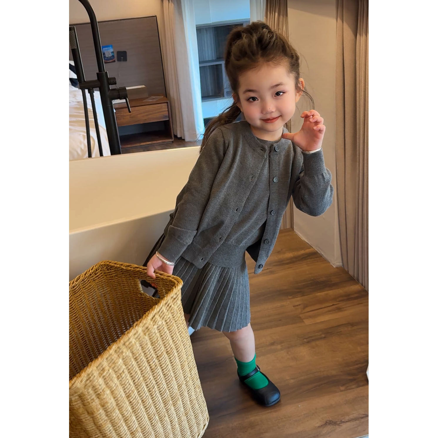 女童学院风灰色针织开衫短袖百褶裙2026儿童春季套装洋气春装外套
