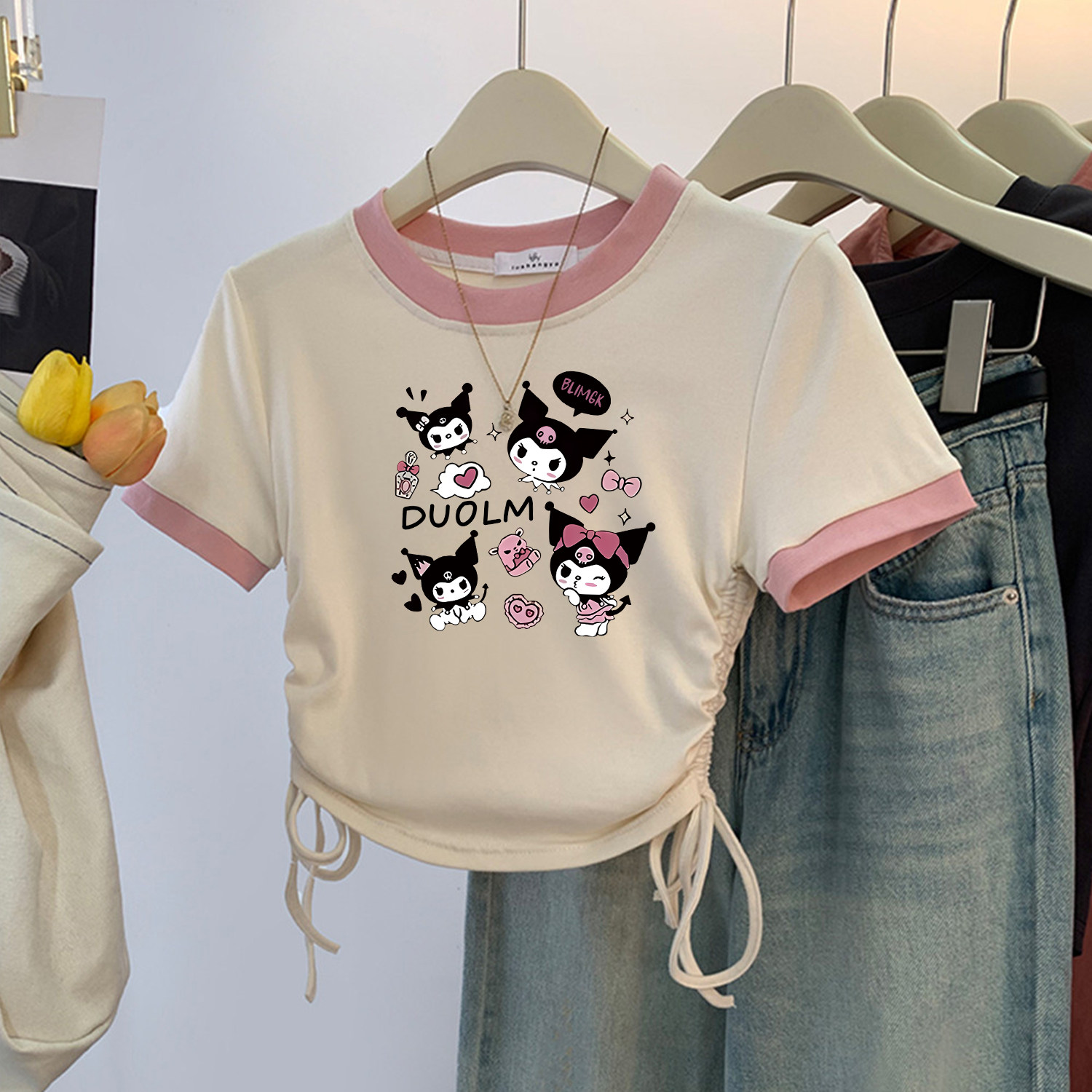 女童夏装纯棉短袖T恤夏季2026新款圆领抽绳短款设计感儿童装上衣