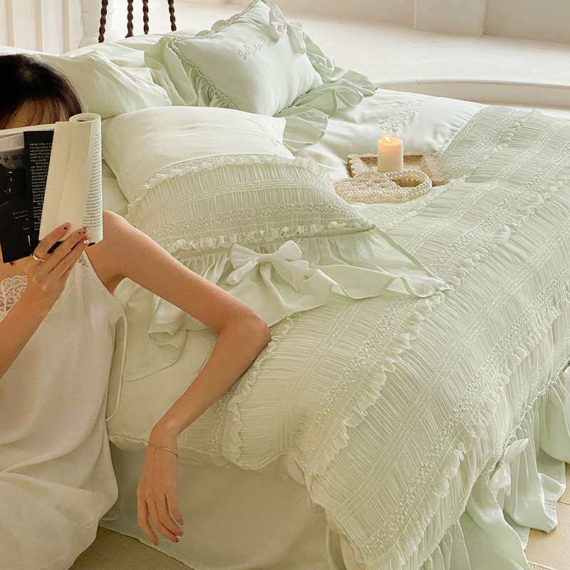 V45O春夏法式公主风80支兰精天丝四件套冰丝裸睡床上用品绿色床单