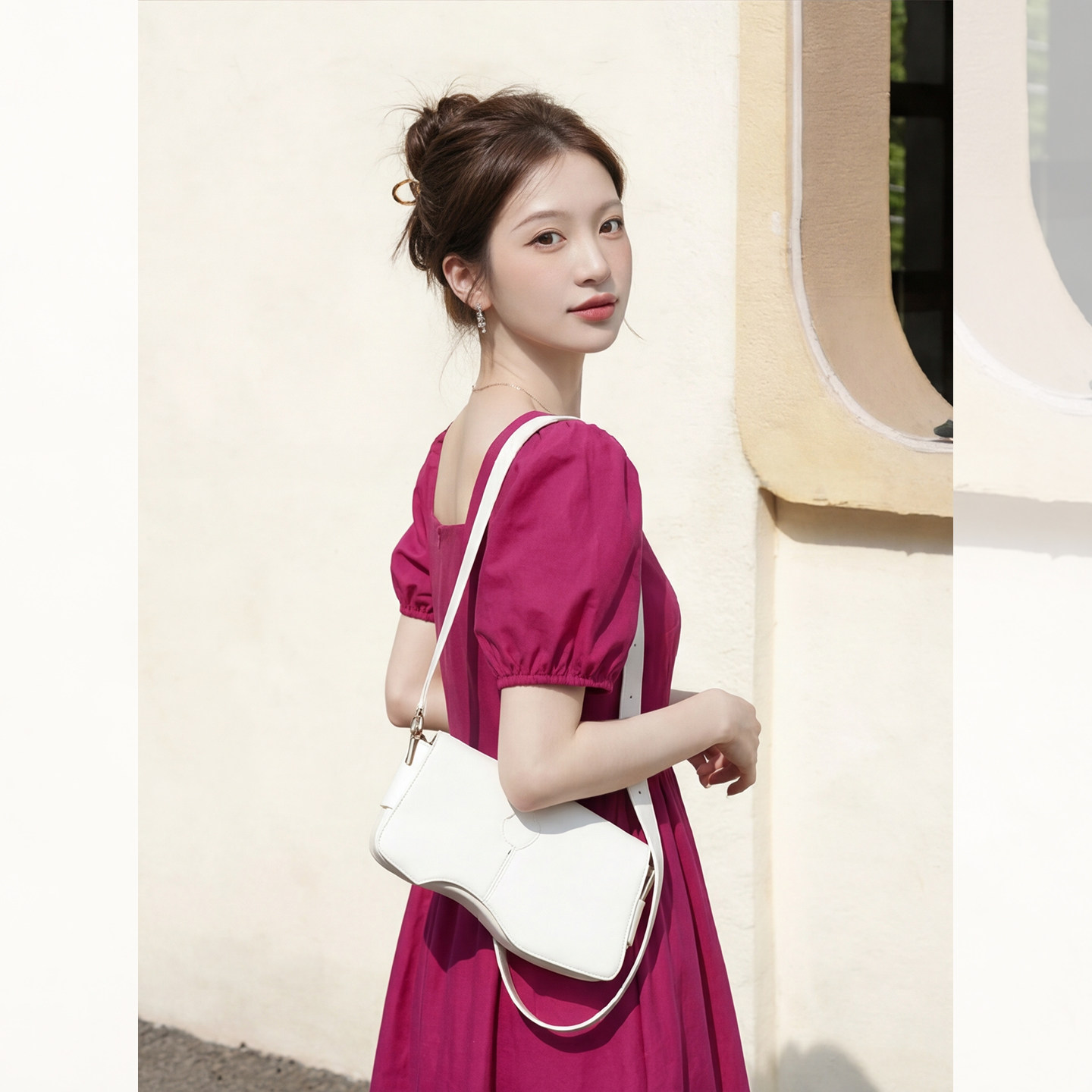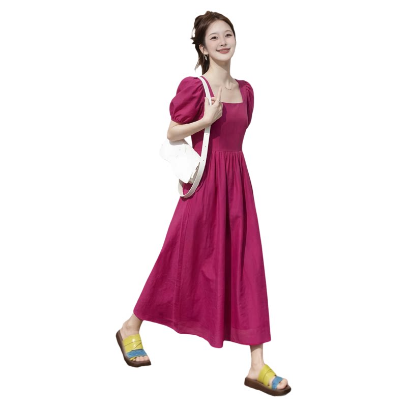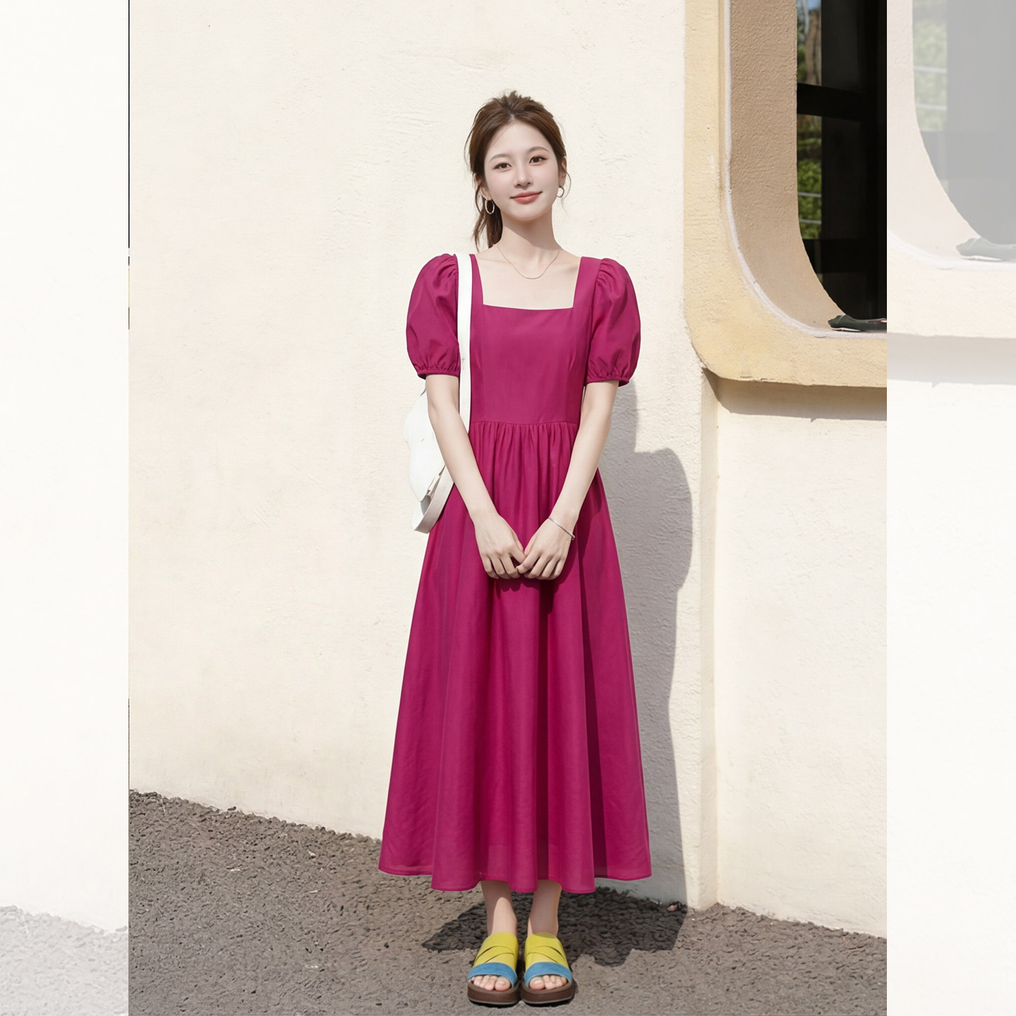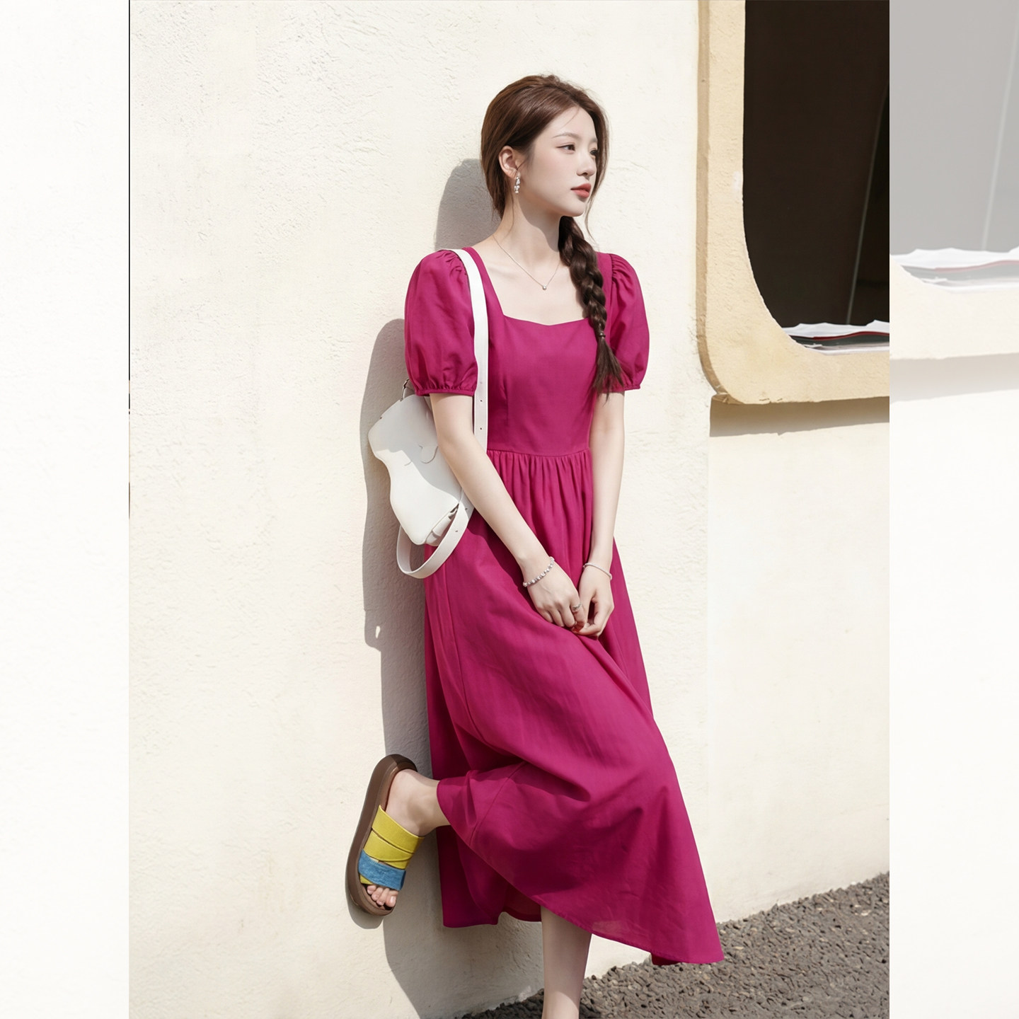 奢华2026夏季新款小个子显瘦穿搭减龄慵懒感玫红色泡泡袖连衣裙女