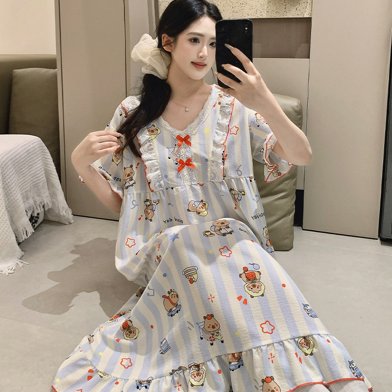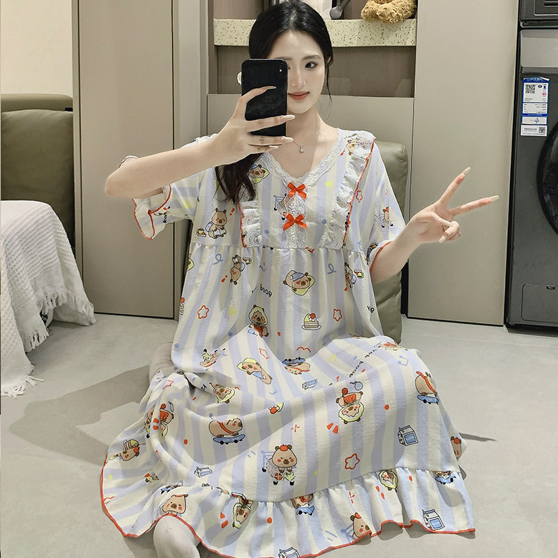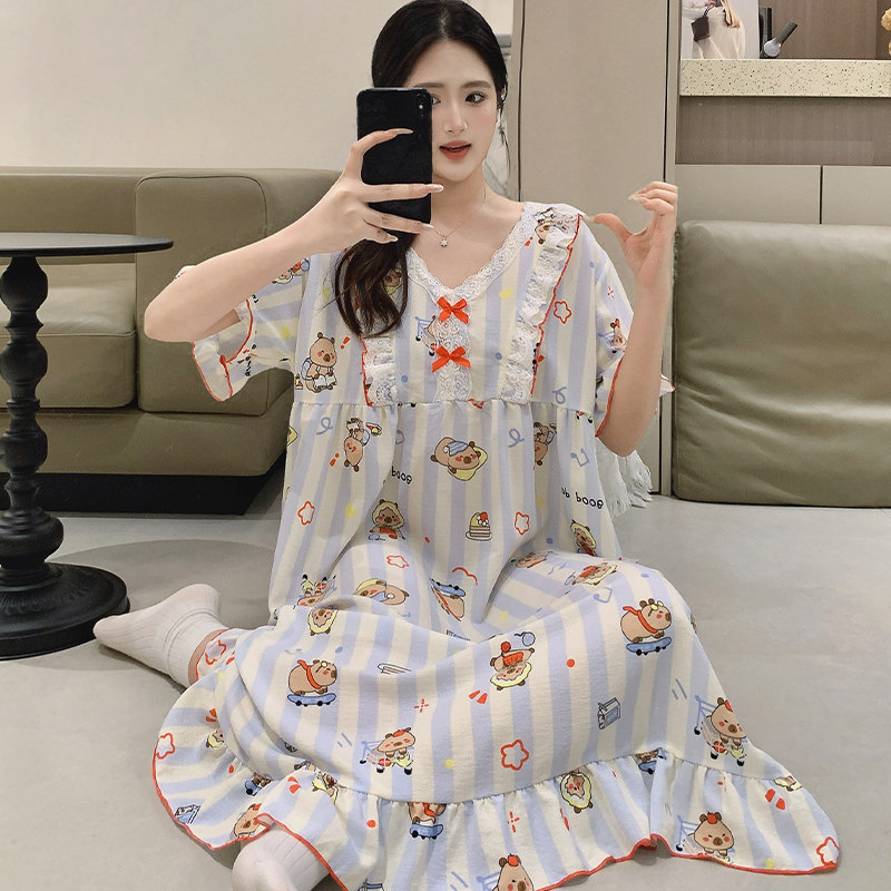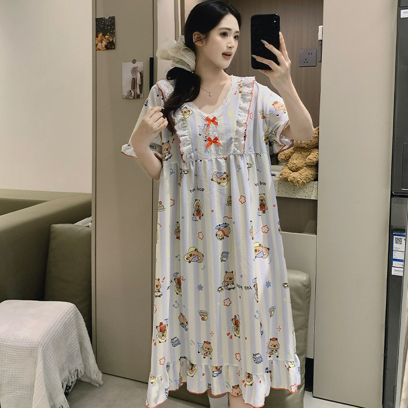 加大码睡裙女夏天卡通学生胖mm200斤长款宽公主连衣裙孕妇睡衣薄