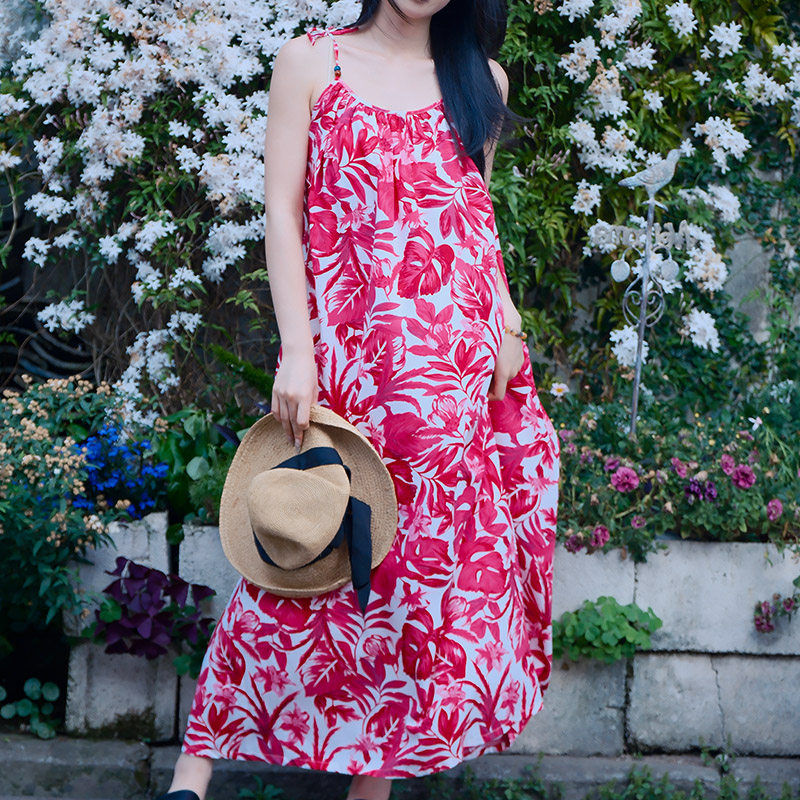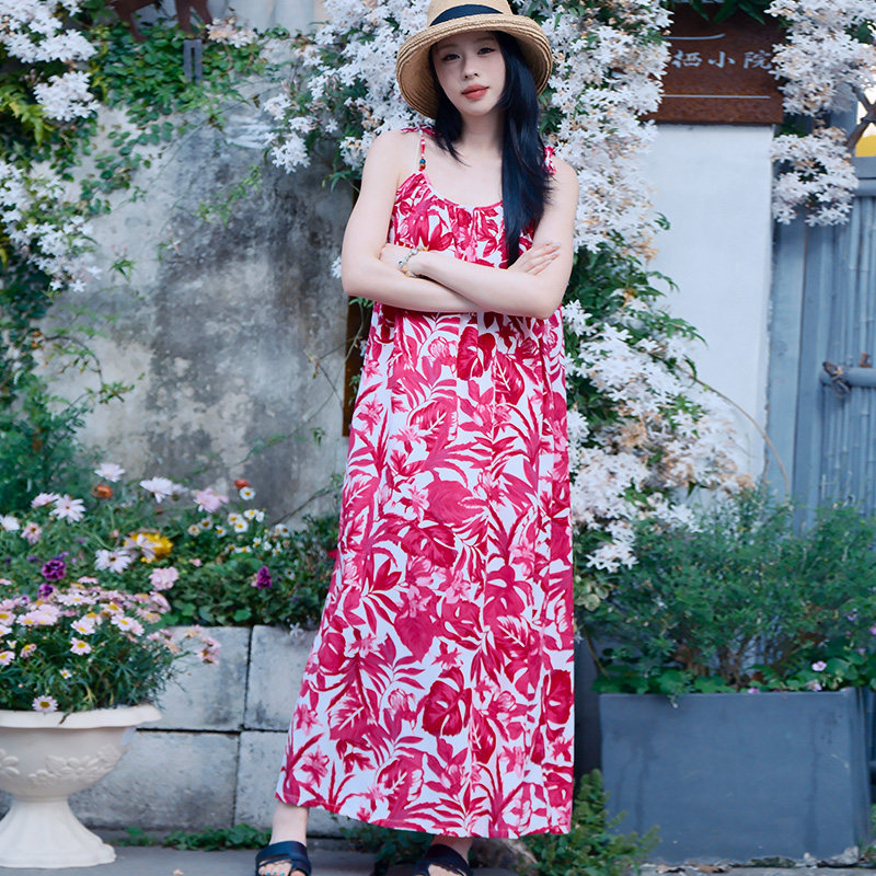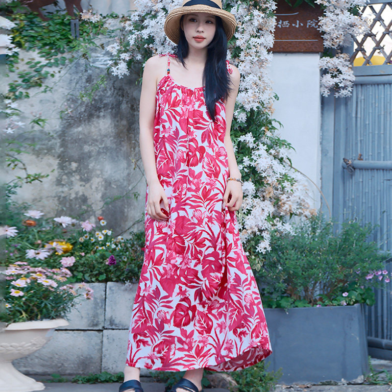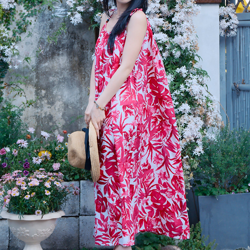 带胸垫睡裙女夏季棉绸吊带睡衣长款高级感红色家居服可外穿连衣裙