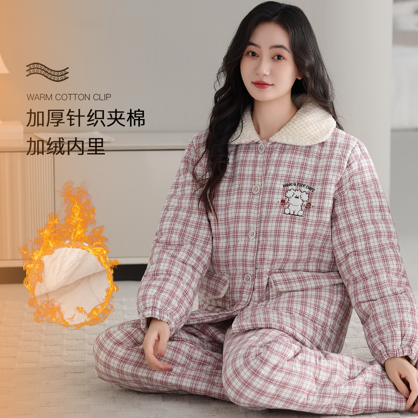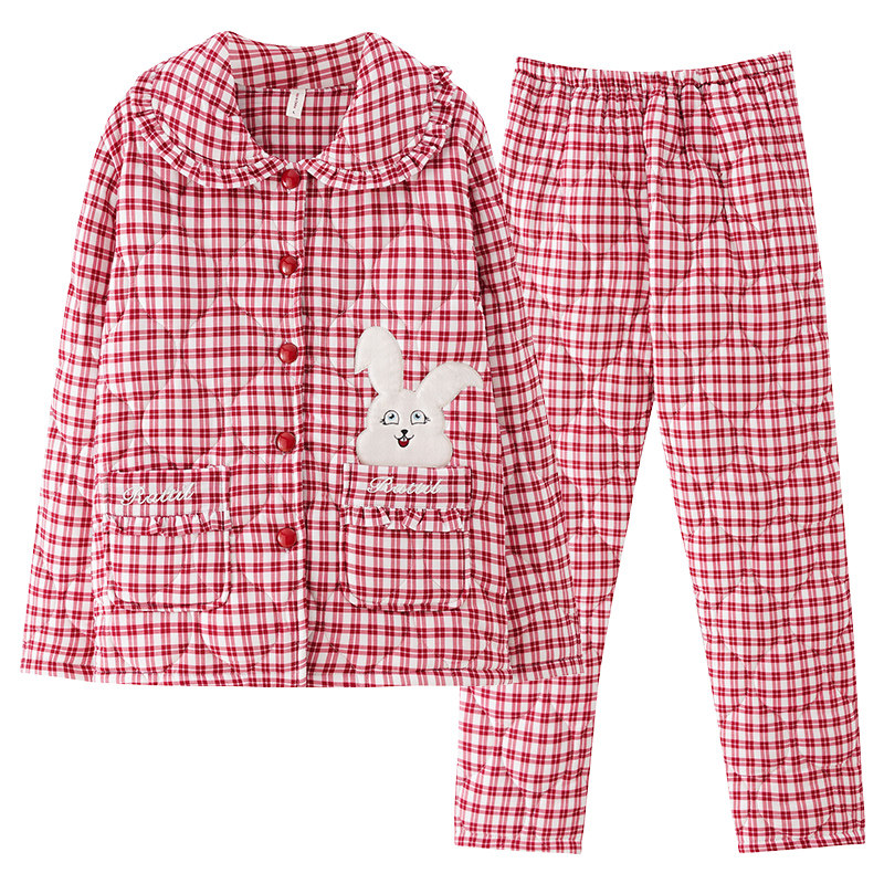 冬季夹棉睡衣女士纯棉长袖加厚棉袄保暖中老年加绒家居服两件套装