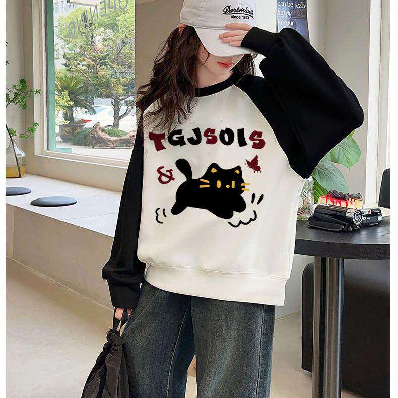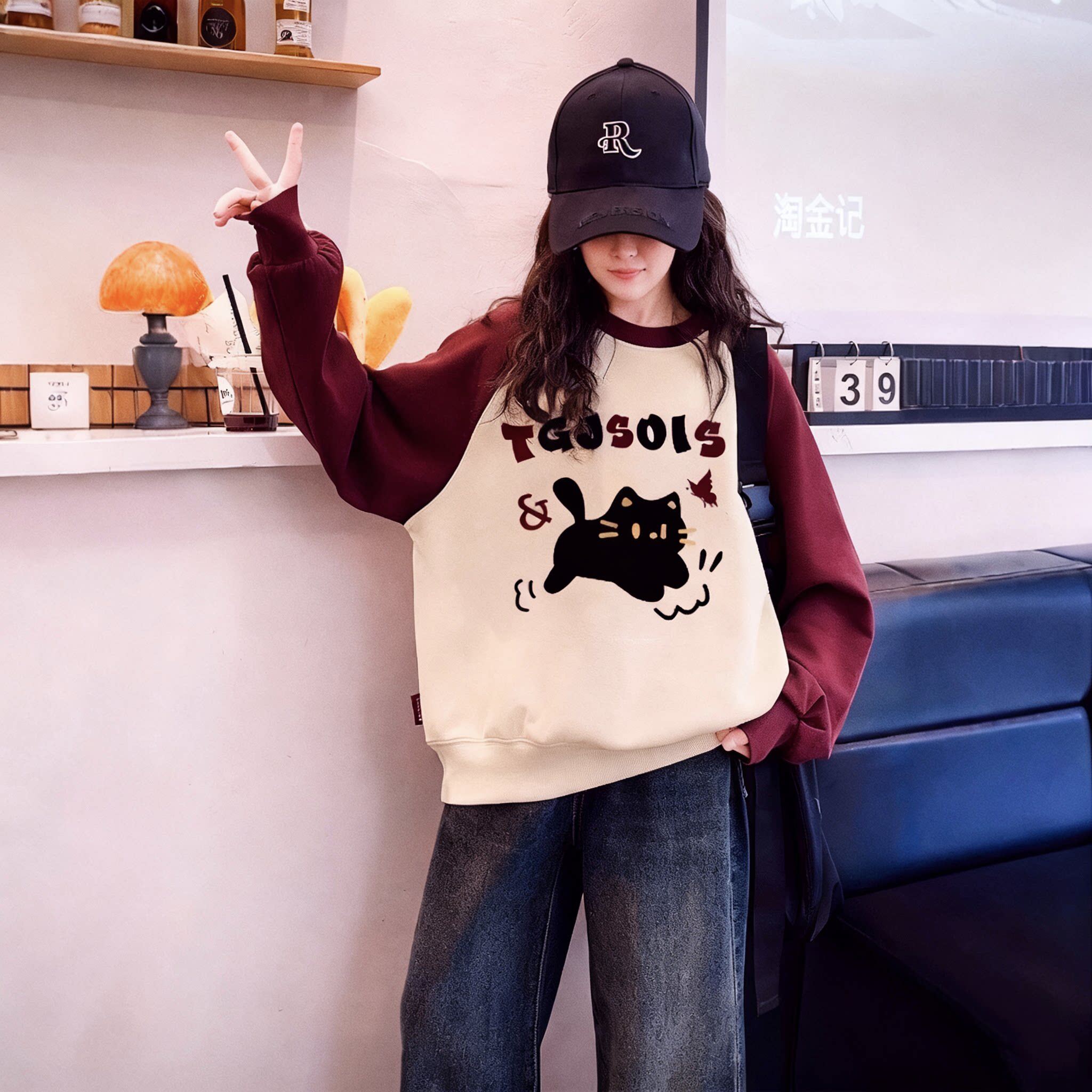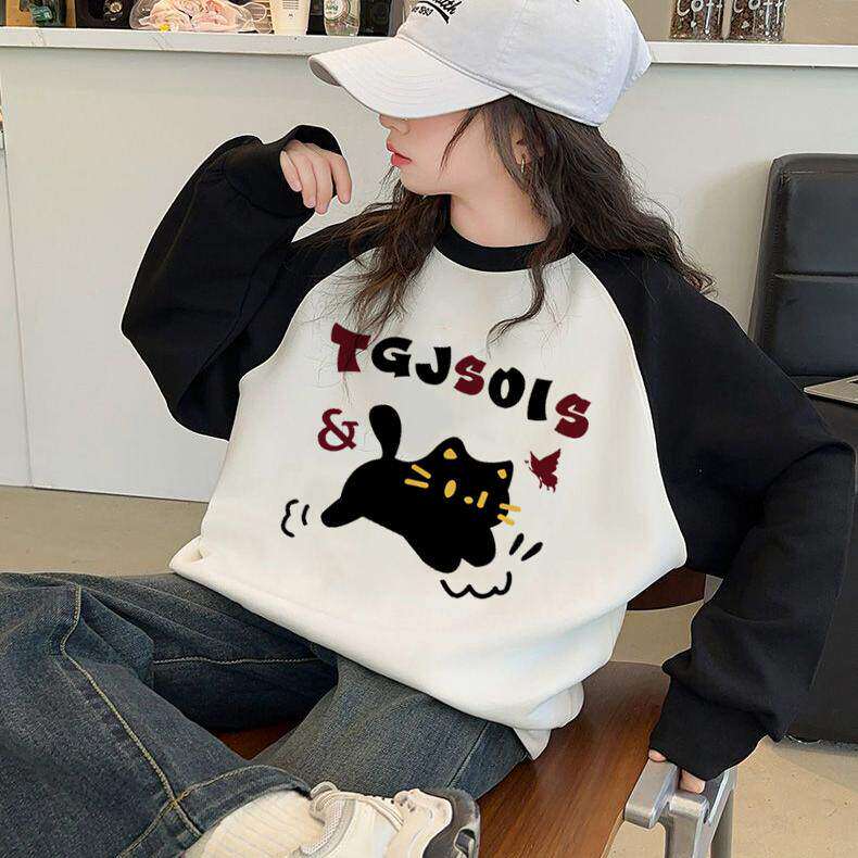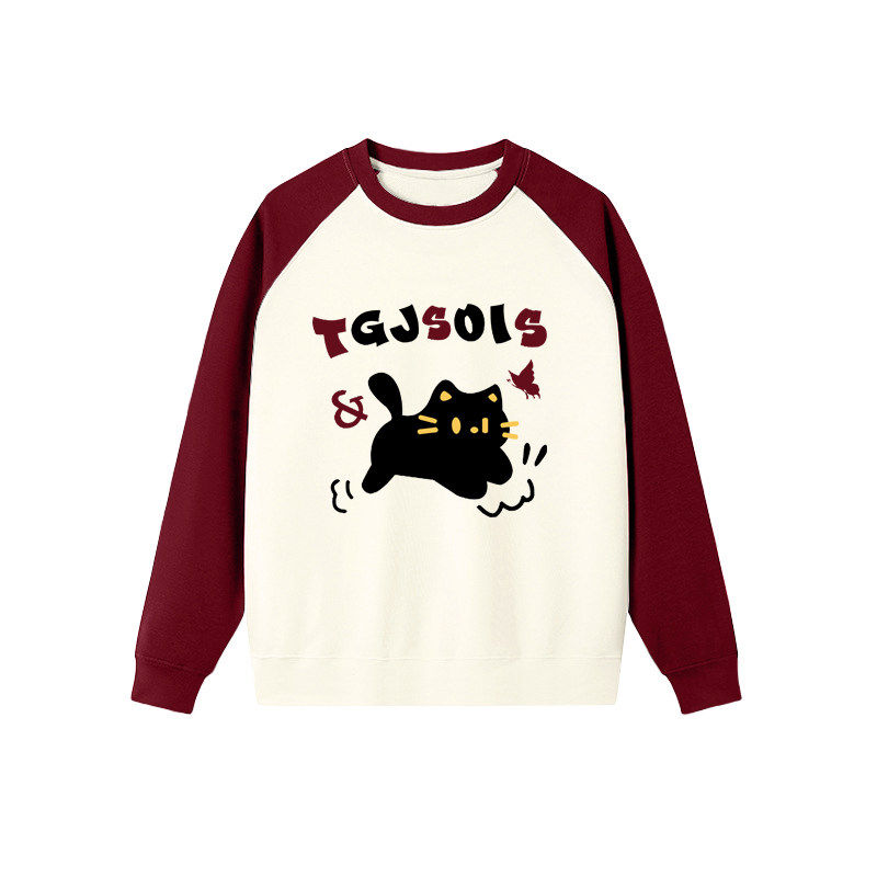 慵懒chic插肩袖卫衣女童酒红冬季加绒新款宽松圆领无帽春秋打底衫