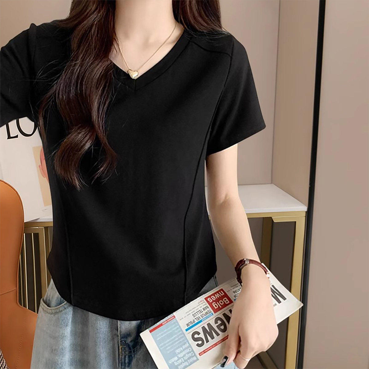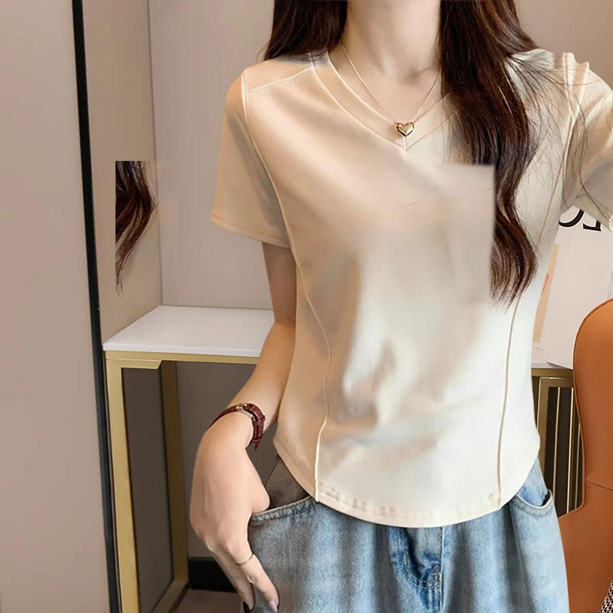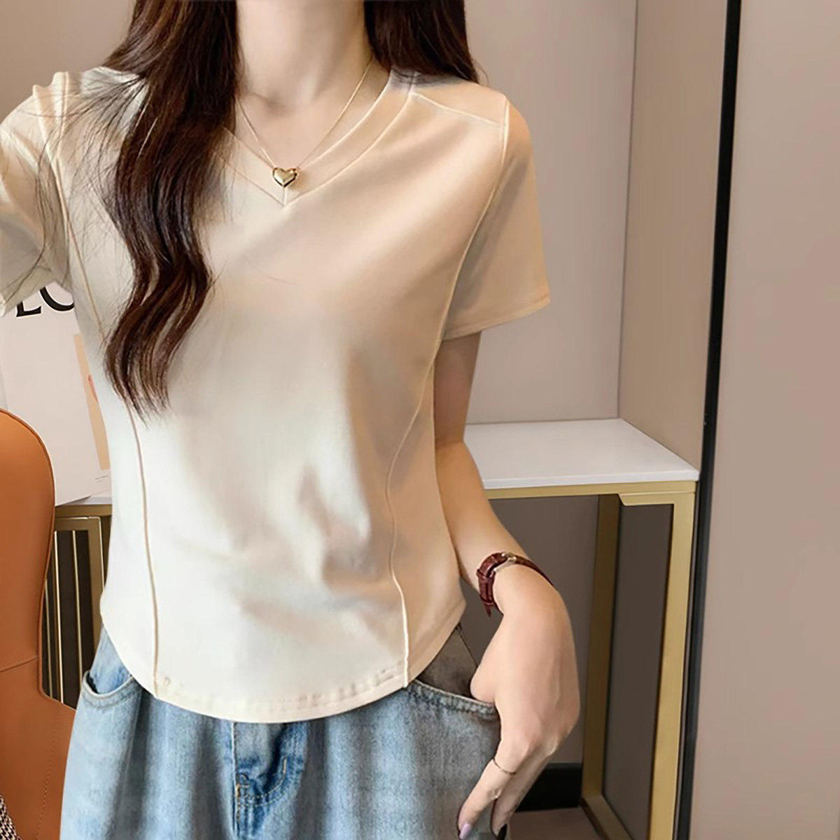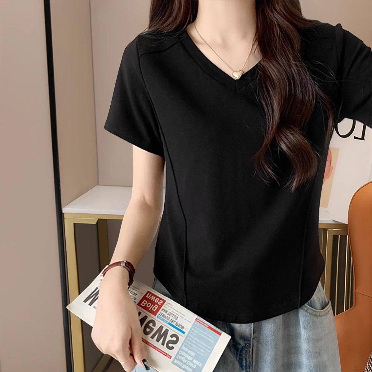2026新款白色V领短袖t恤女款胖mm夏季修身大码设计感小众夏装上衣