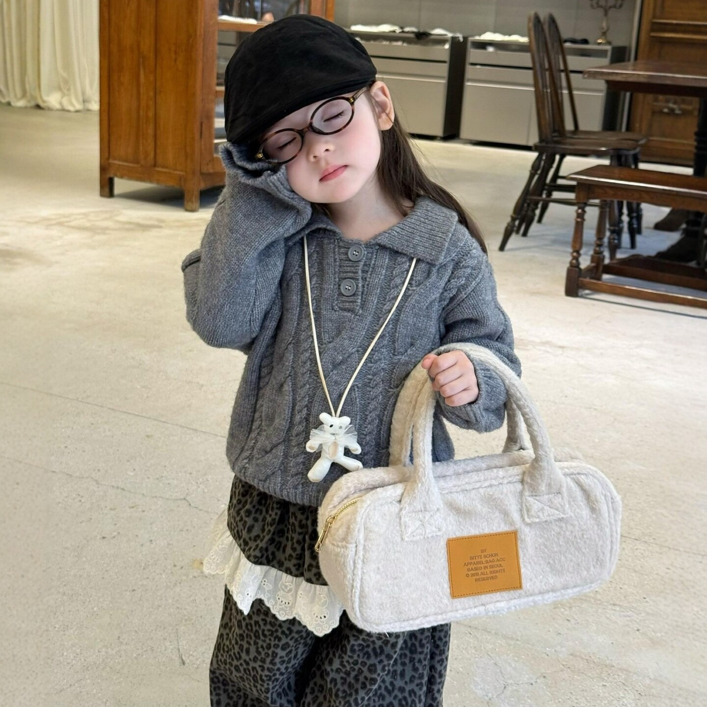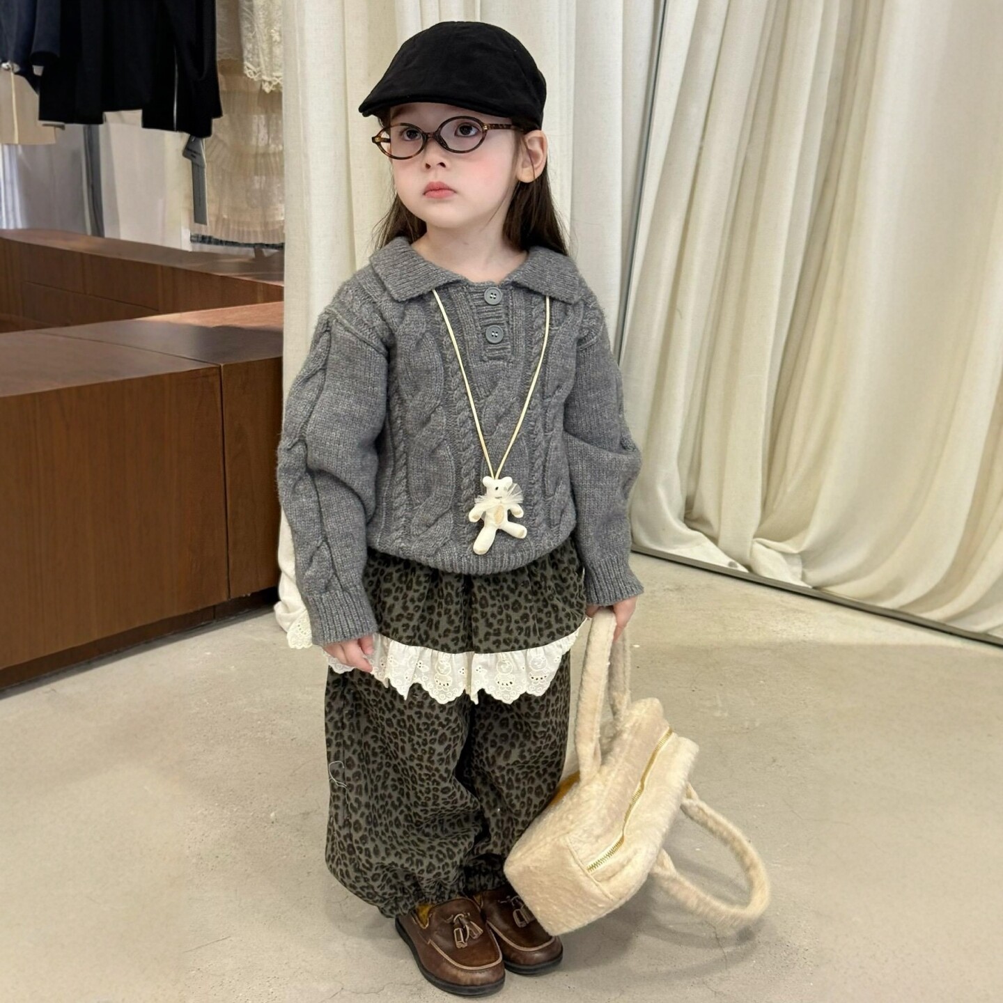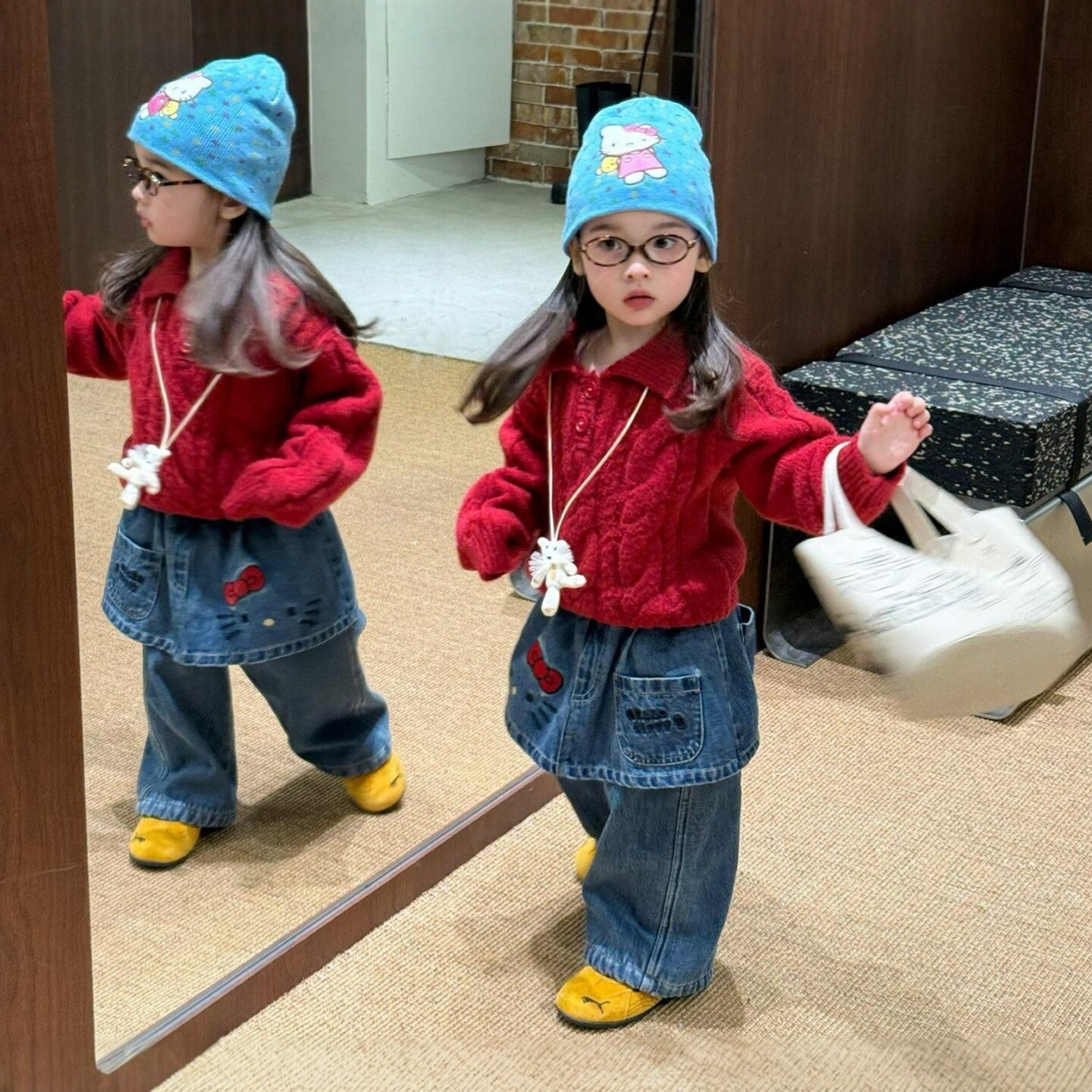秋冬季女童复古森系洋气儿童宝宝加厚红色毛衣冬装加绒牛仔裤套装