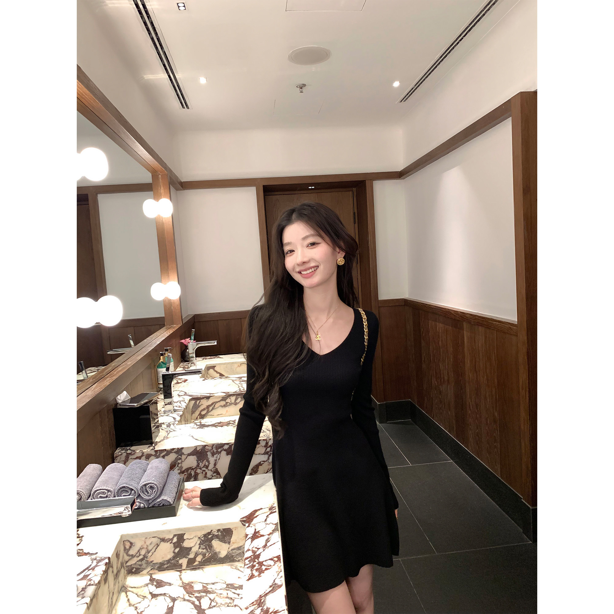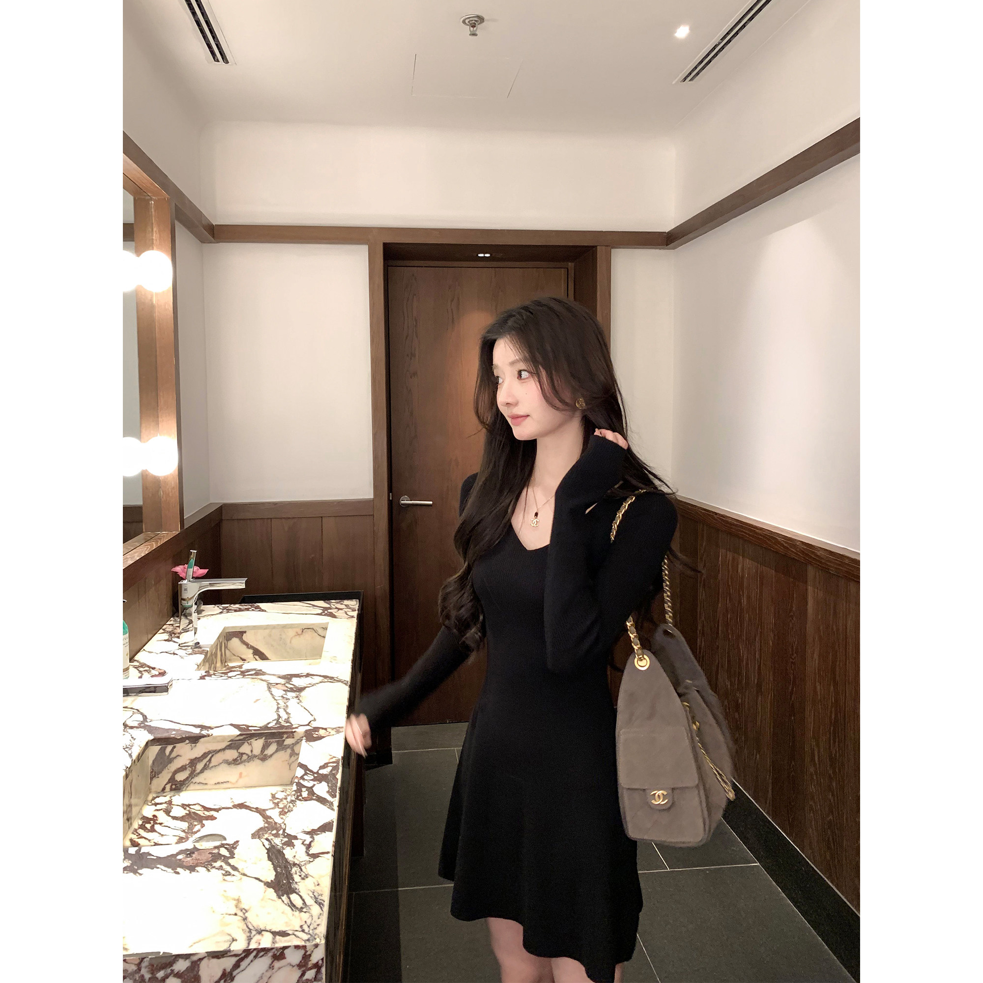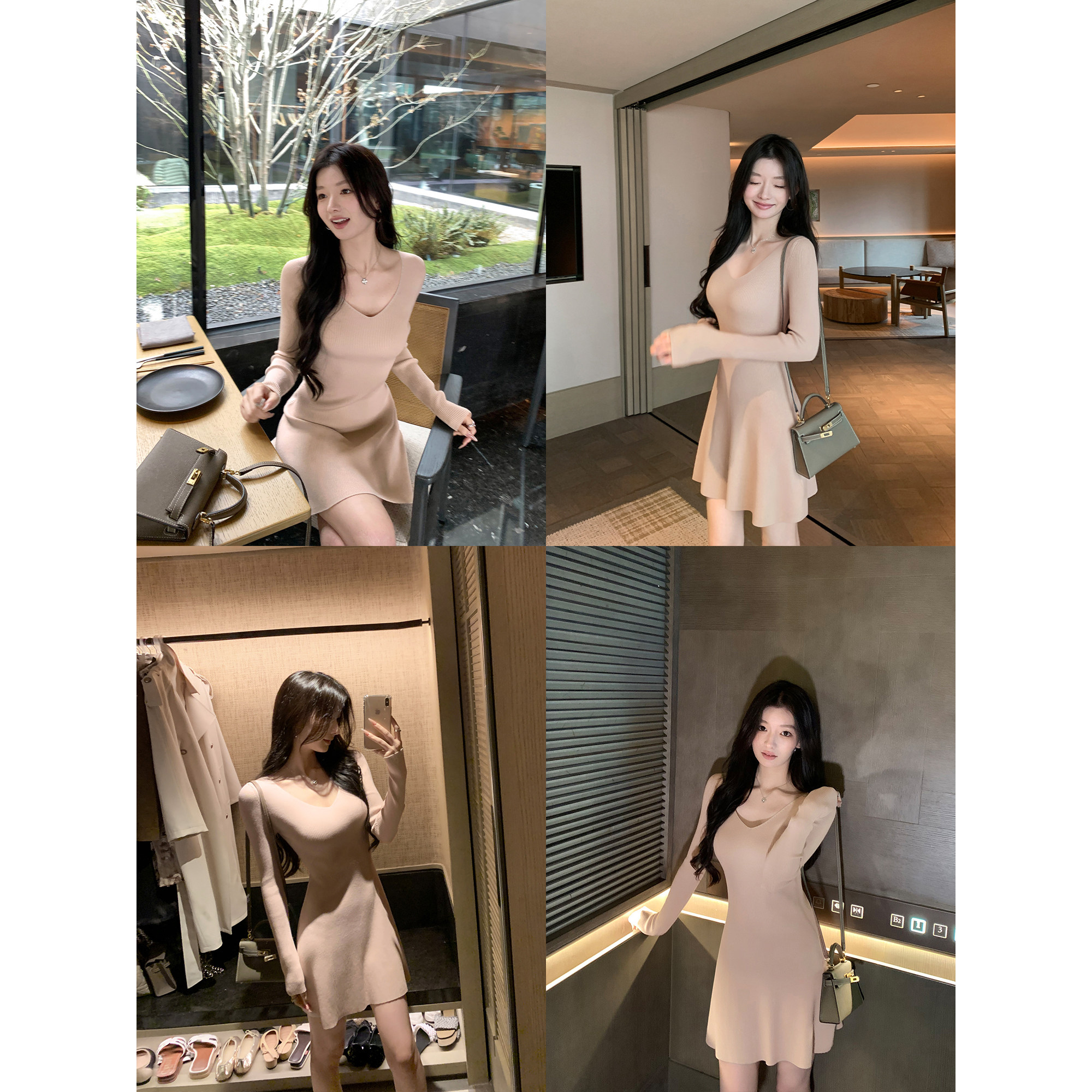 1XTWO 甜黛美人 高级感V领长袖针织连衣裙女气质修身收腰a字短裙