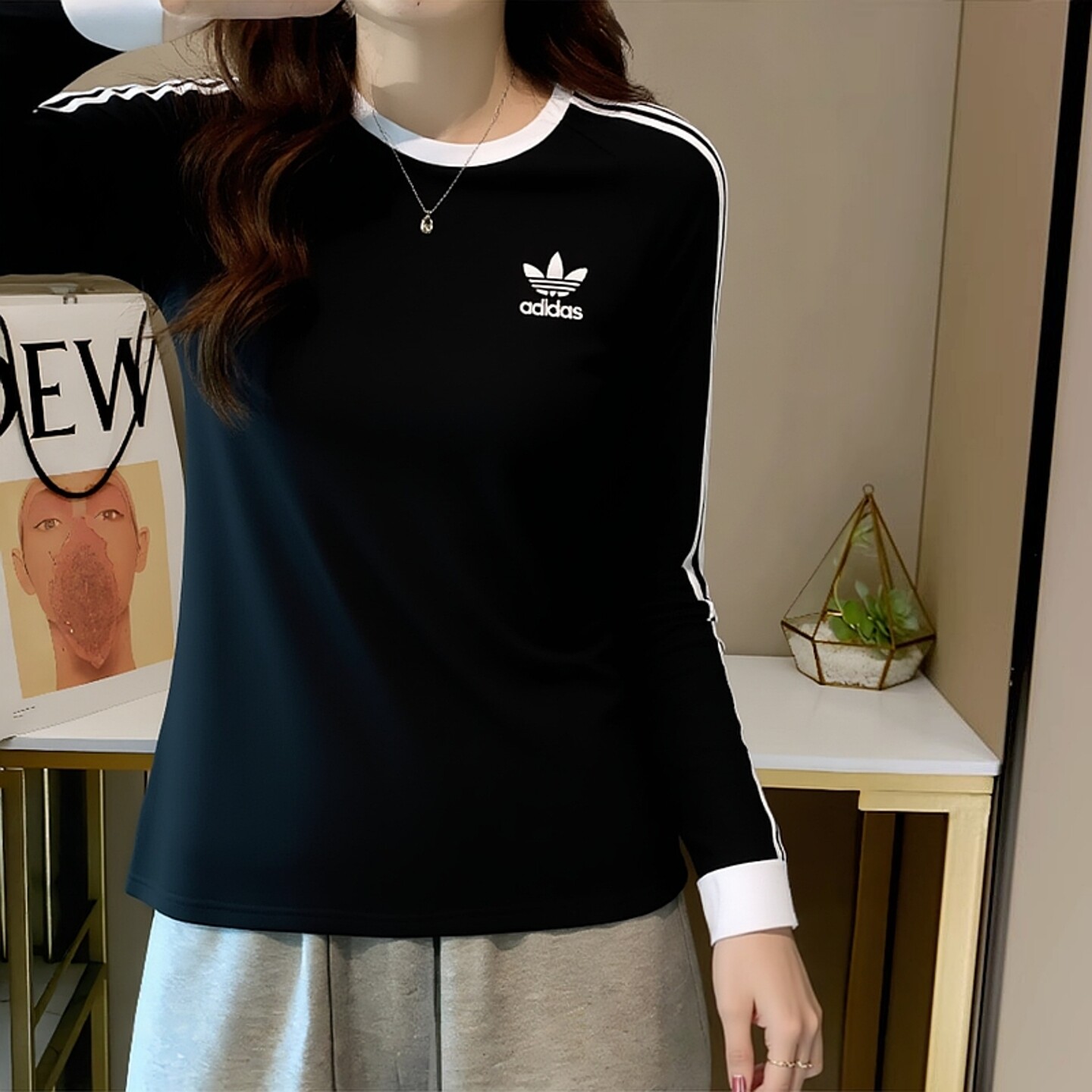 Adidas三叶草长袖T恤女装2026春季新款黑色宽松阿迪达斯上衣卫衣