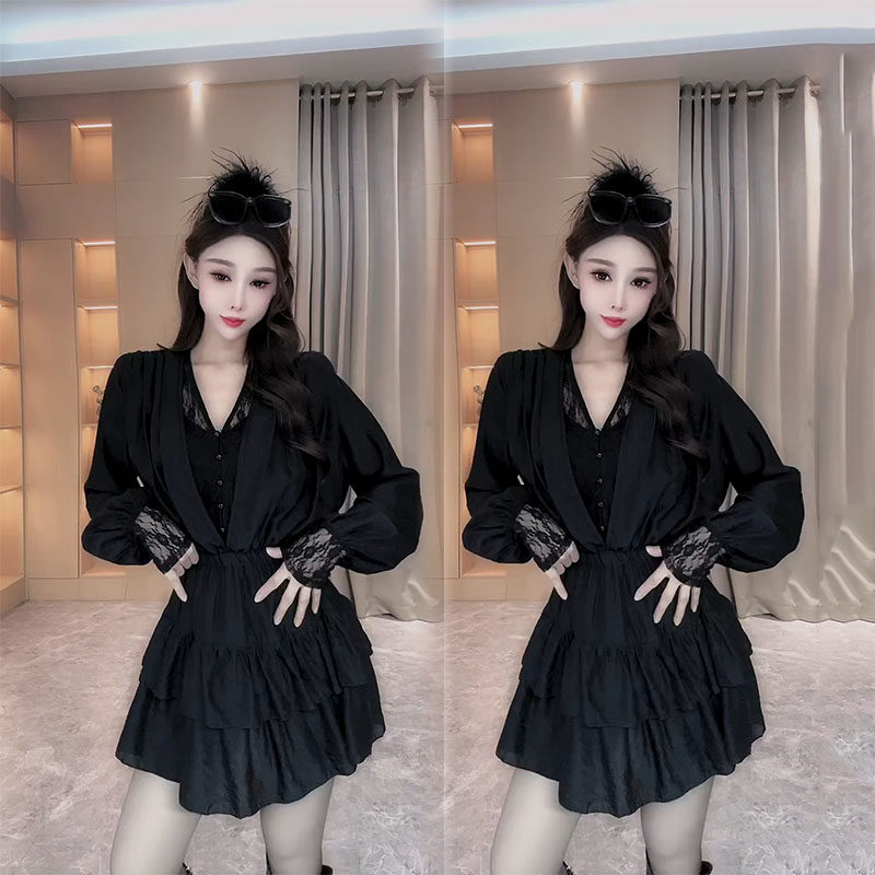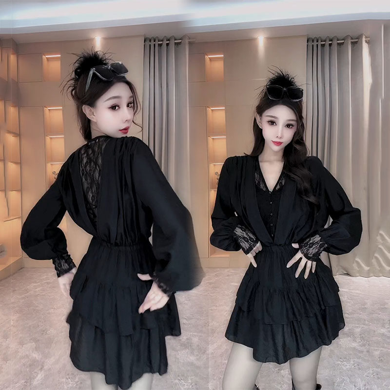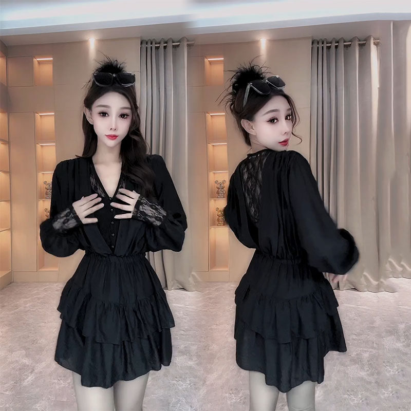 法式蕾丝拼接长袖美背连衣裙2026早春新款黑色V领收腰显瘦打底裙