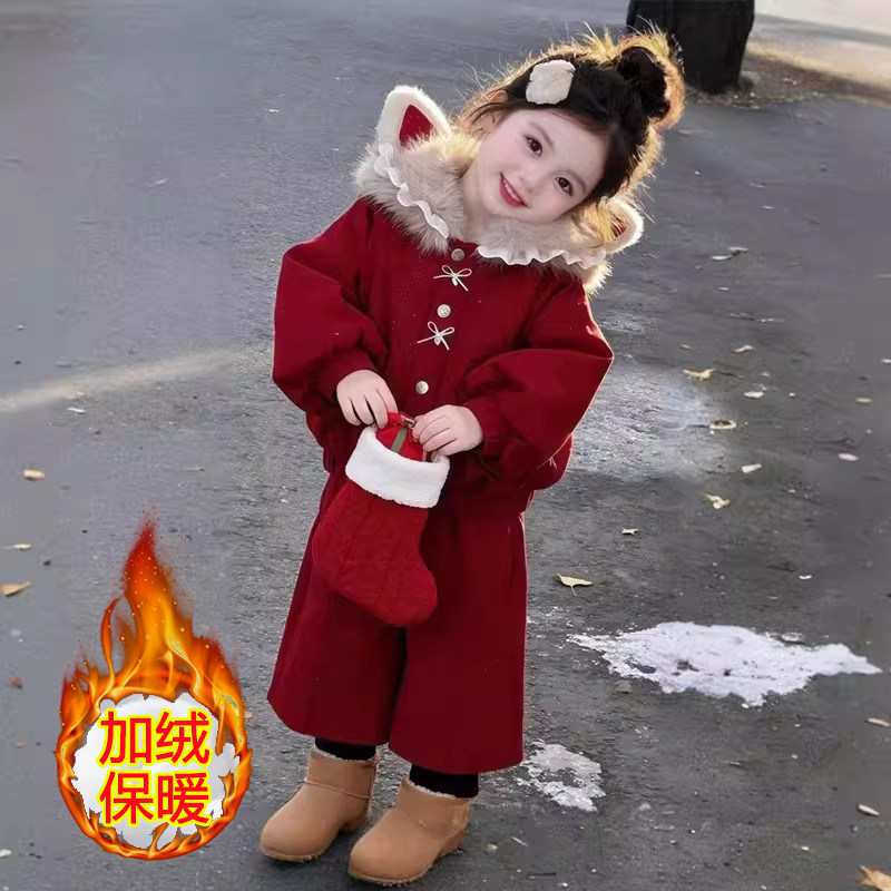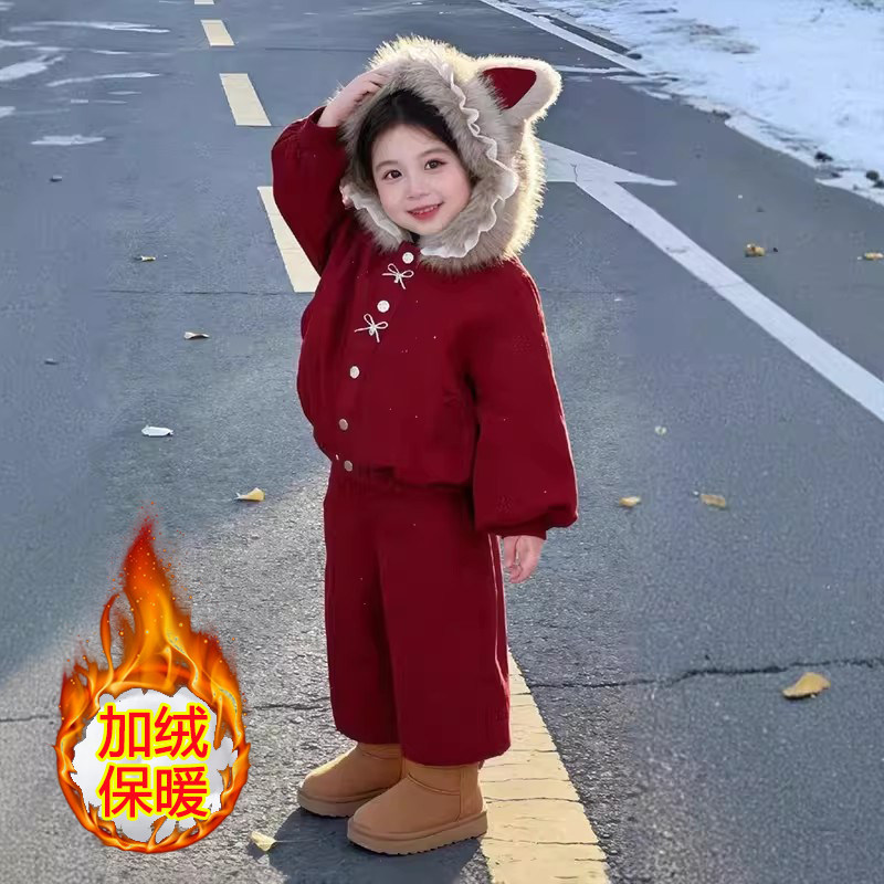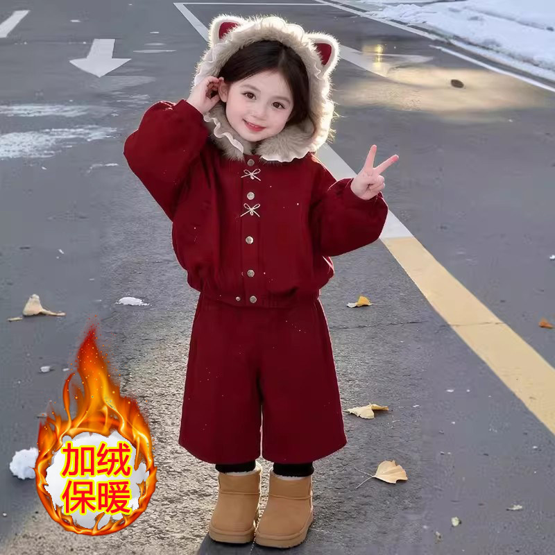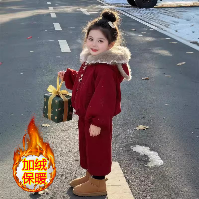 网红拜年洋气中大童套装加绒宝宝两件套女童潮保暖冬季儿童拜年服