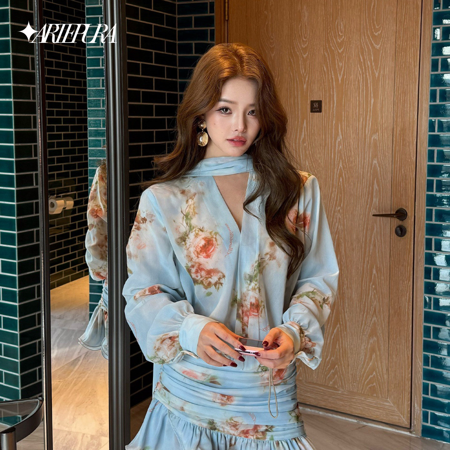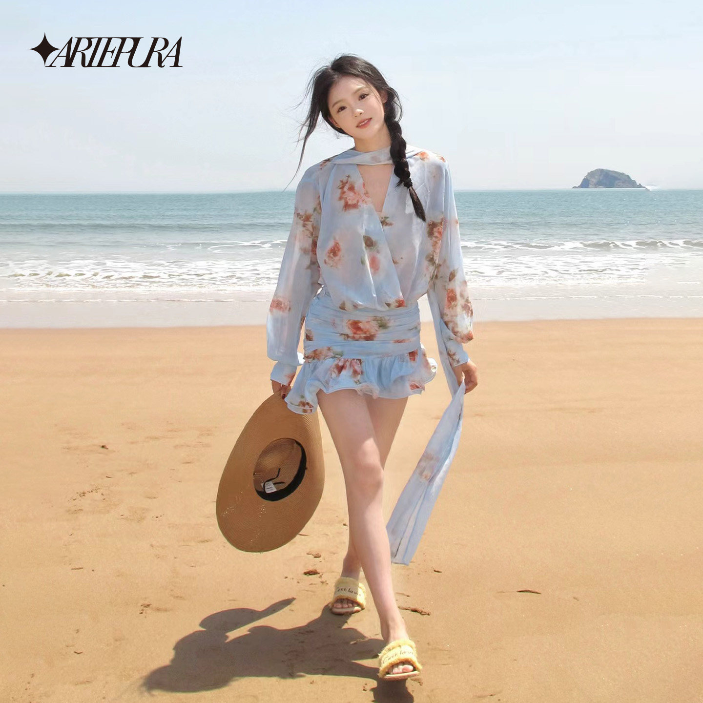 ARTE PURA飘带印花连衣裙长袖衬衫漂亮短裙女海边度假多巴胺裙子