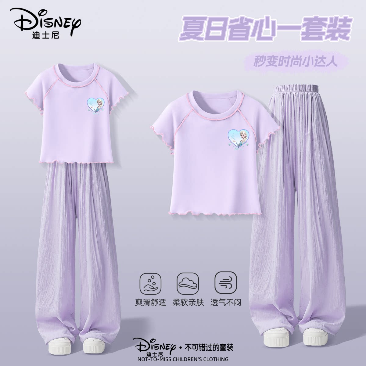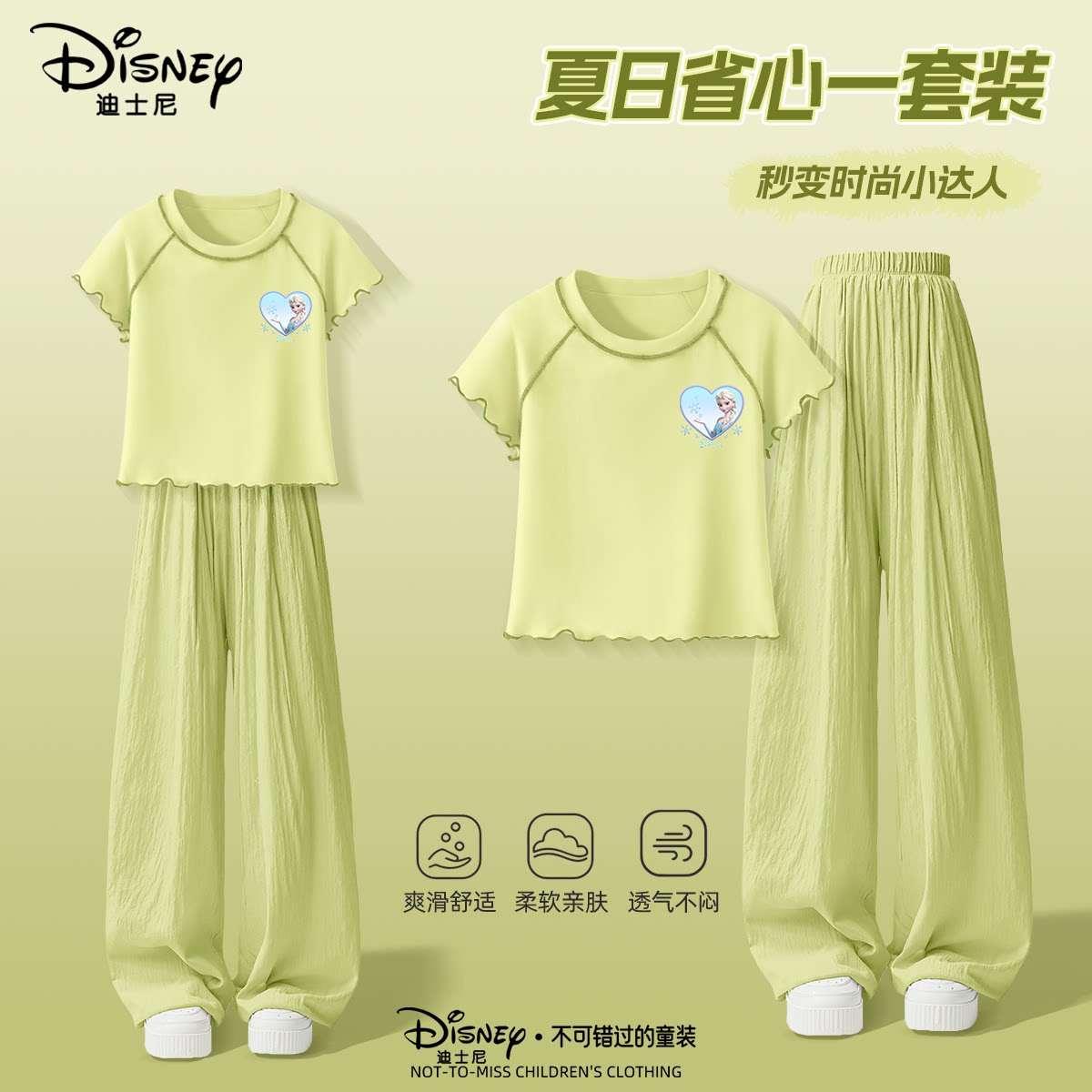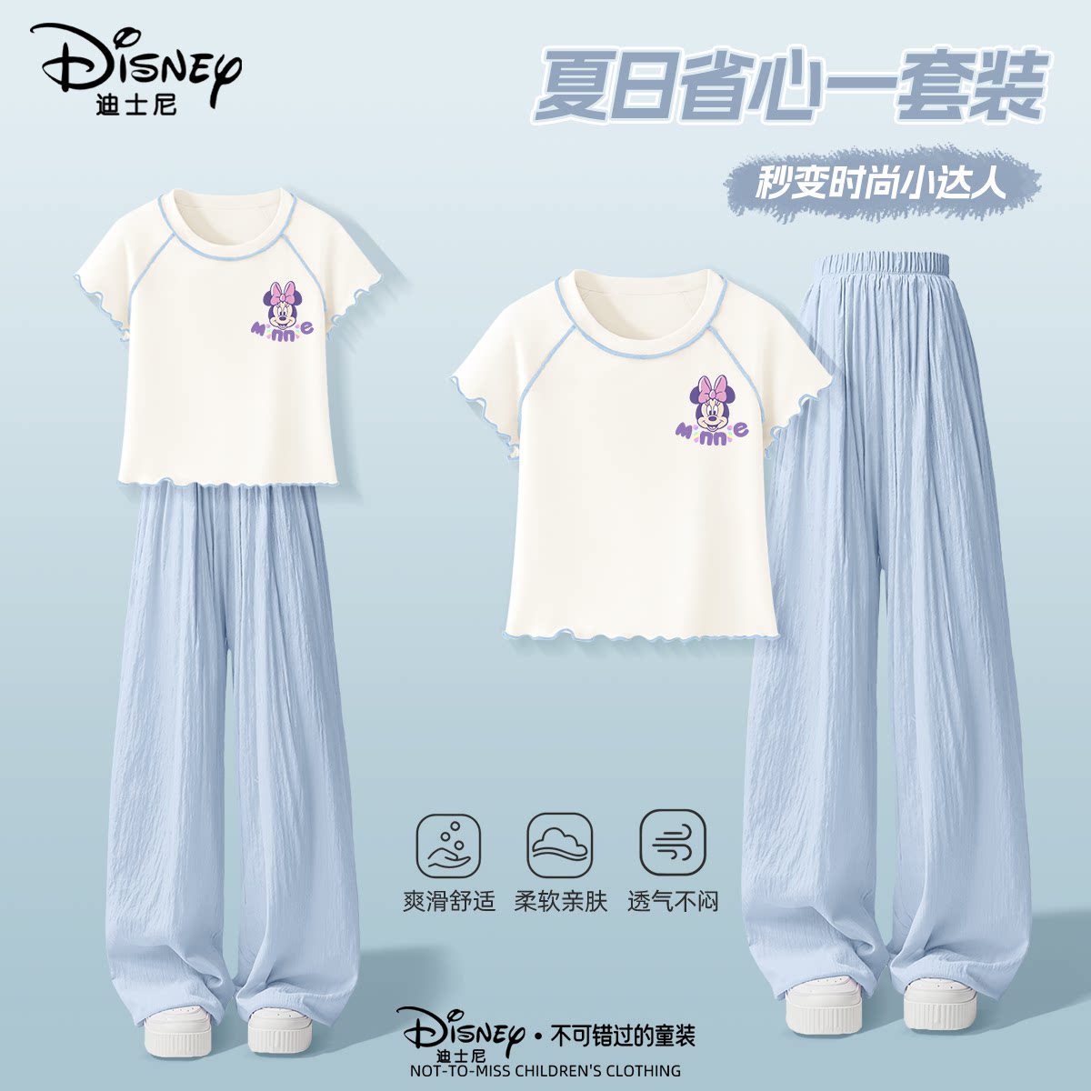 迪士尼女童可爱夏季时尚短袖套装洋气透气短裤短袖上衣直筒裤套装