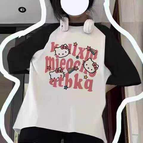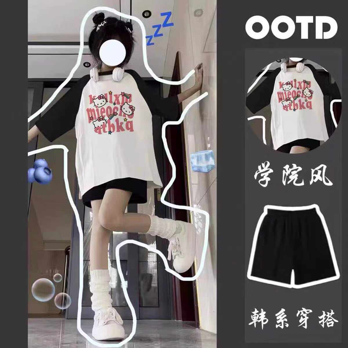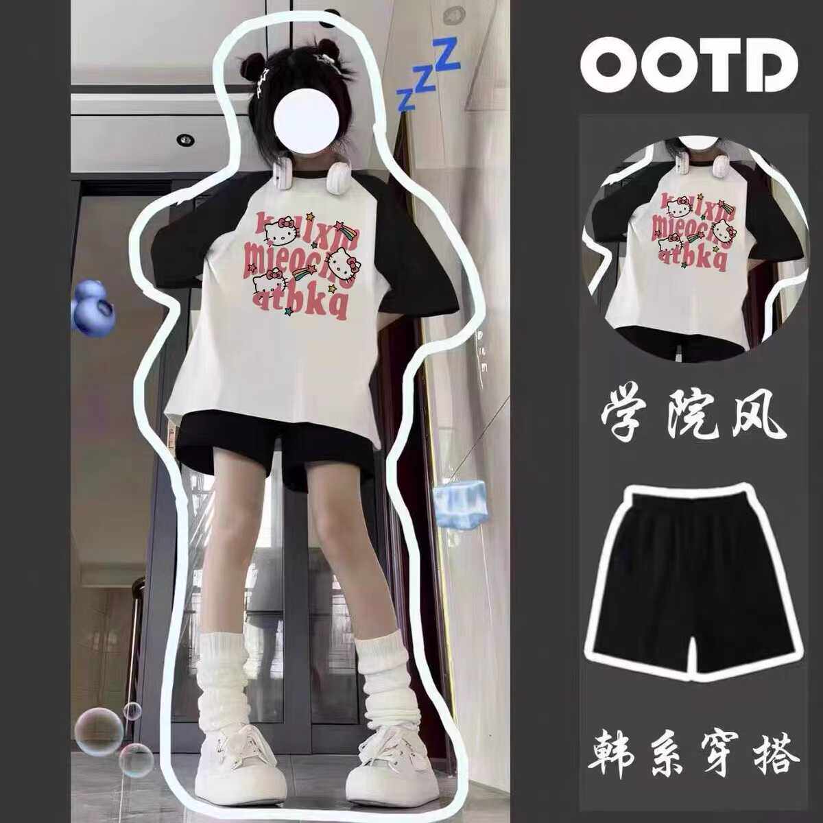 夏季女童纯棉短袖T恤套装2026新款中大童卡通Kitty宽松短裤两件套