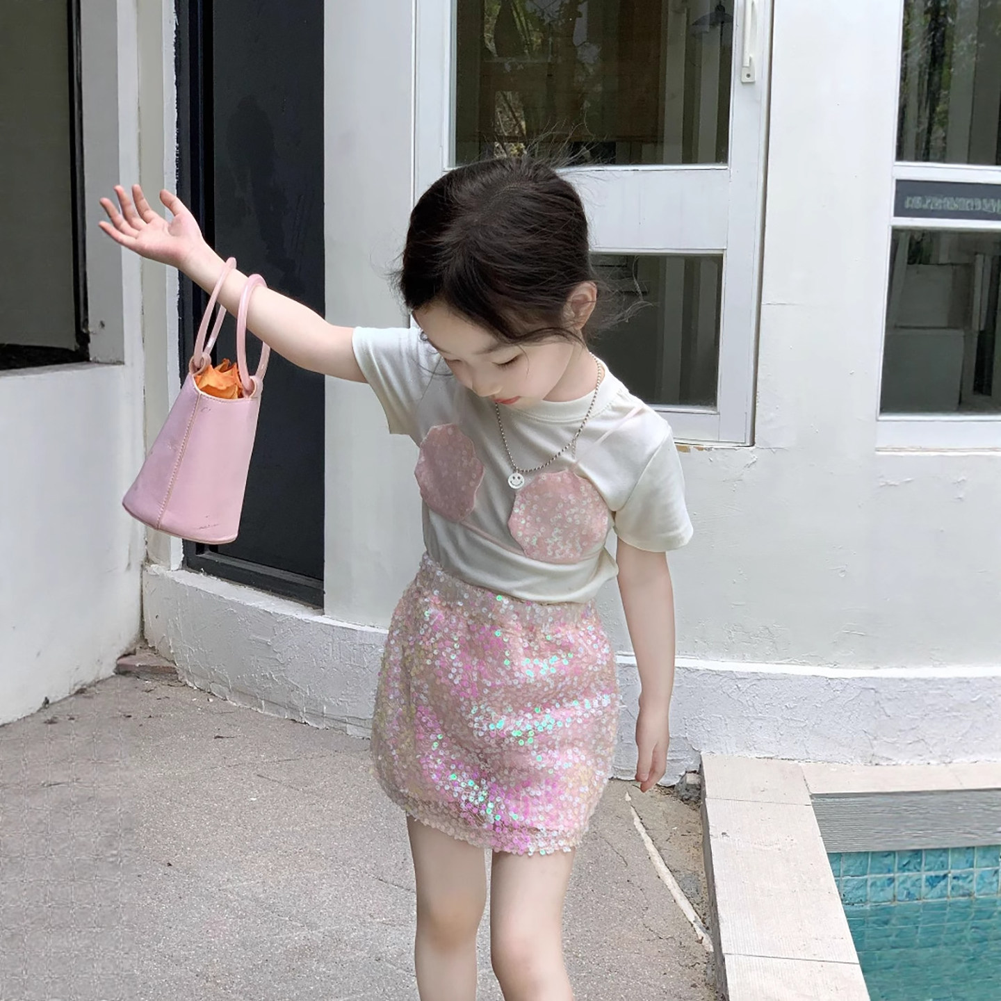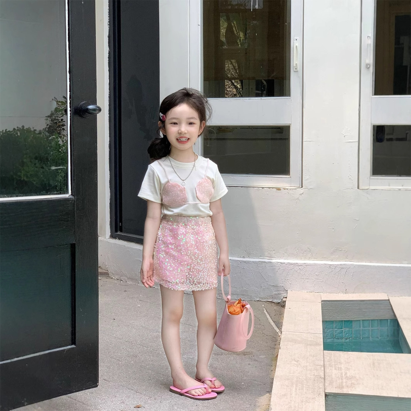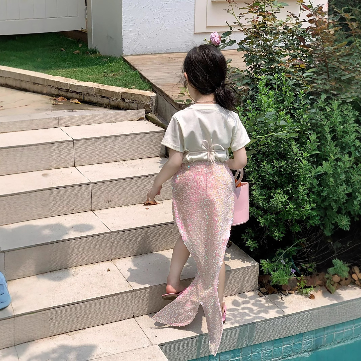 小人鱼!夏季女童套装假两件短袖T恤+人鱼公主半身裙夏款可爱上衣