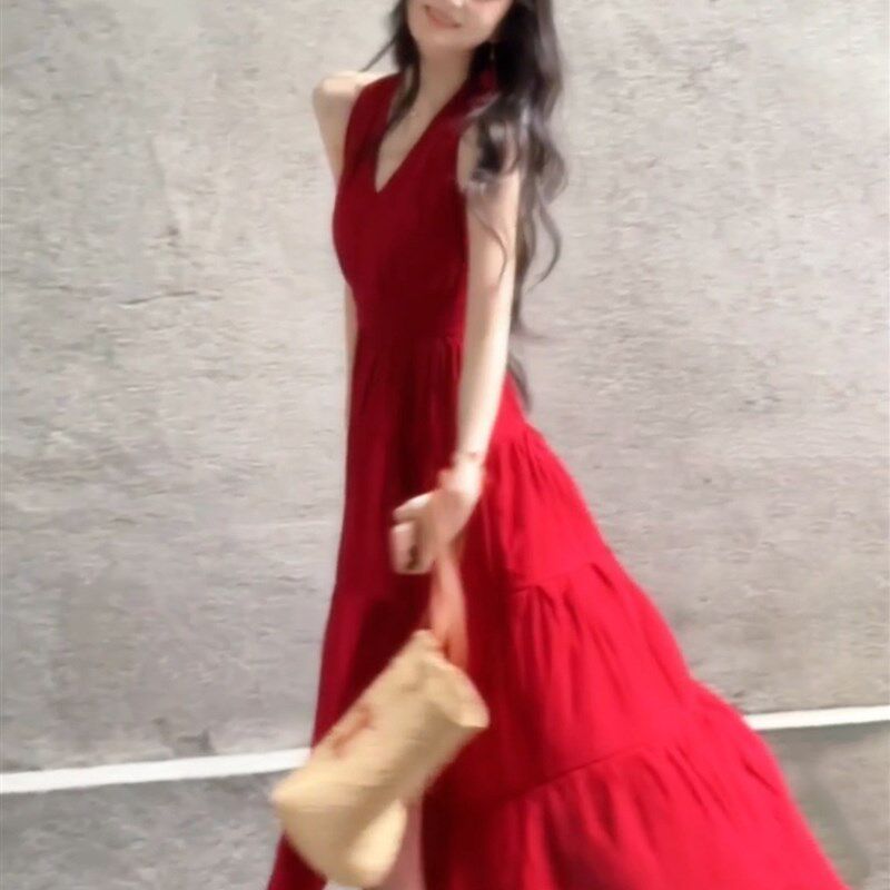 法式气质红色挂脖吊带连衣裙女夏季2025新款海边度假绝美漂亮长裙