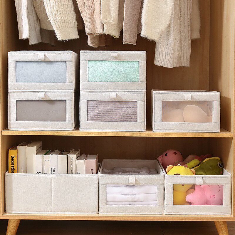 日式可视棉麻收纳盒抽屉式衣物收纳盒带盖可折叠家用衣柜收纳箱