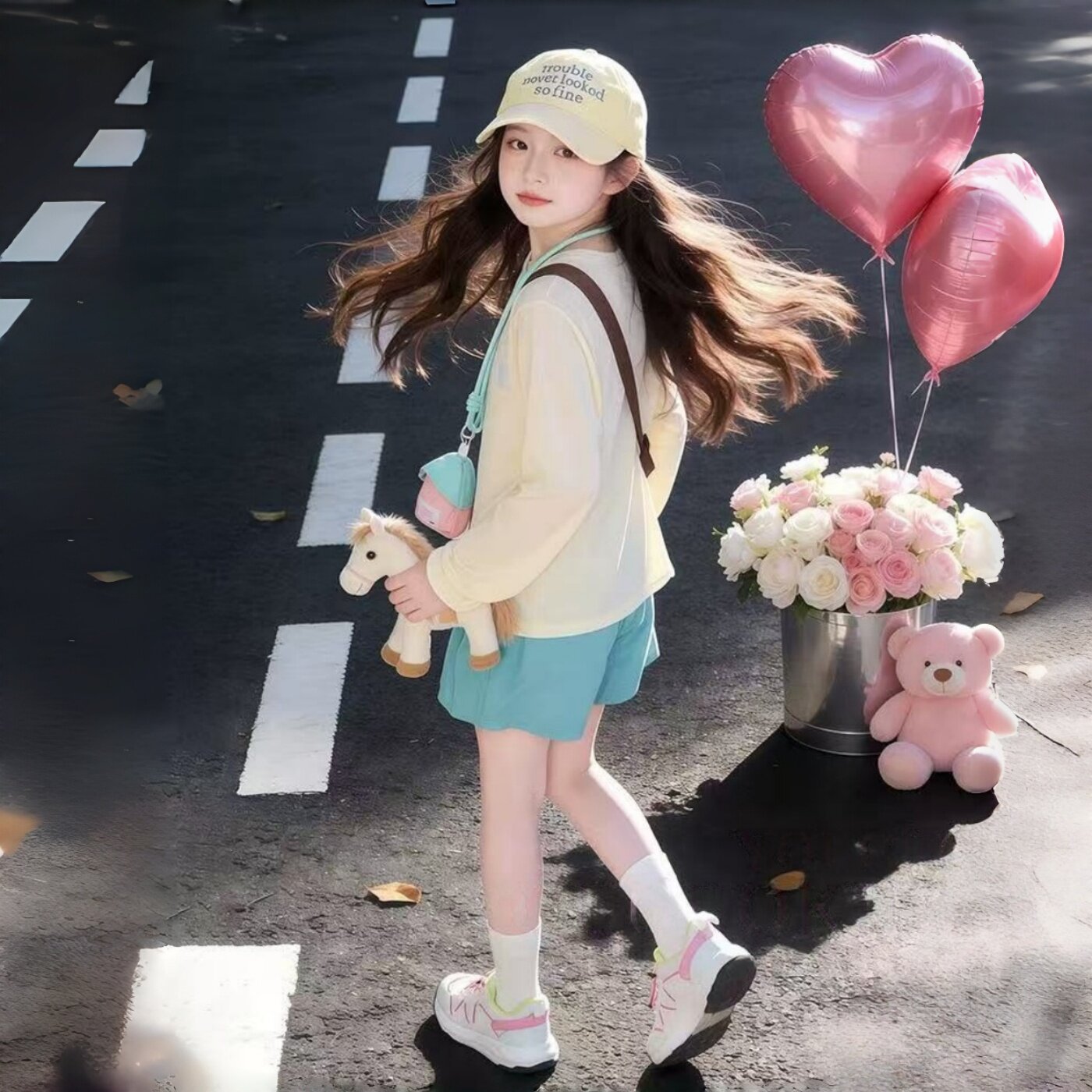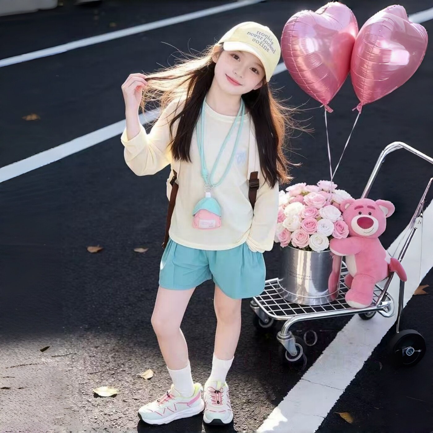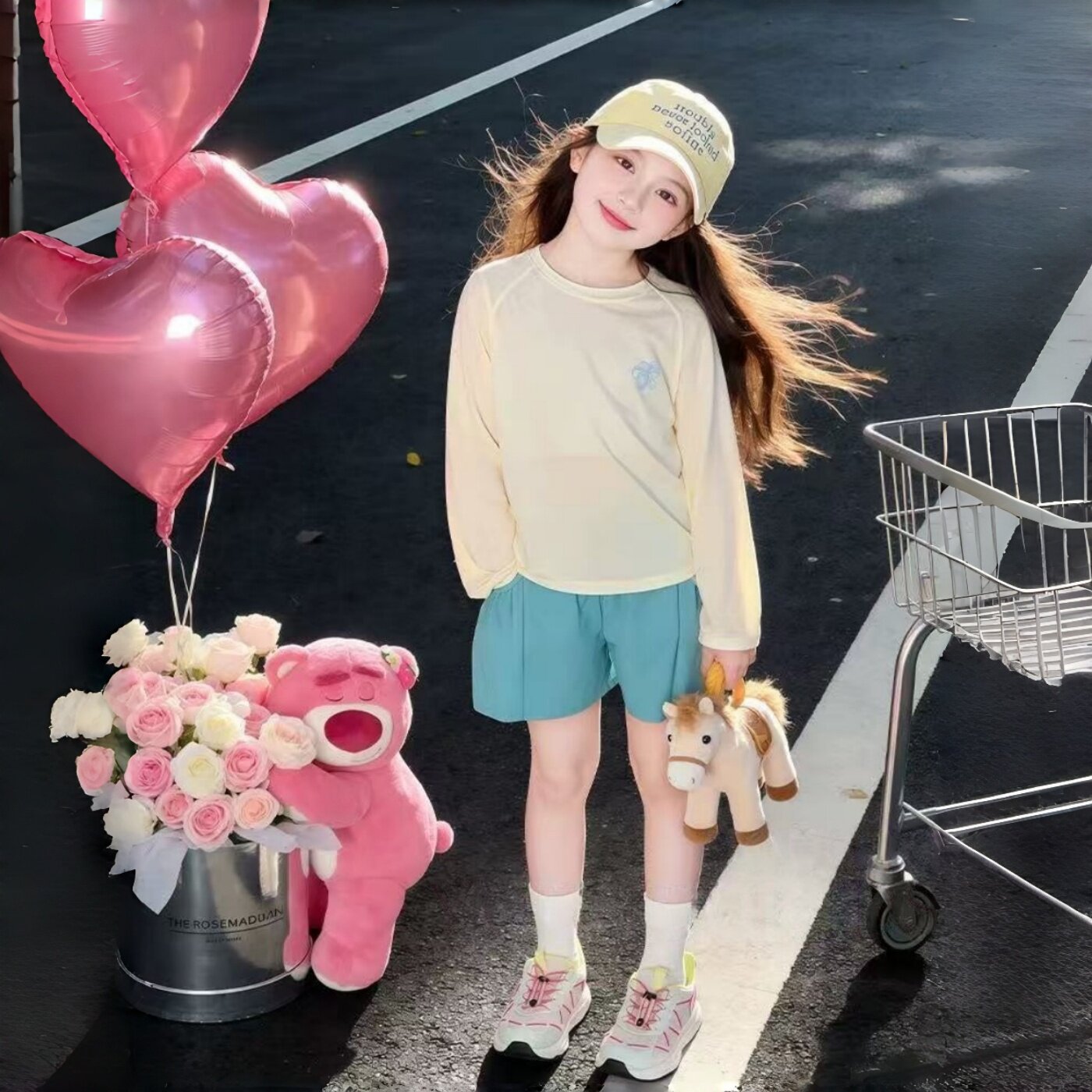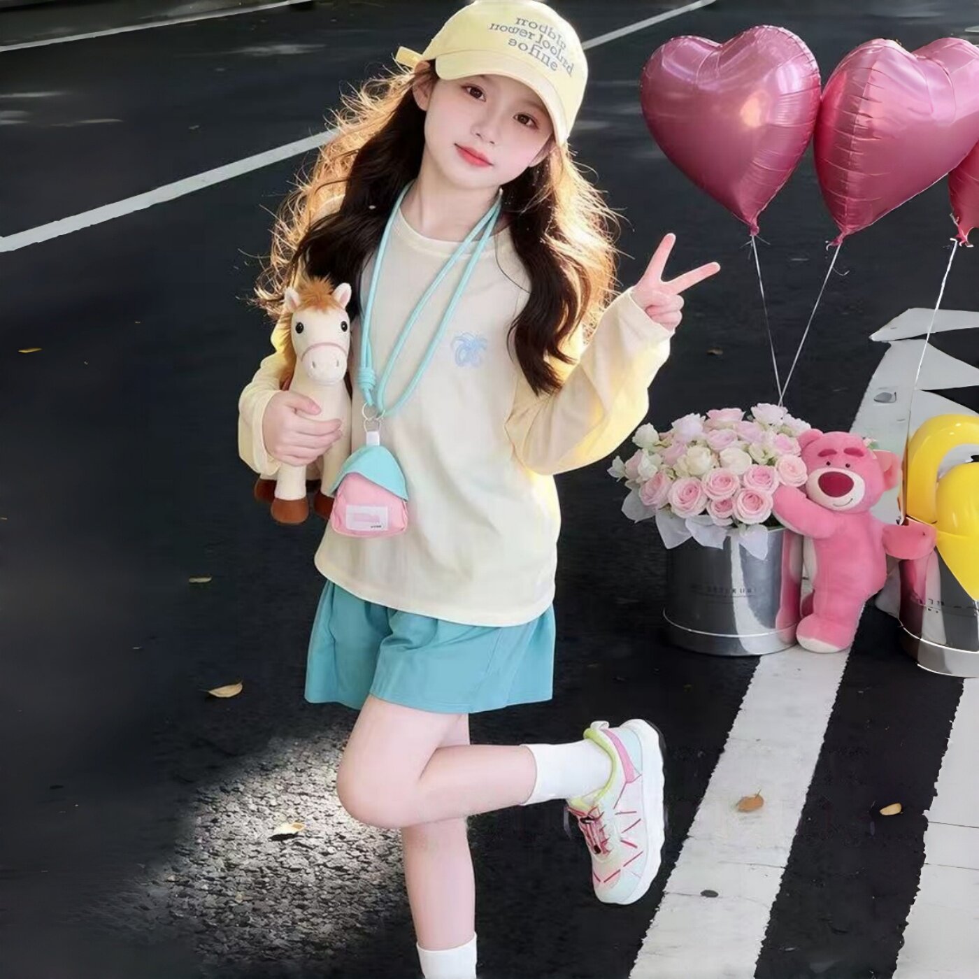 女童装夏季时髦洋气套装中大儿童女孩多巴胺长袖T恤短裤两件套潮