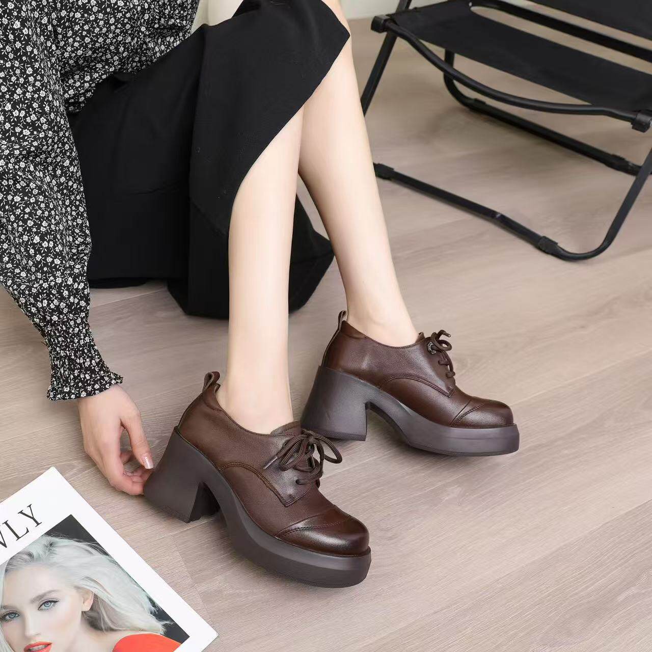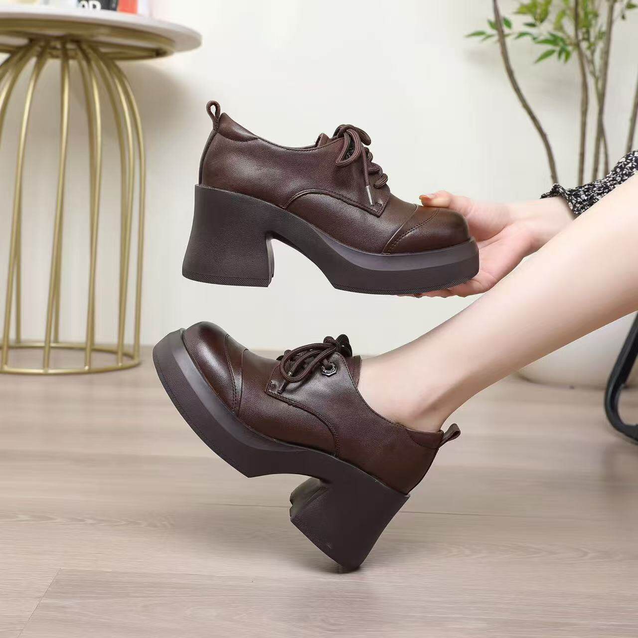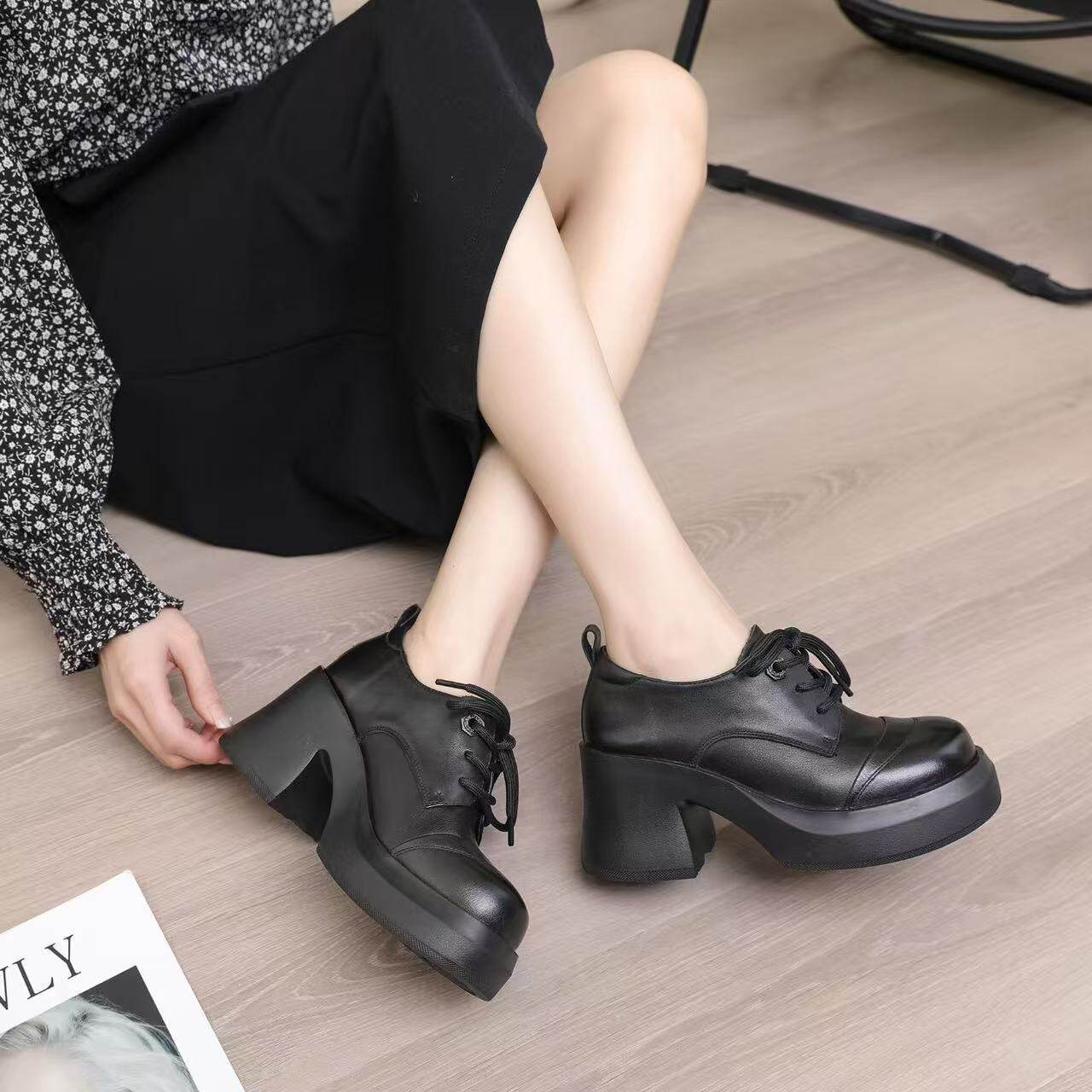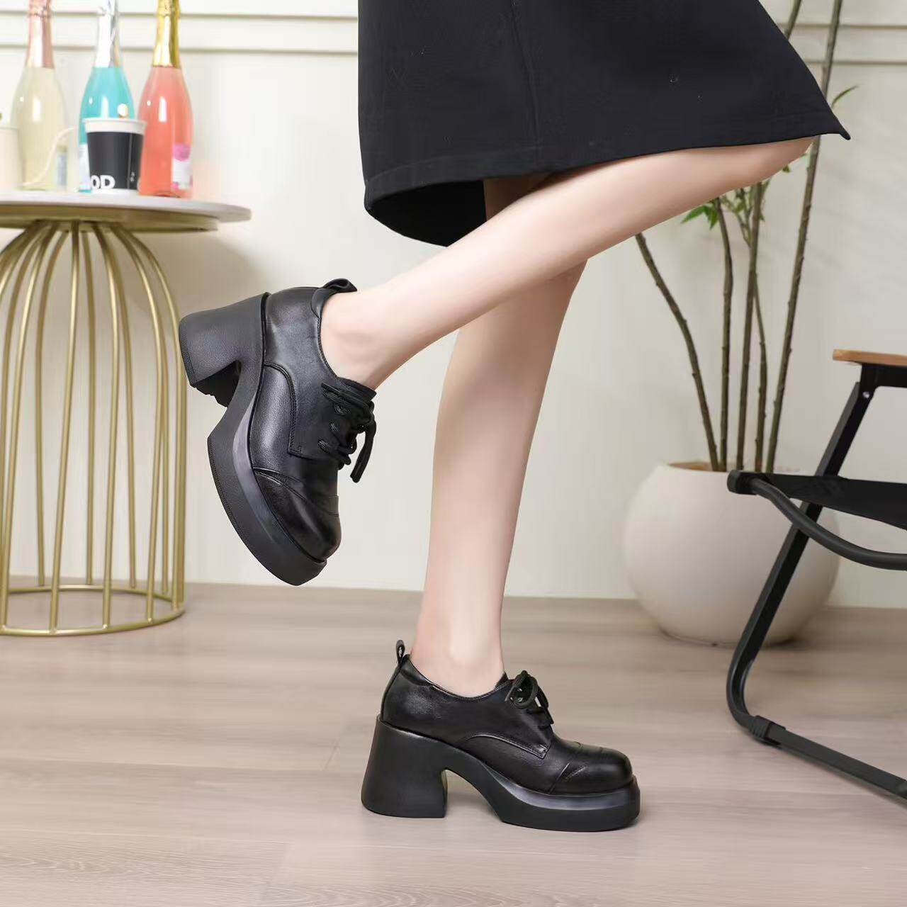 春秋圆头系带松糕底英伦风厚底乐福鞋女女鞋中跟单鞋黑色小皮鞋女