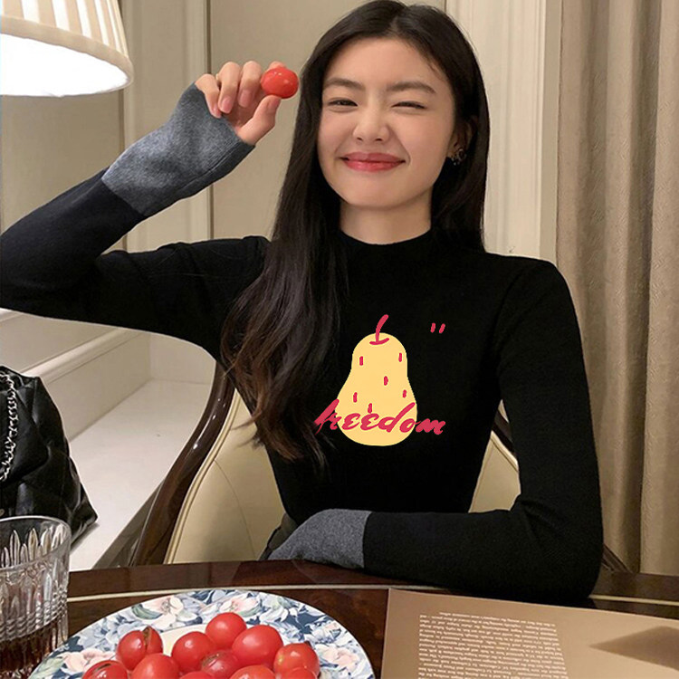撞色拼接半高领针织毛衣女款秋冬修身洋气内搭上衣黑色长袖打底衫
