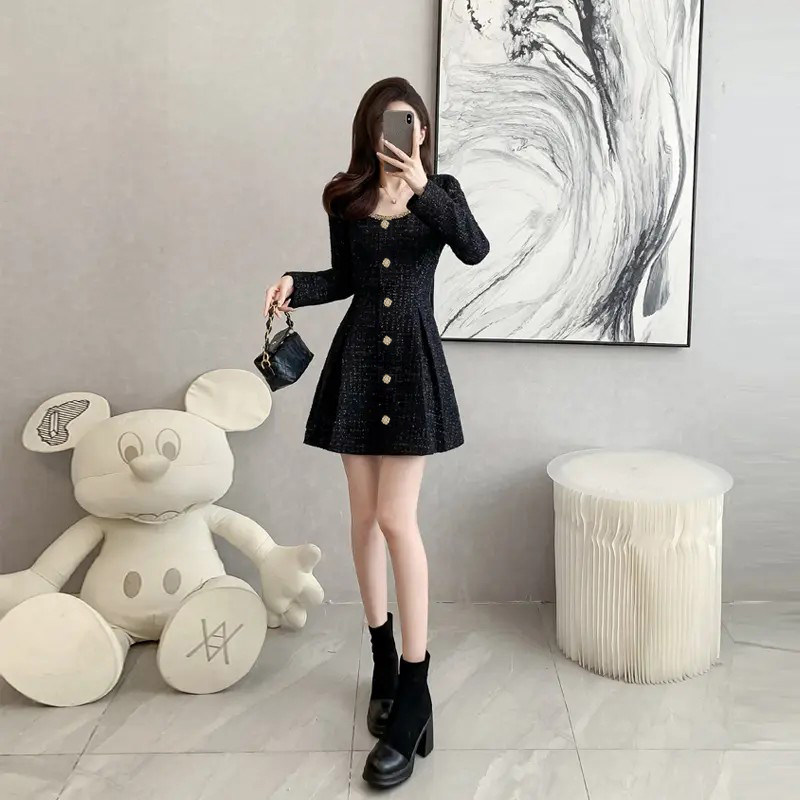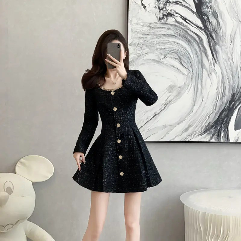有里布赫本风圆领长袖黑色连衣裙2026春季新款内搭短款裙子D3854