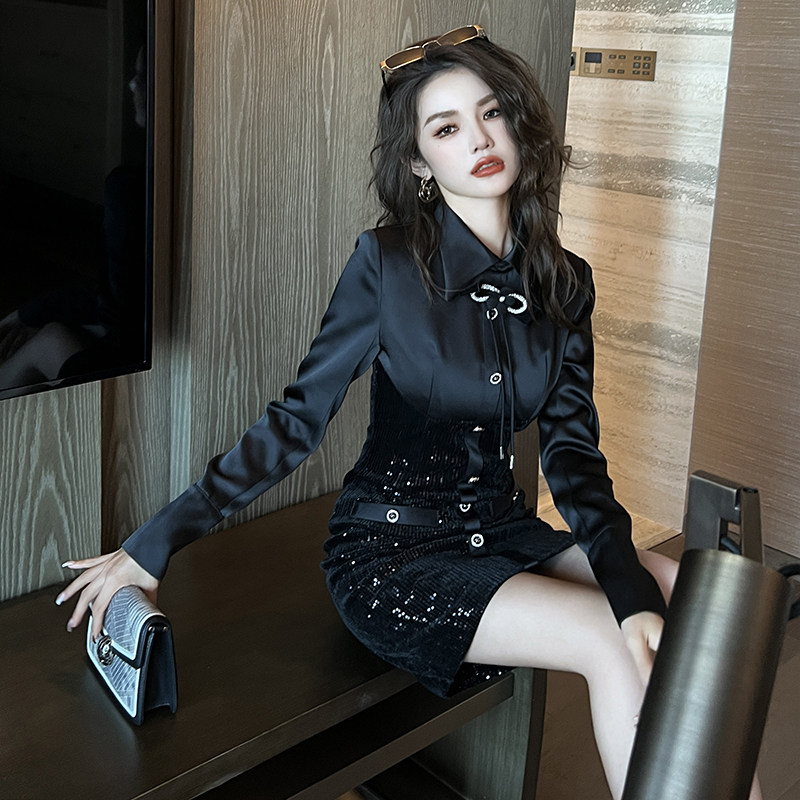 赫本风亮片Polo领长袖衬衫裙短款气质拼接高级感修身包臀连衣裙女