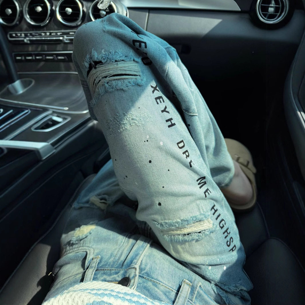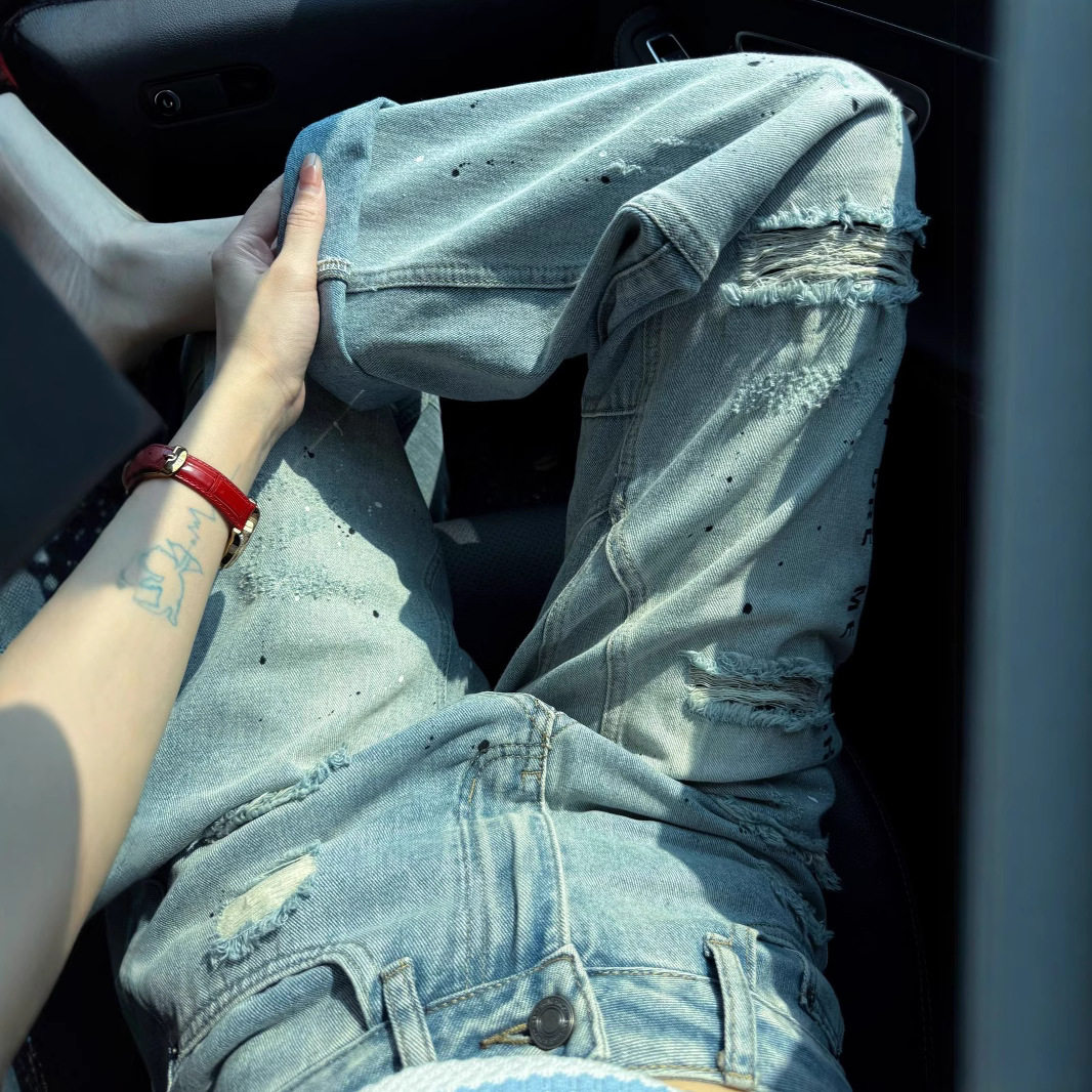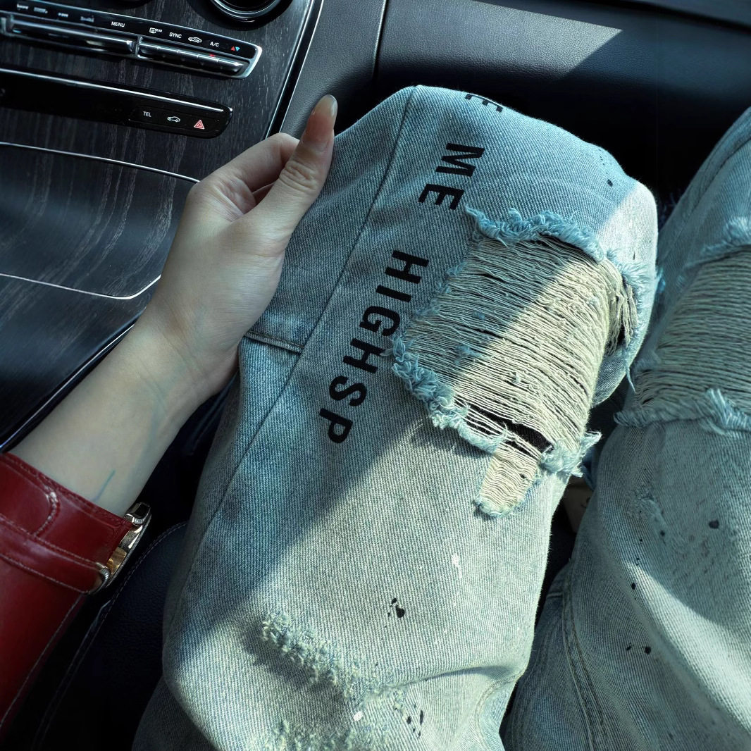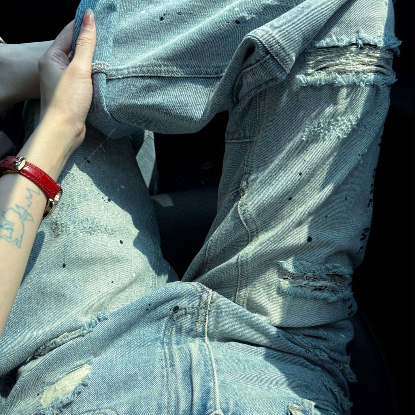 女裤子女款爆款2025新款高档蓝色阔腿破洞牛仔裤时尚高腰牛仔长裤