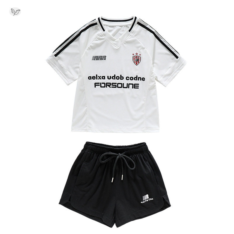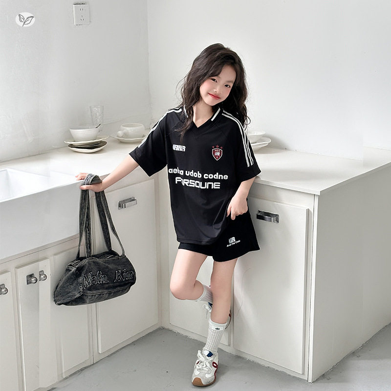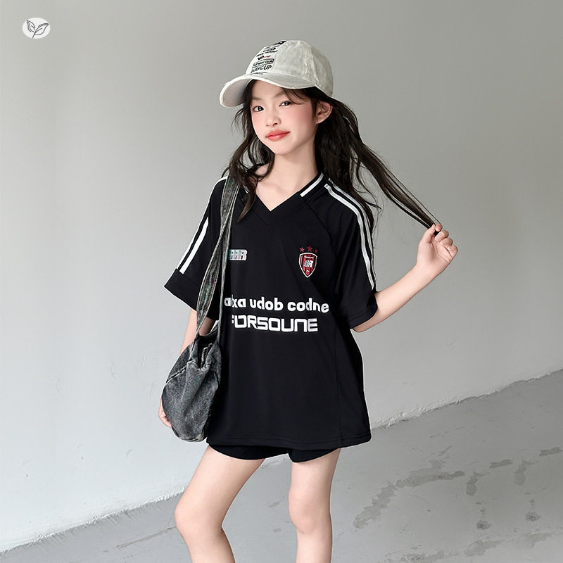 女童美式T恤套装2026年夏季新款中大童字母V领短袖短裤两件套夏装