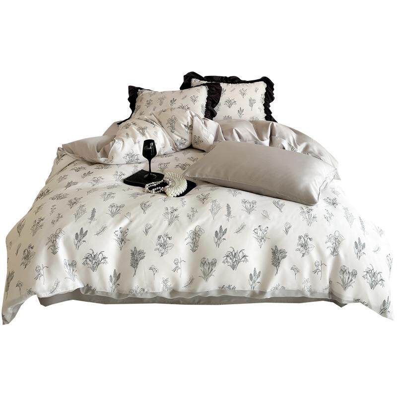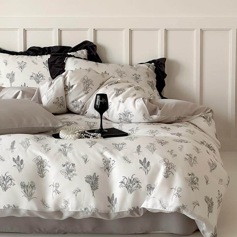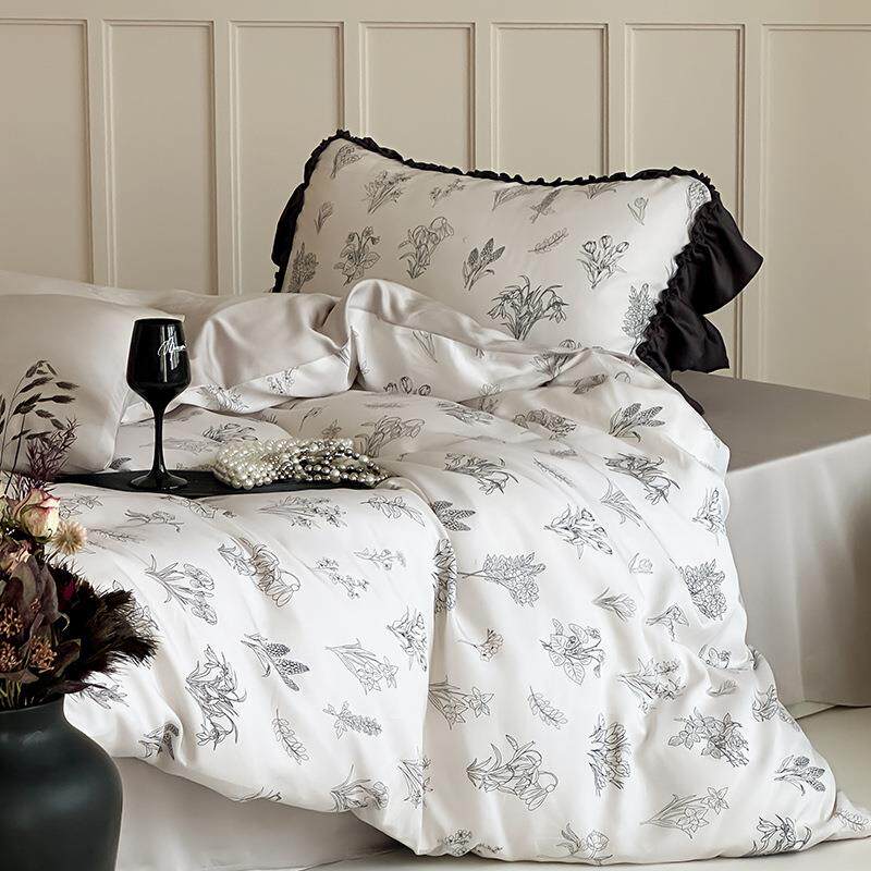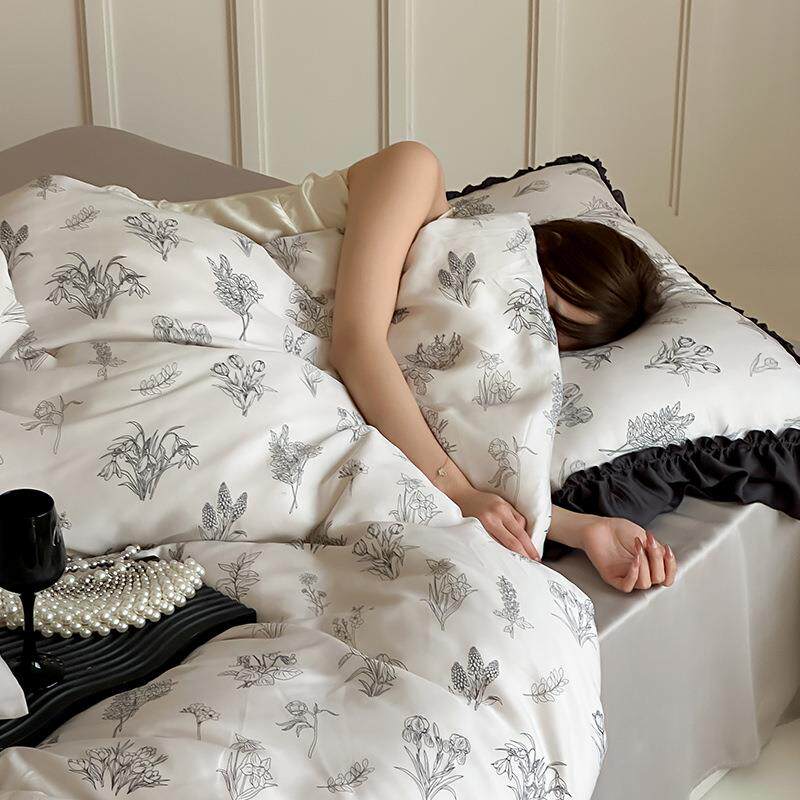夏季莱赛尔天丝床上四件套冰丝凉感夏天法式公主风黑色荷叶边床品