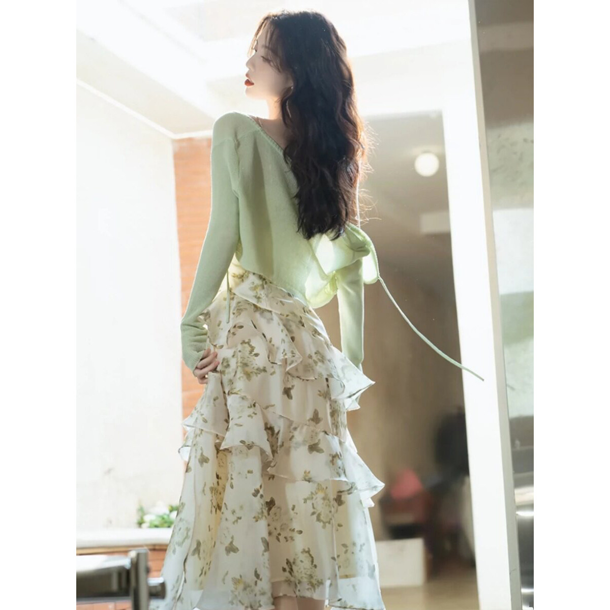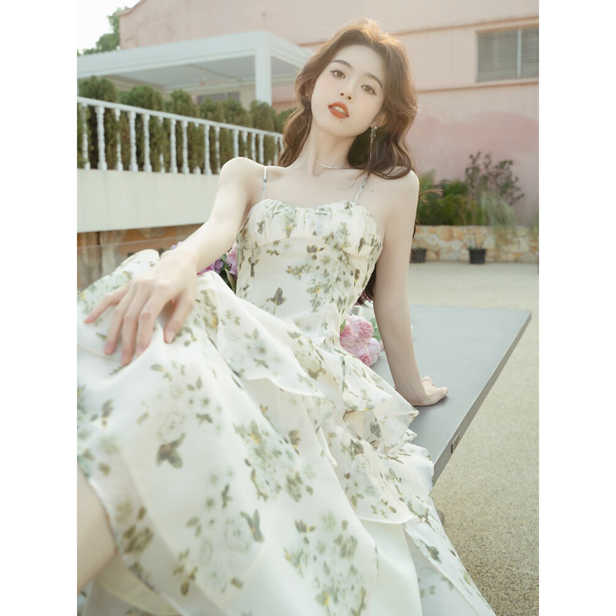 海边度假碎花吊带连衣裙子女夏2026新款独特漂亮荷叶边蛋糕裙长裙