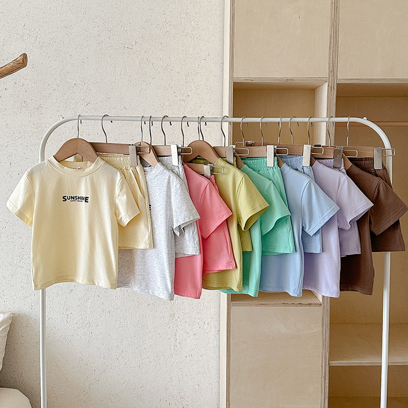 男女童夏季套装韩版短袖T恤短裤两件套纯色印花休闲童装儿童夏装