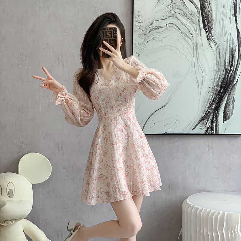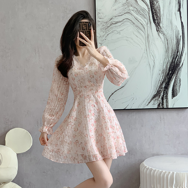 法式碎花V领连衣裙女秋季新款法式小个子温柔风收腰长袖初恋裙子