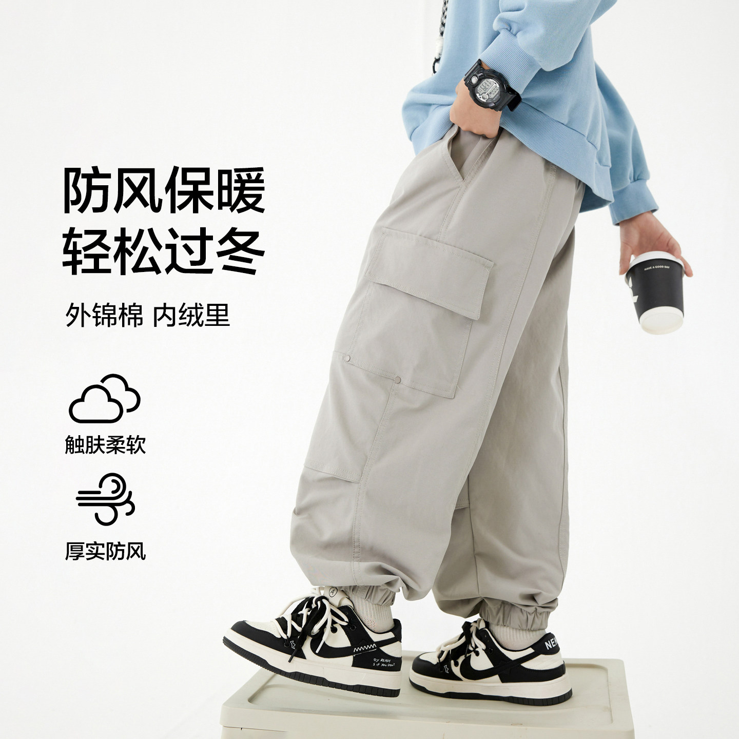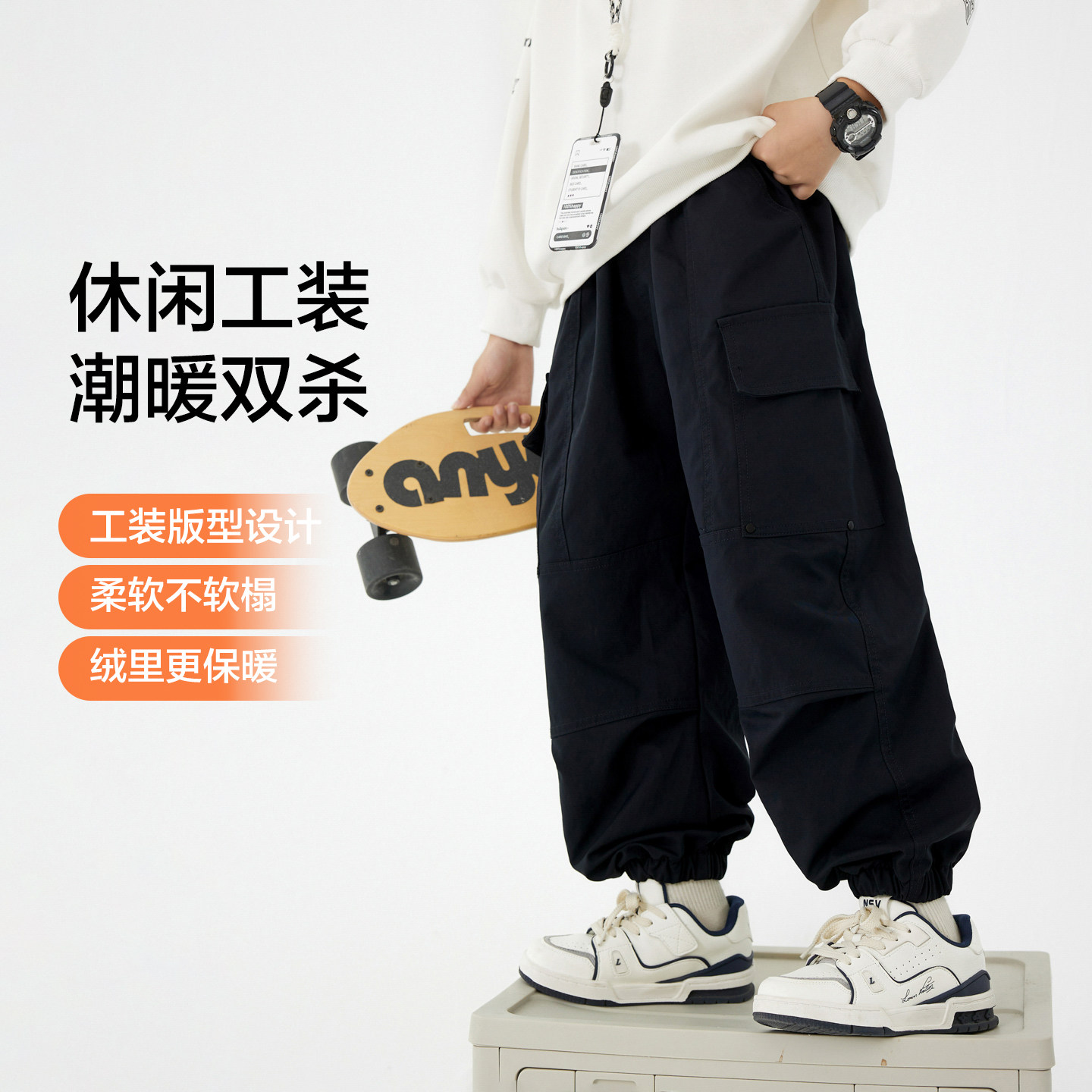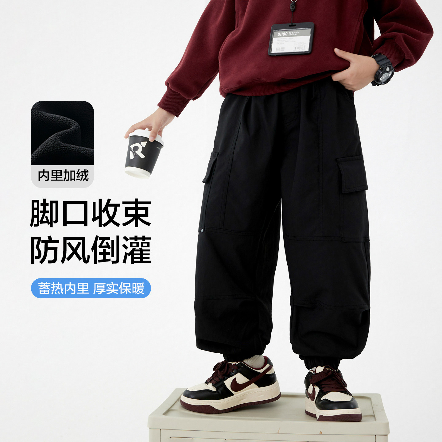 男童秋冬户外加绒冲锋工装裤2025新款青少年儿童加厚宽松防风裤子