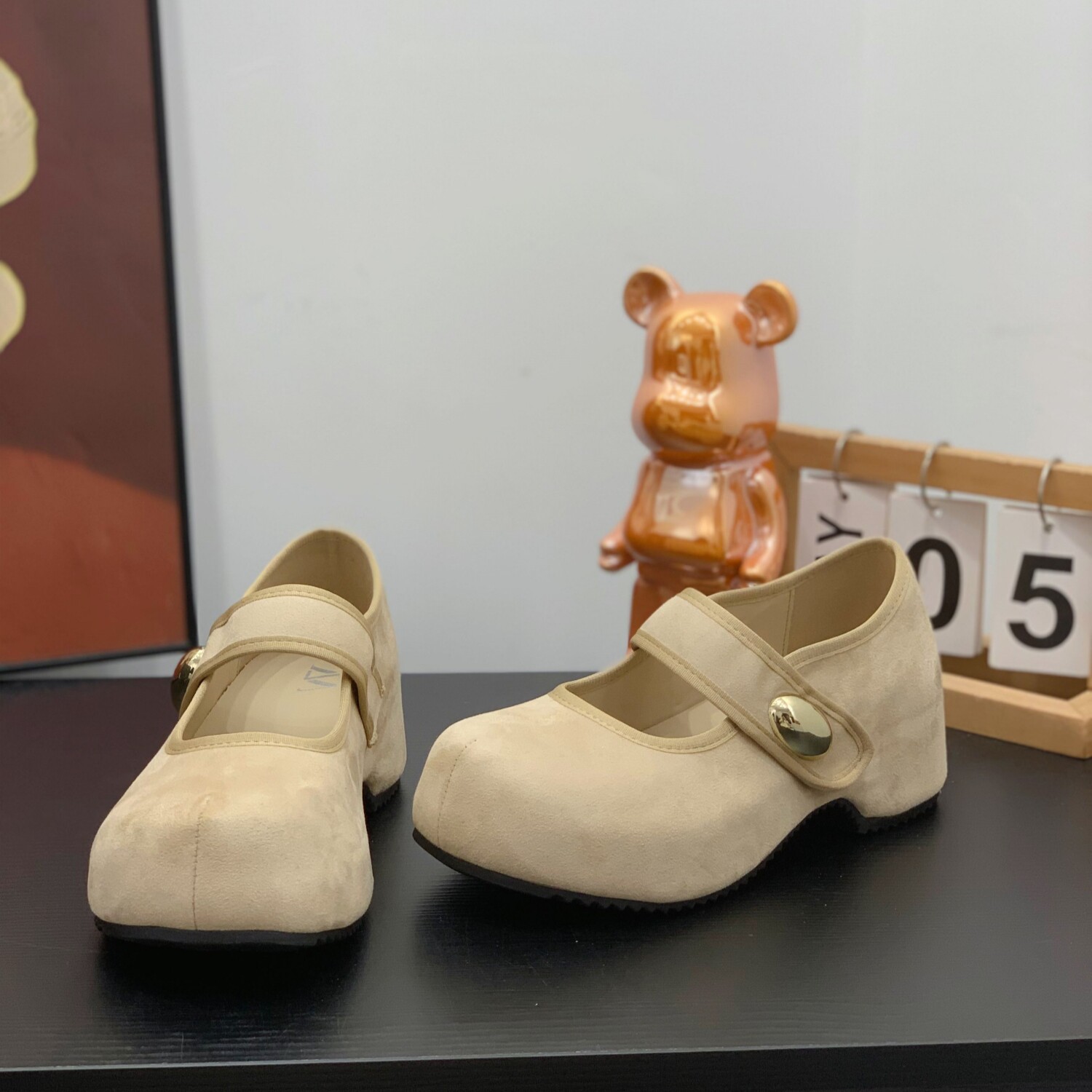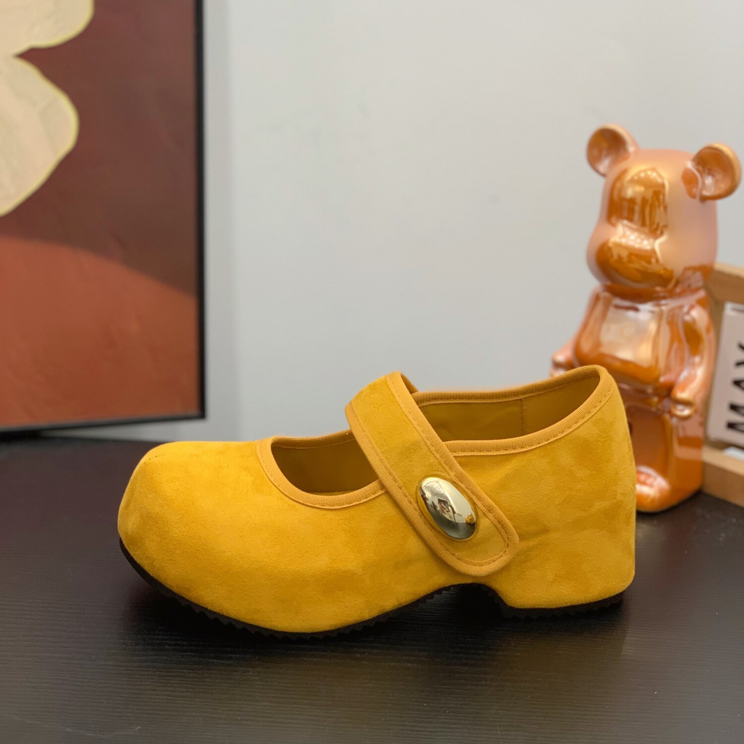 内增高魔术贴一字带玛丽珍鞋女2026春新款丑萌大头浅口绒面勃肯鞋