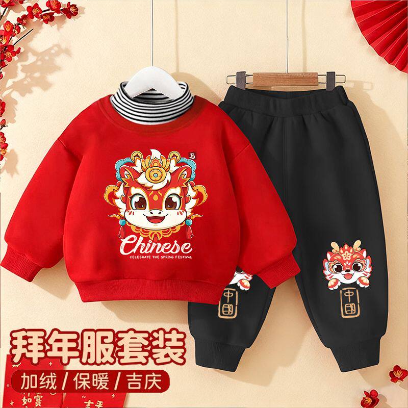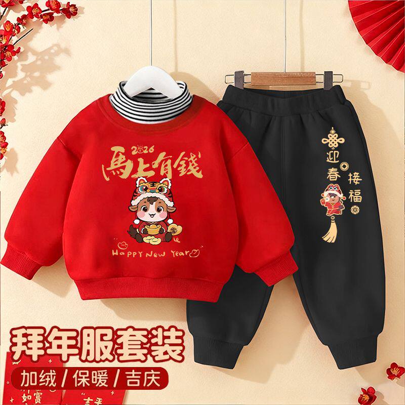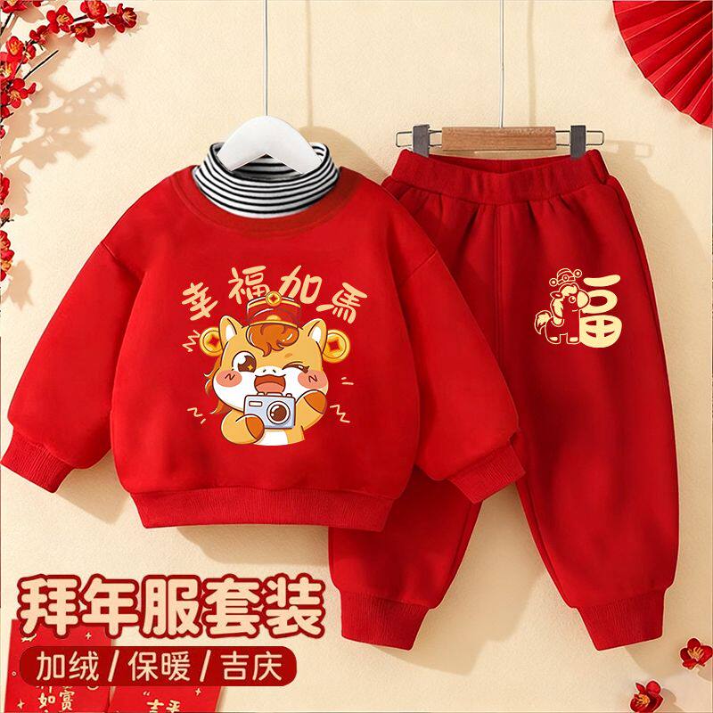 男女童拜年服套装2026马年宝宝高领卫衣卫裤儿童加绒秋冬装两件套