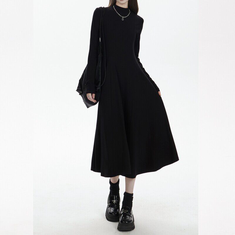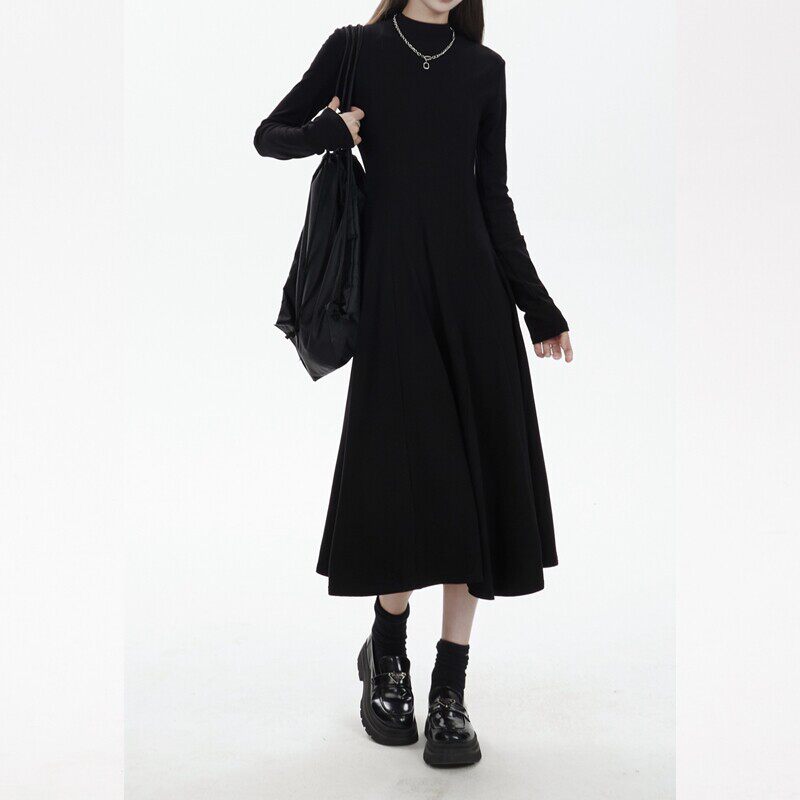 黑色长袖连衣裙女小个子简约百搭2025秋冬半高领内搭中长款裙子