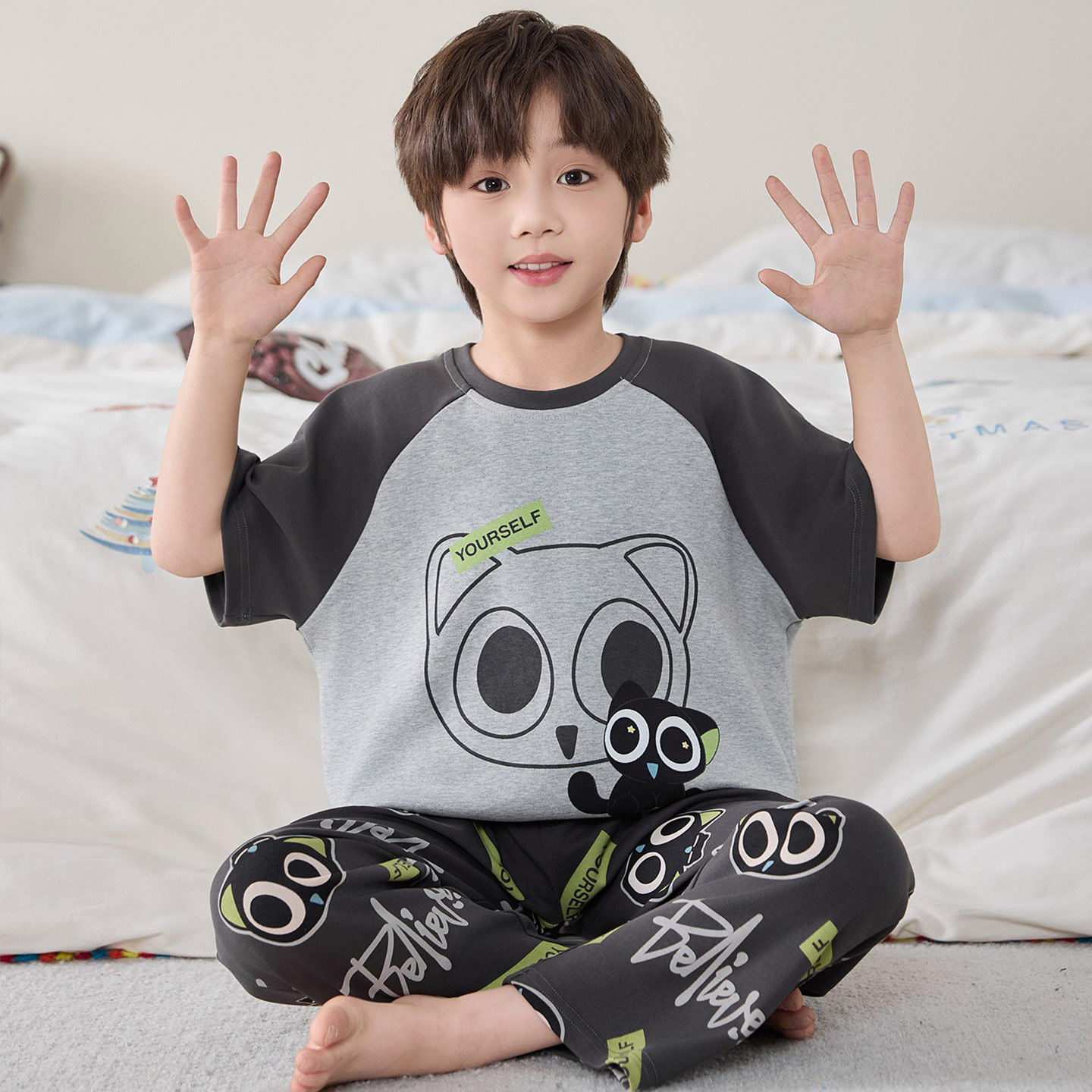 纯棉儿童睡衣夏季男童短袖圆领套装男孩长裤青少年条纹卡通家居服