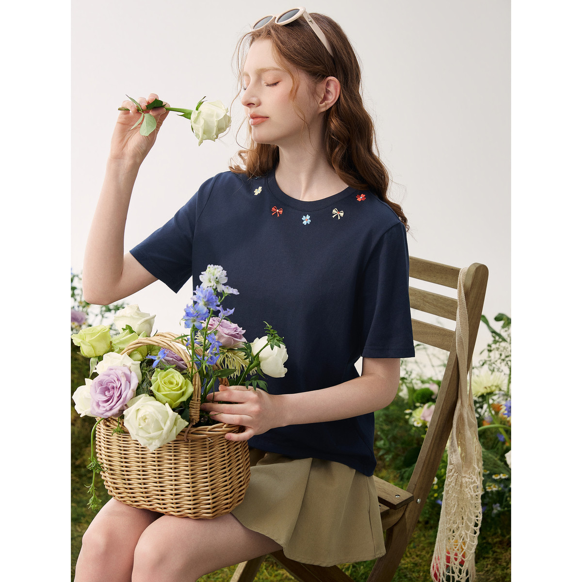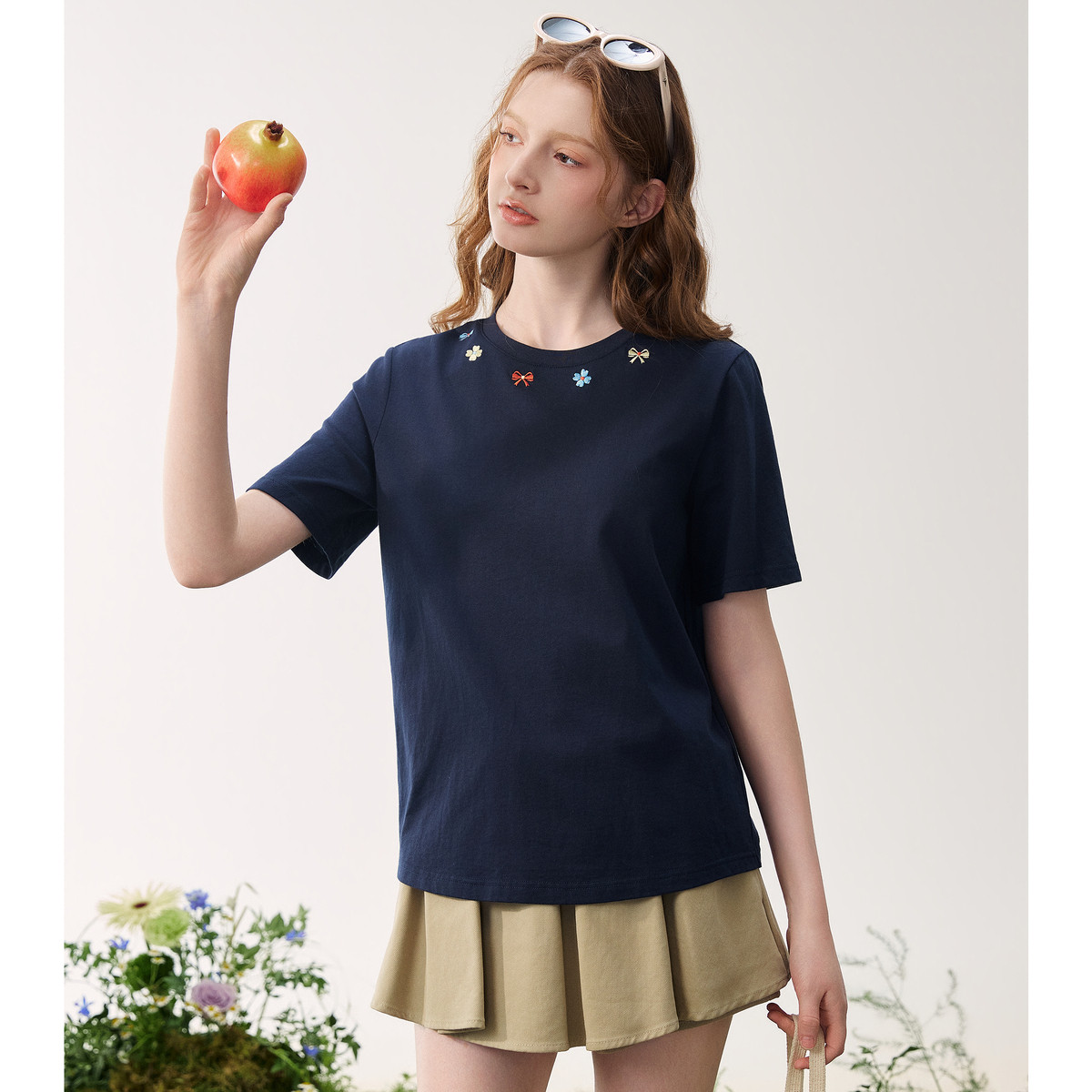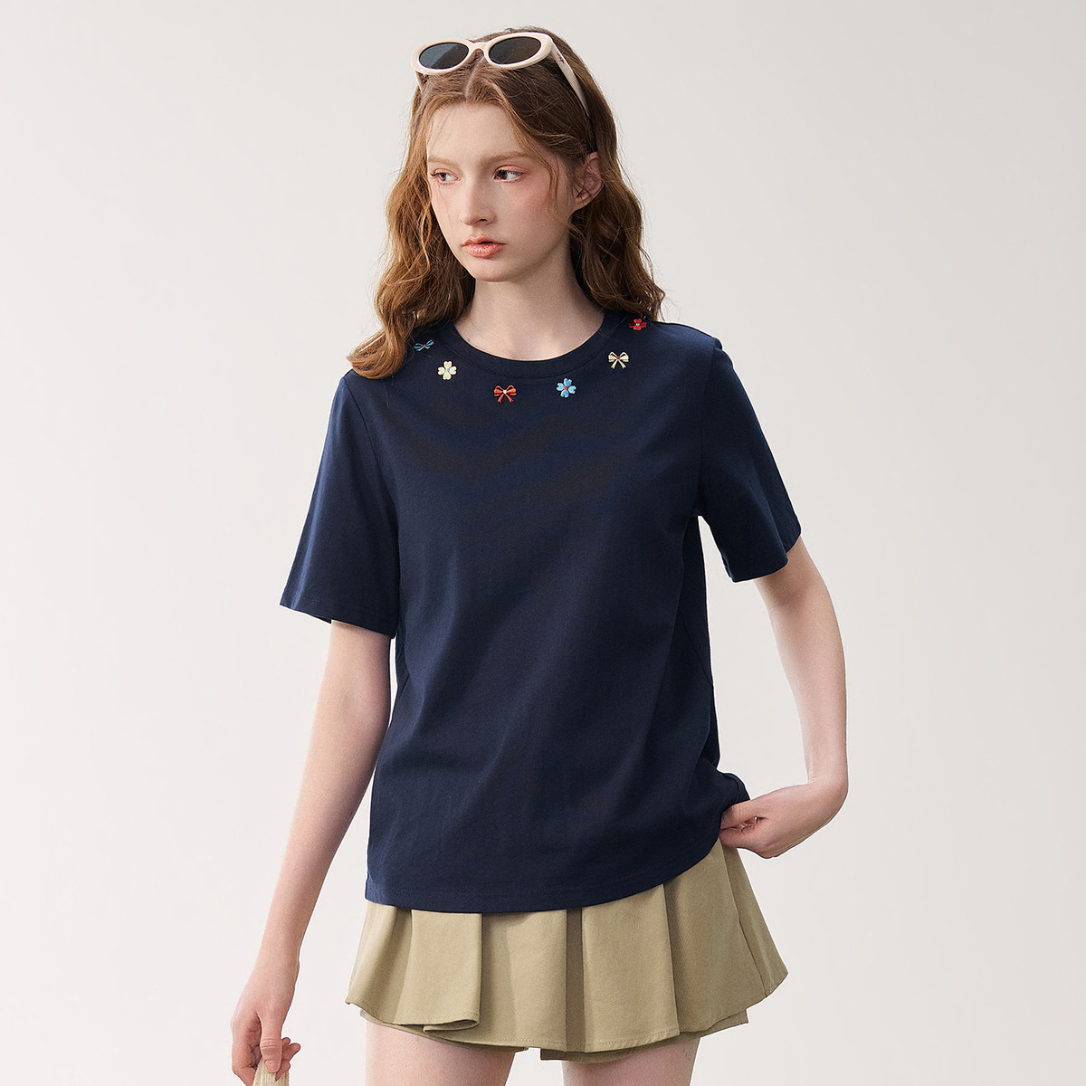 唐狮2026夏季新款女短袖T恤圆领藏青色纯棉别致设计感正肩上衣潮