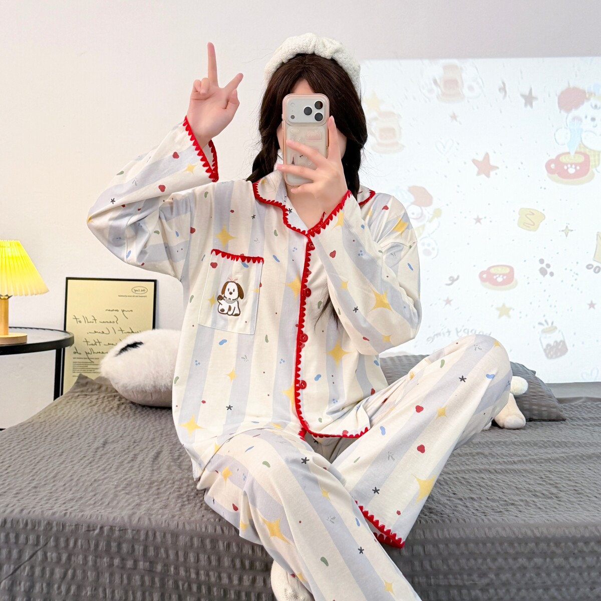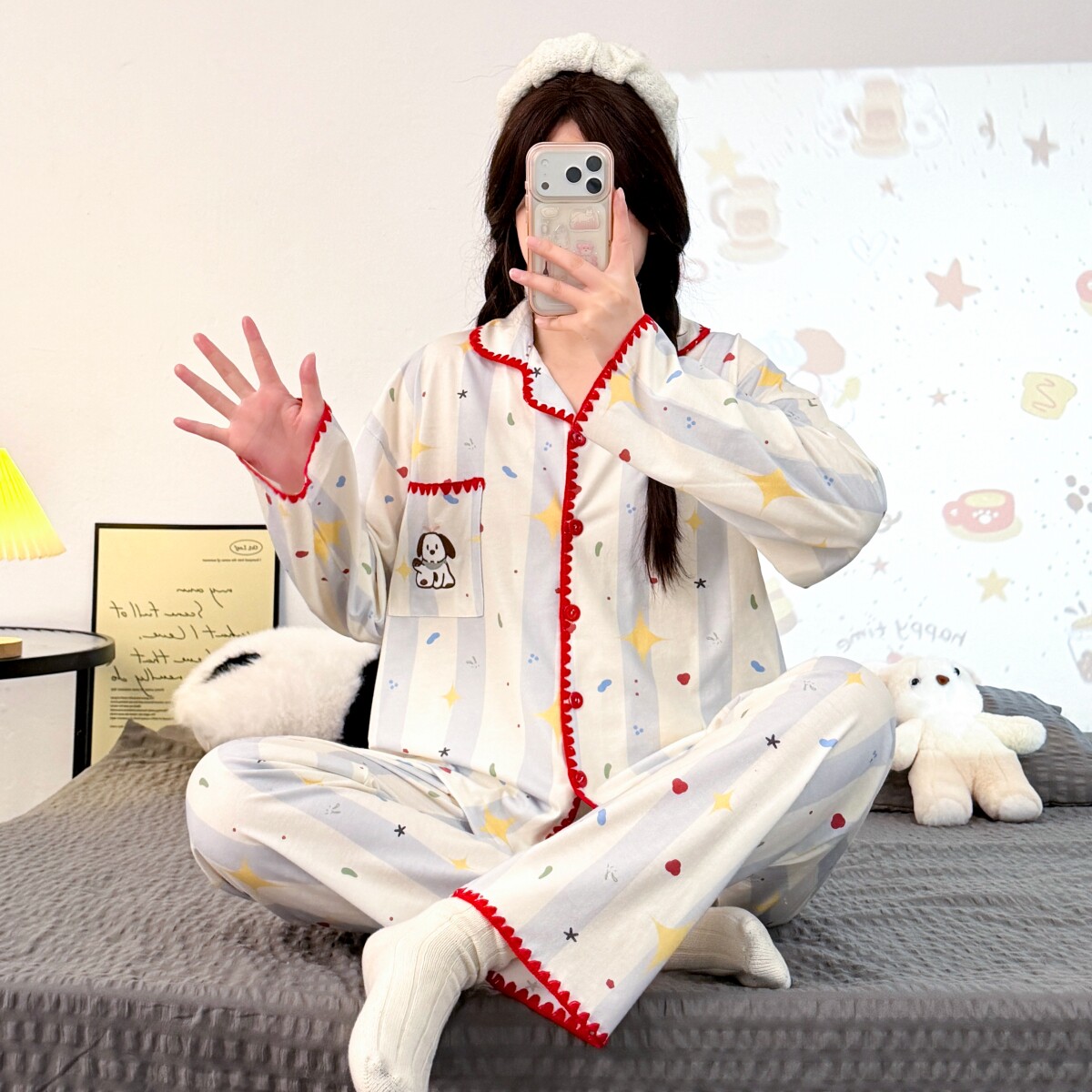 卡通条纹纯棉睡衣女款春秋季天2026新款长袖长裤可外穿家居服套装
