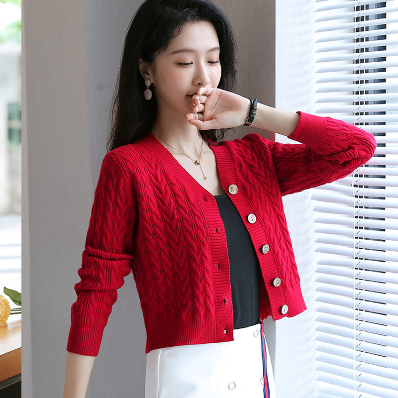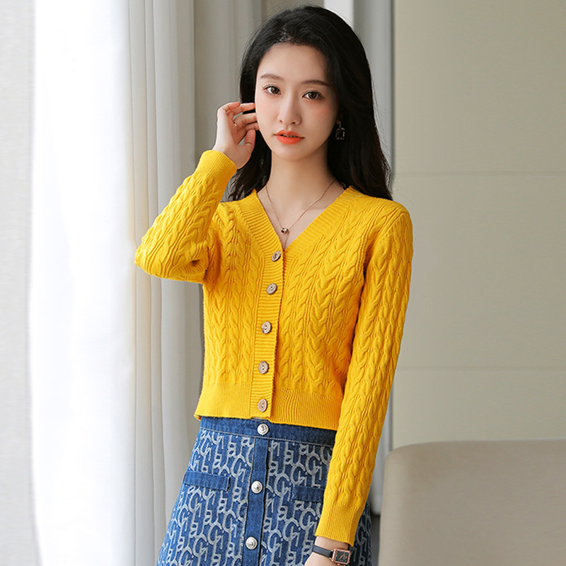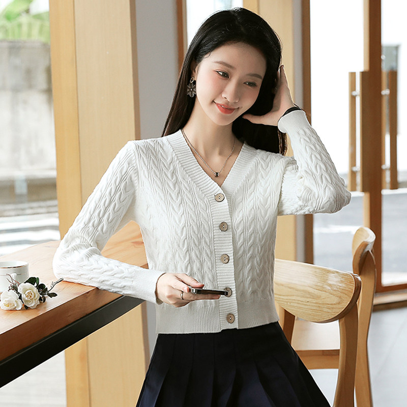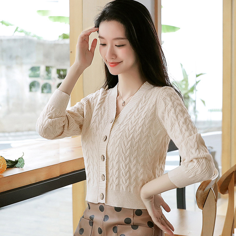 短款毛衣外套女加厚秋冬2024新款高腰V领上衣小个子修身针织开衫