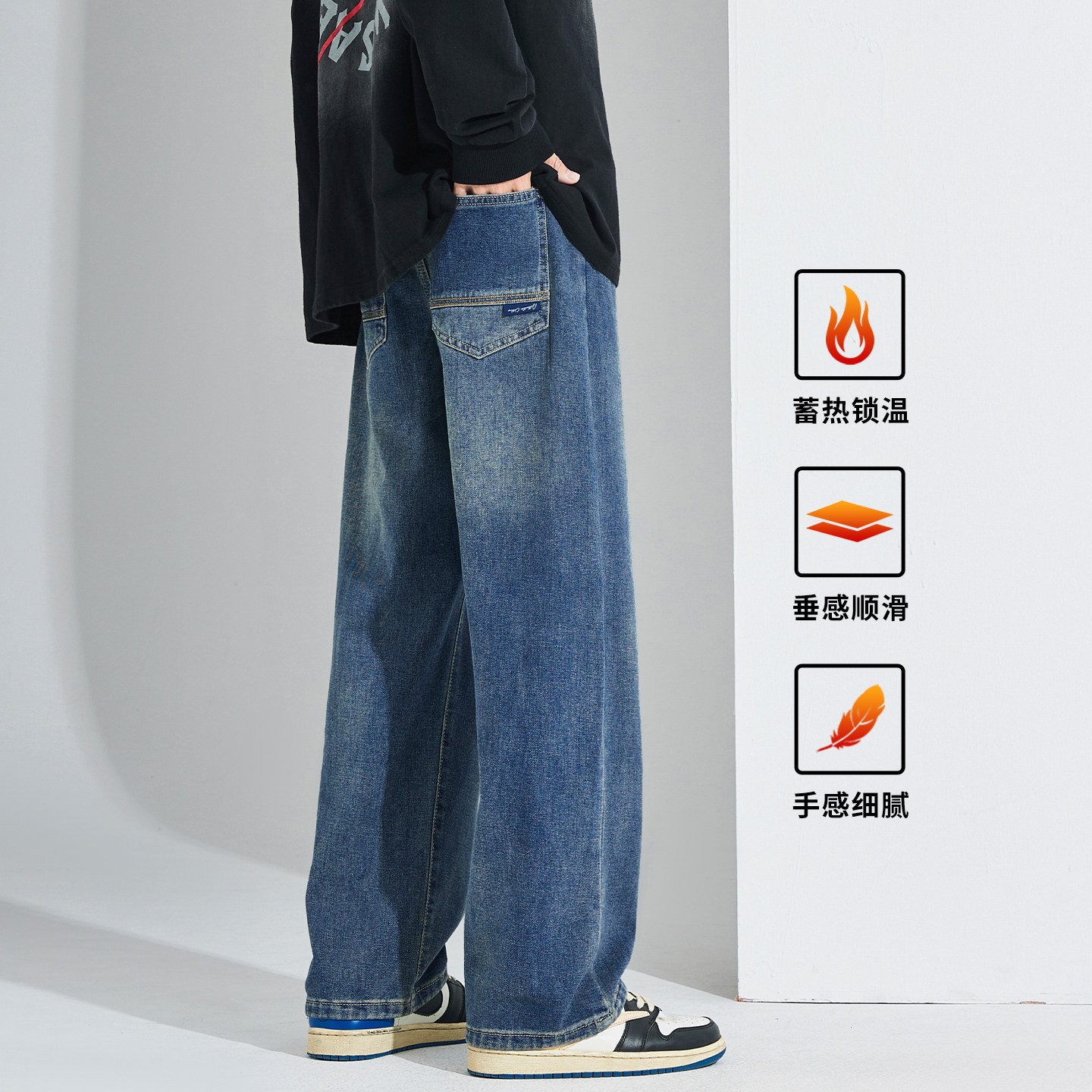 秋冬加长牛仔裤男款美式街头青少年加绒vibe直筒宽松复古阔腿裤子