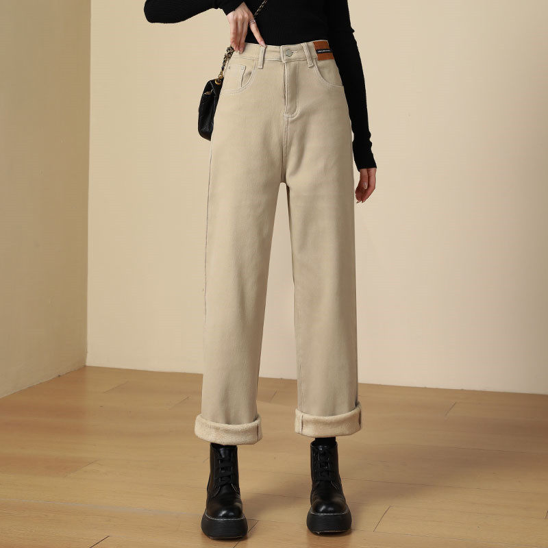 加绒牛仔裤女阔腿2025秋冬季加厚冬天外穿高腰卡其色米色直筒裤子