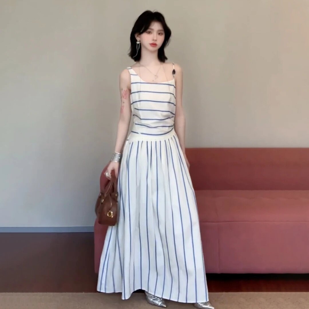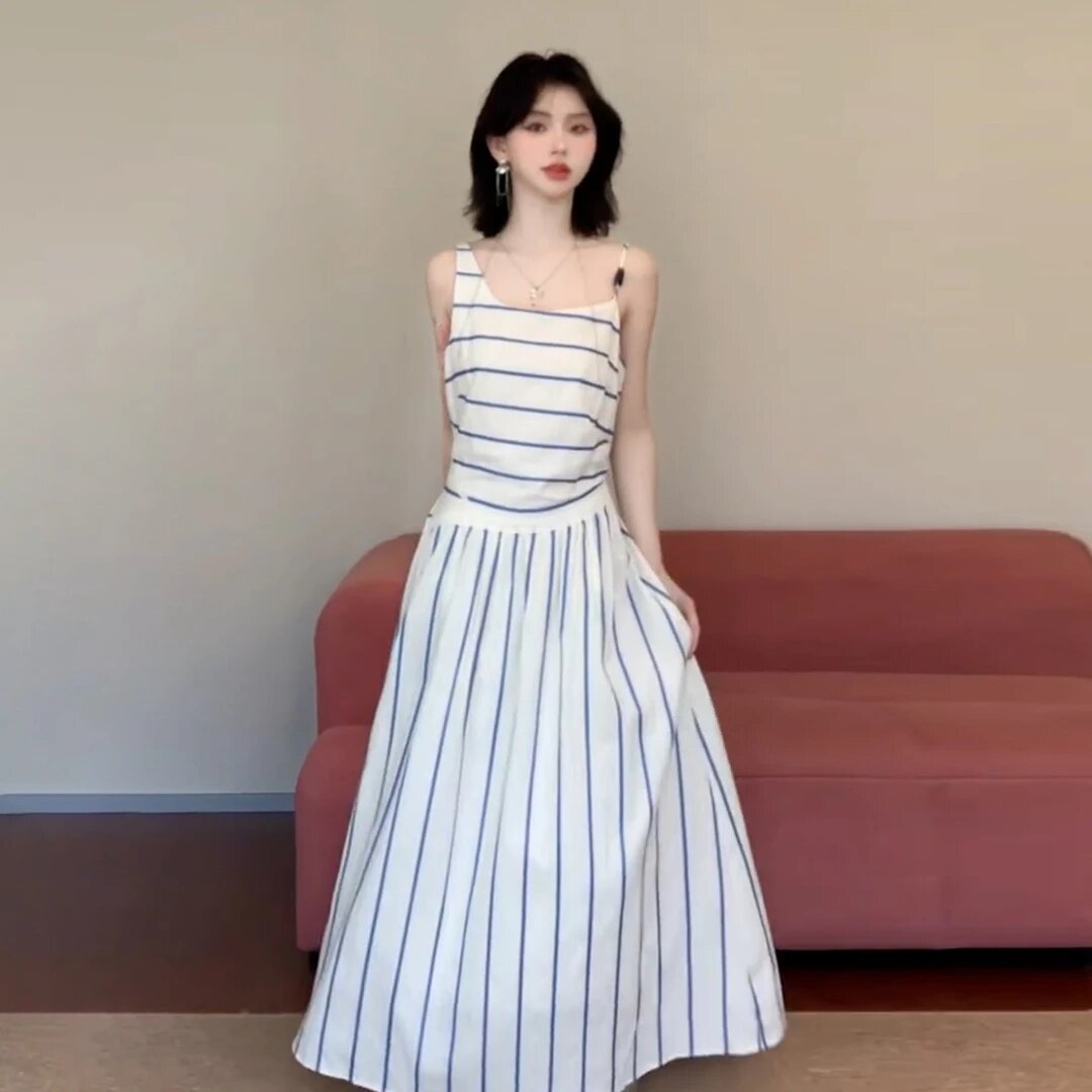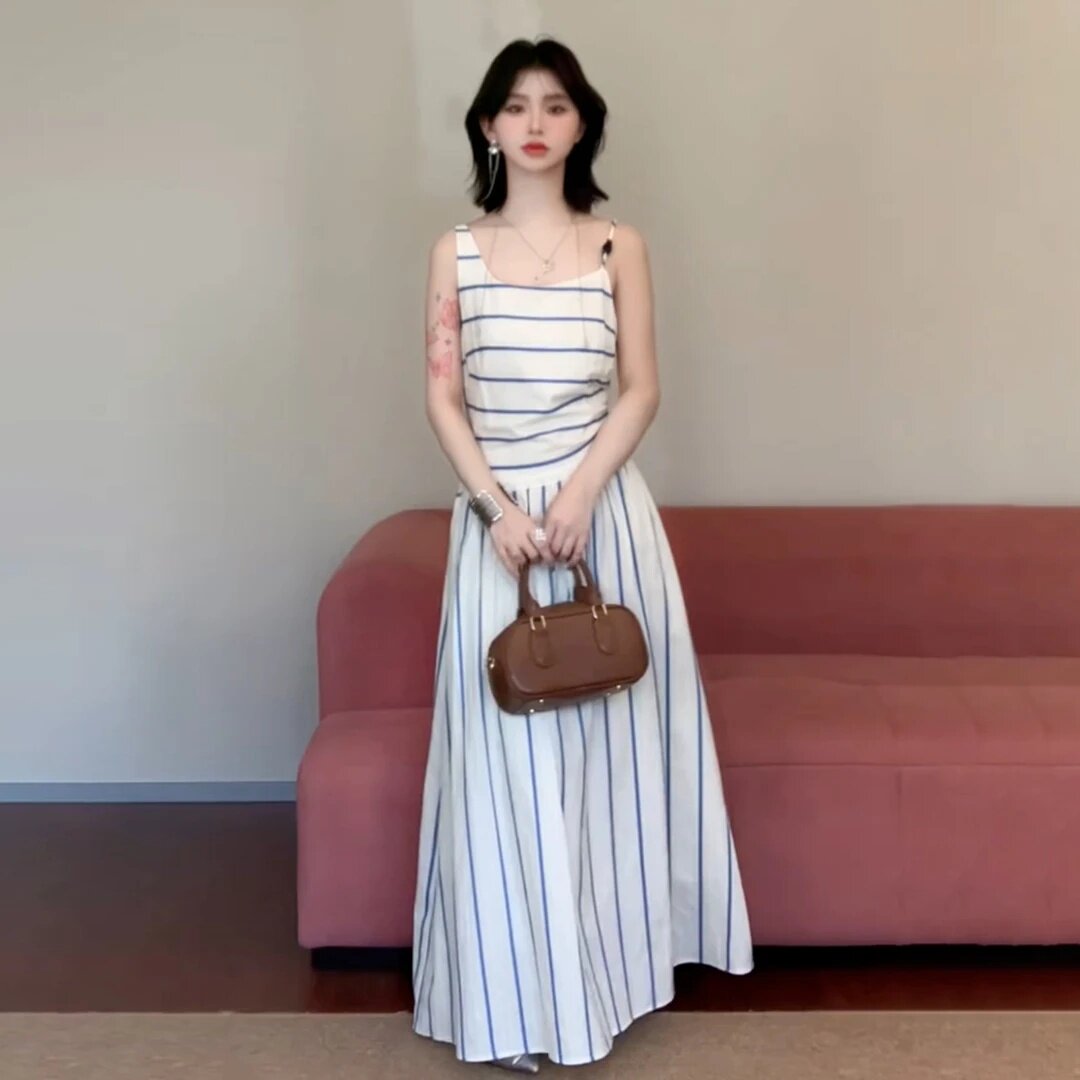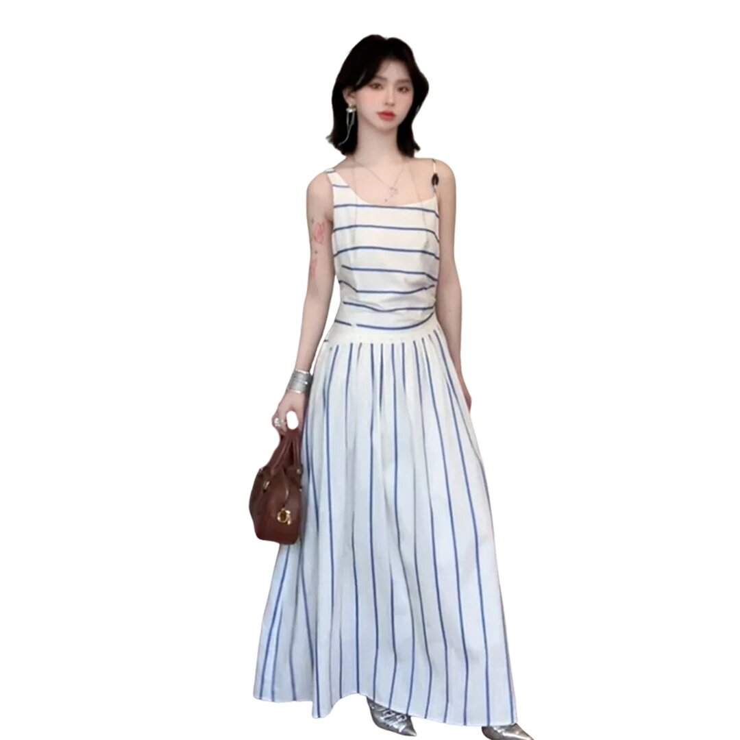大码胖mm法式气质白色条纹吊带连衣裙女海边度假气质收腰显瘦长裙