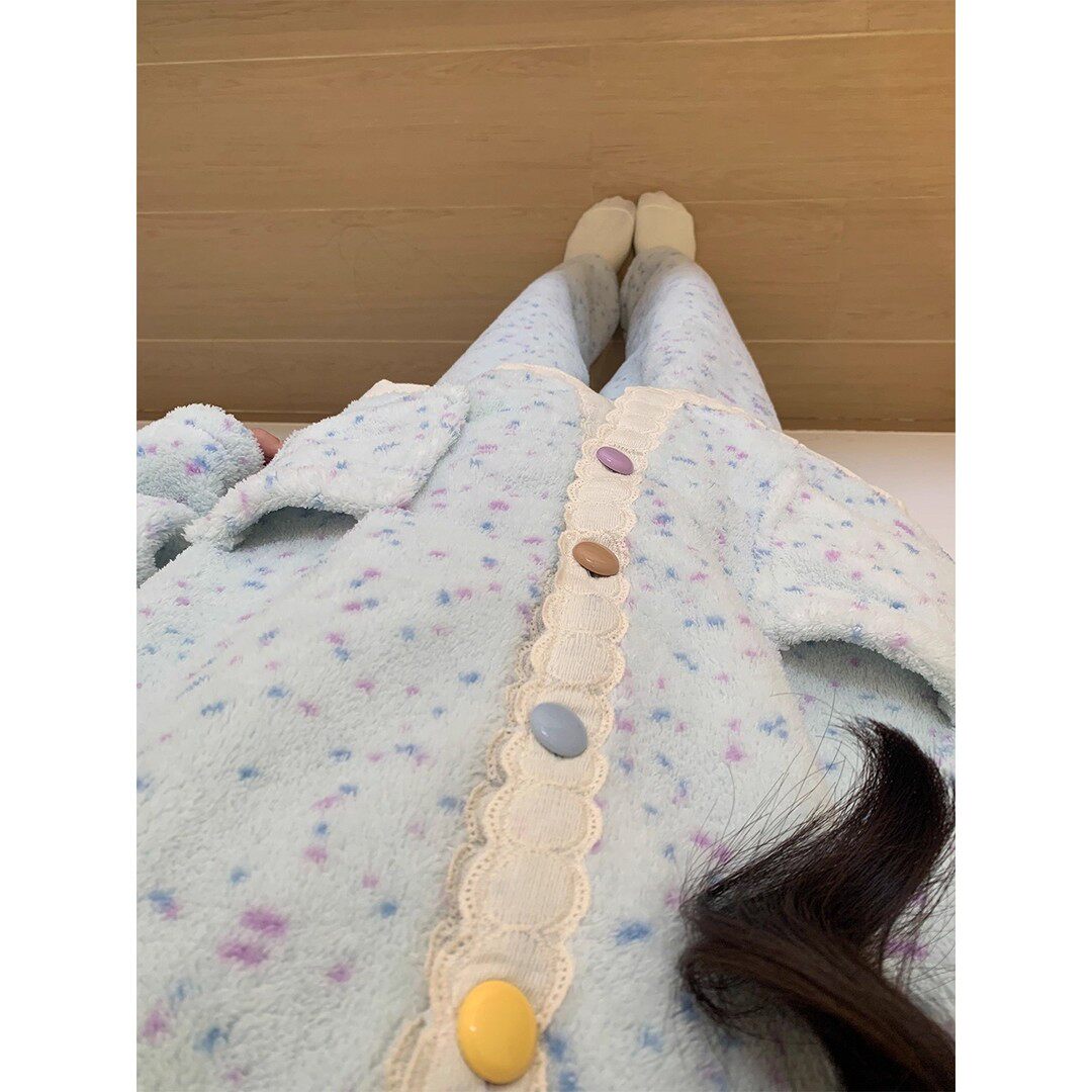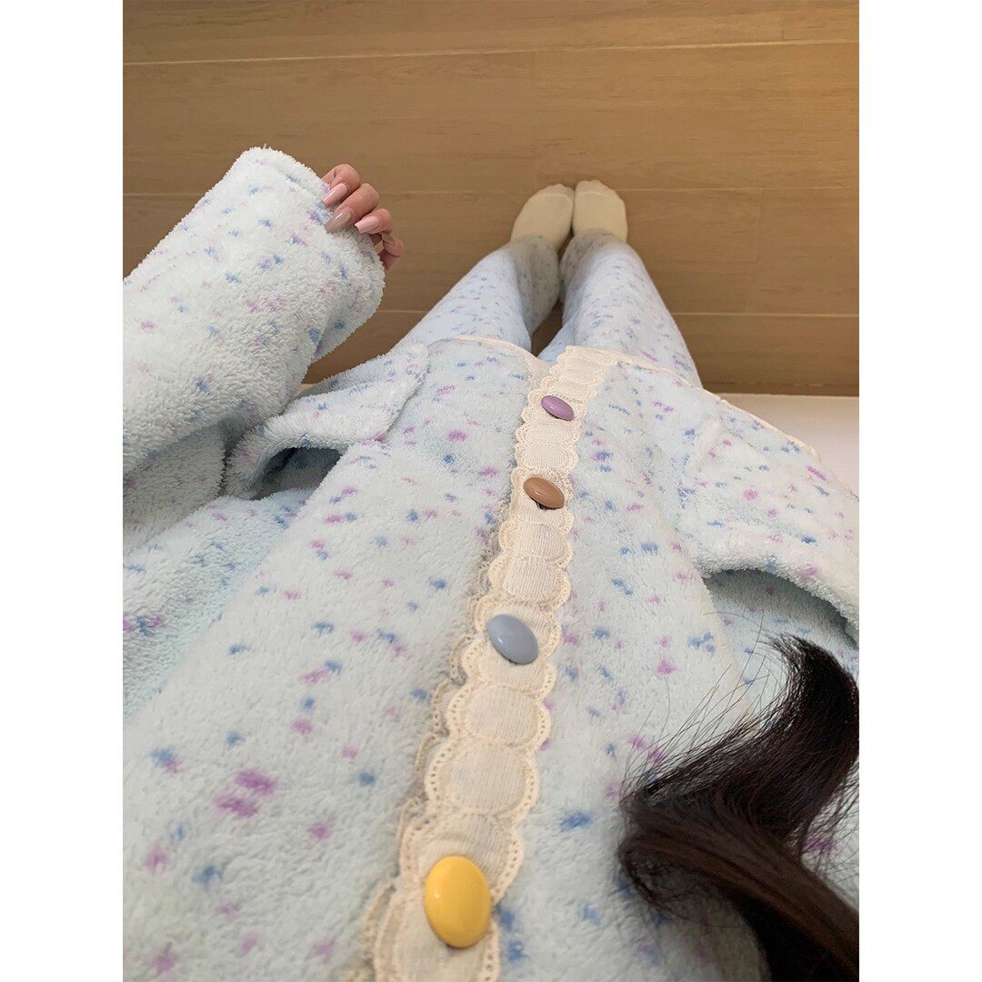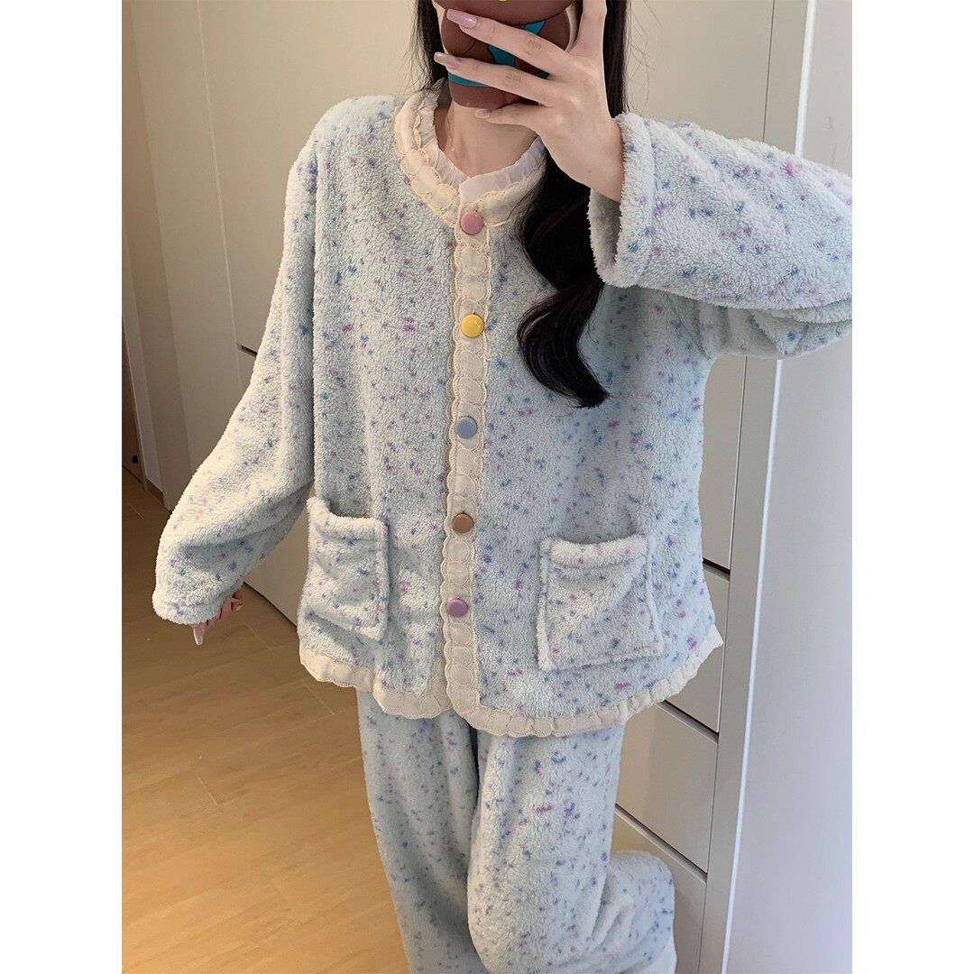 半边绒睡衣女秋冬季珊瑚绒加厚加绒可爱花边小个子外穿家居服套装